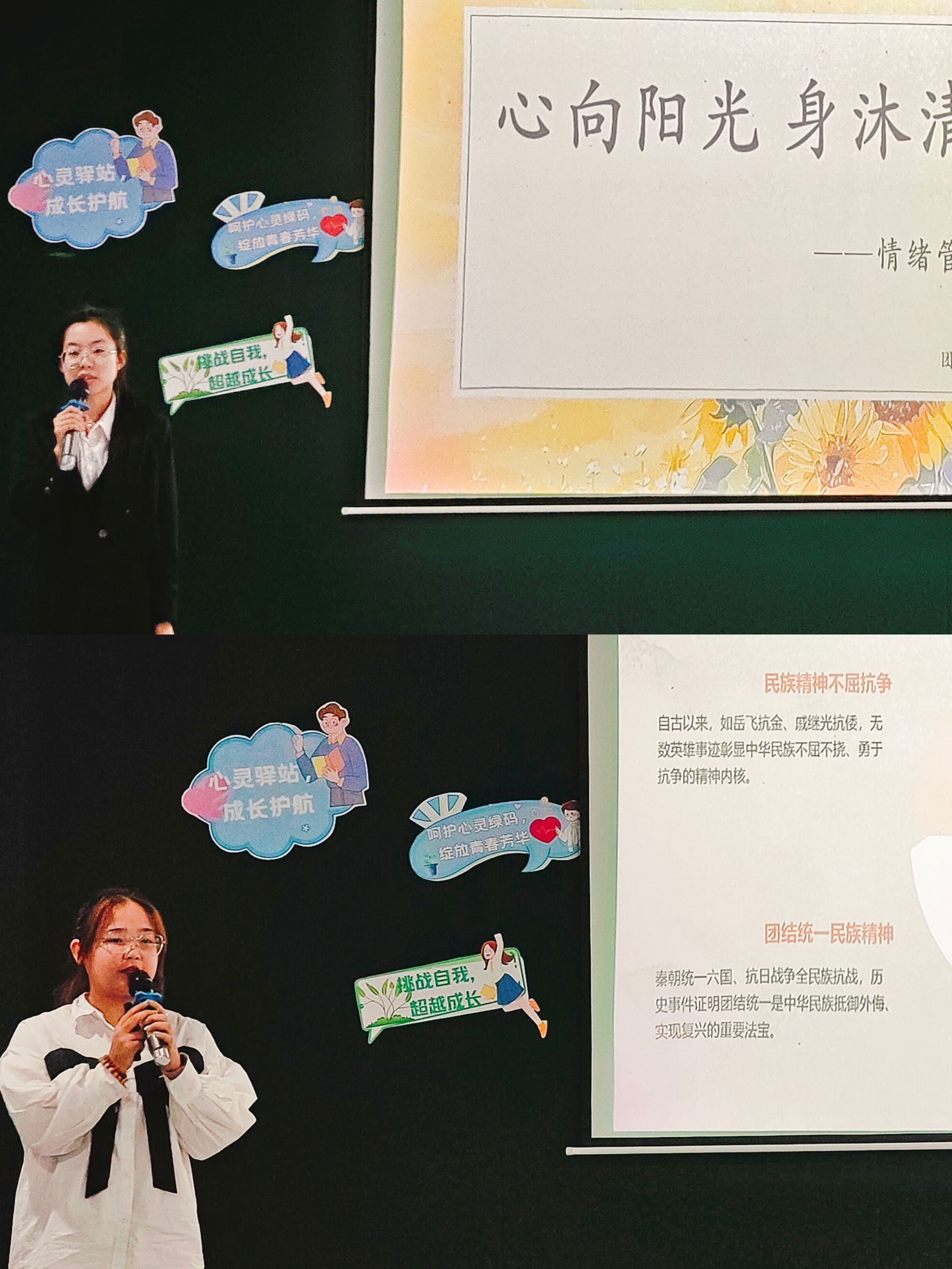 活动之初,主持人详细介绍了本次心理成长微课院内初赛的比赛规则和评分标准,强调本次微课比赛围绕“学史增信”“榜样的力量”及“生命教育与心理成长”三大主题展开,以生动、完整的教学活动形式呈现,确保内容的丰富性和教育性。比赛现场气氛热烈,来自学院各年级的6支团队都精神饱满、意气风发。首先上场的是泛舟听风吟队的同学,她从一位嫌疑人的自述引入课题,从不同角度分析了“情绪”,用互动的形式加强了同学们对“情绪”的理解,并且让同学们能够正确化解负面情绪。她以“生命是一场更珍贵的旅程,而情绪是其中的风雨”作结,深入浅出地分析了压力管理和情绪调控的策略。紧接着,柏通队的同学从青春热血和民族精神两个方面进行了讲述,她提到民族精神可挽救一个国家,并且指出民族精神的重要性。