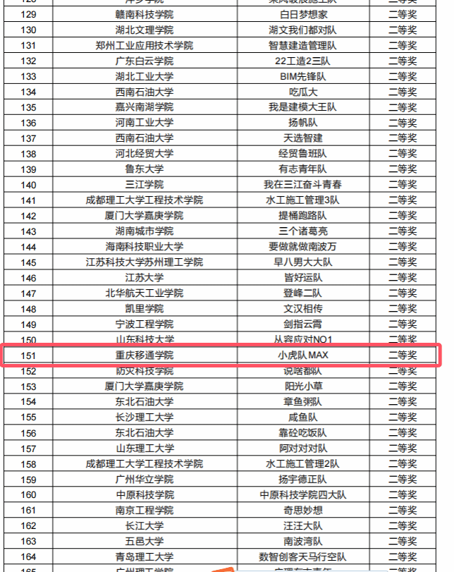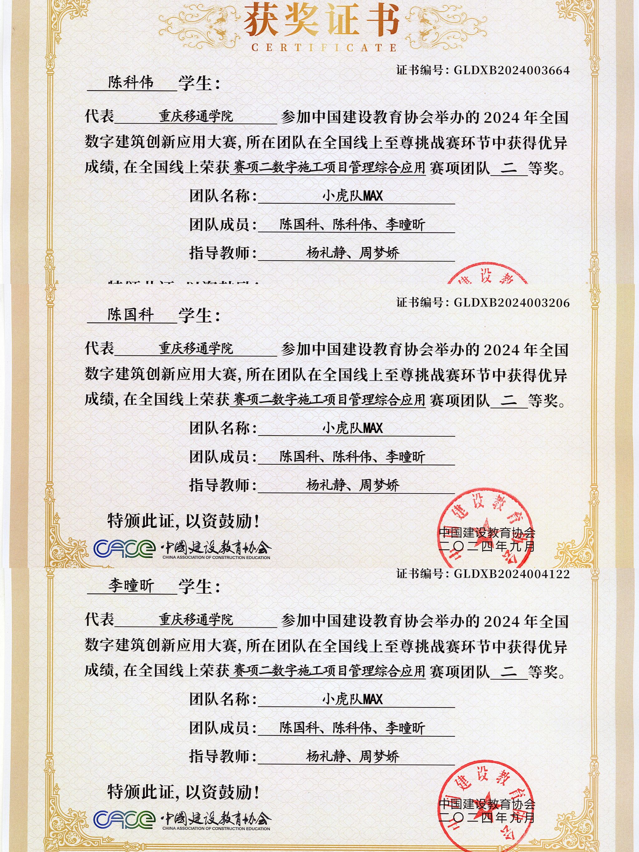 自2004年6月大赛通知以来,工程管理专业师生积极组队,在暑期积极组织队伍报名、备赛,9月组织校内选拔赛,最后优选出7只队伍参加参加全国选拔赛,到十月份“小虎队MAX”通过选拔赛进入全国总决赛,最终在全国总决赛中荣获数字施工项目管理综合应用赛项二等奖的佳绩。