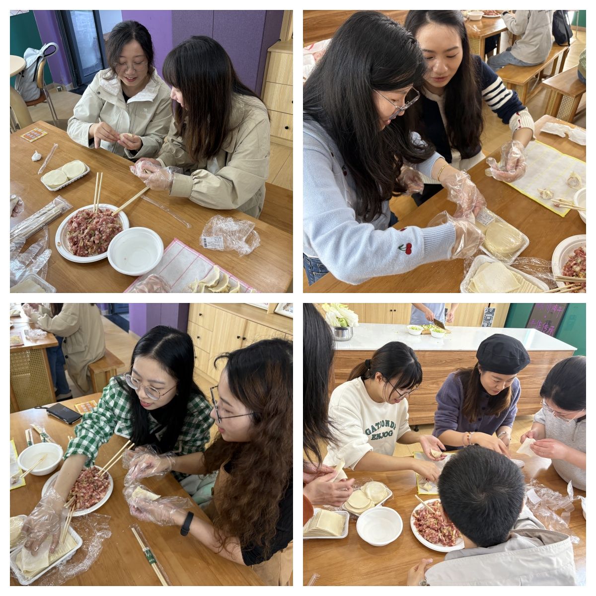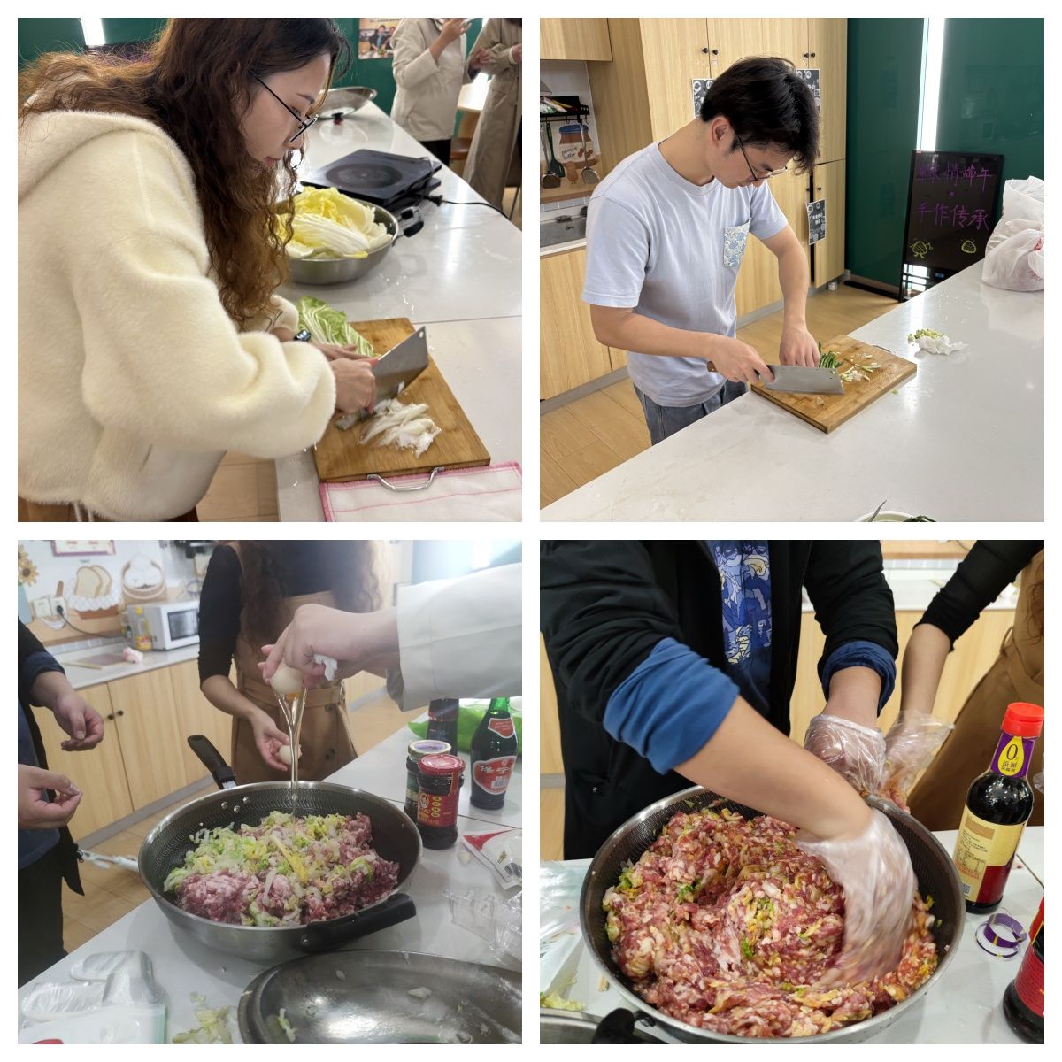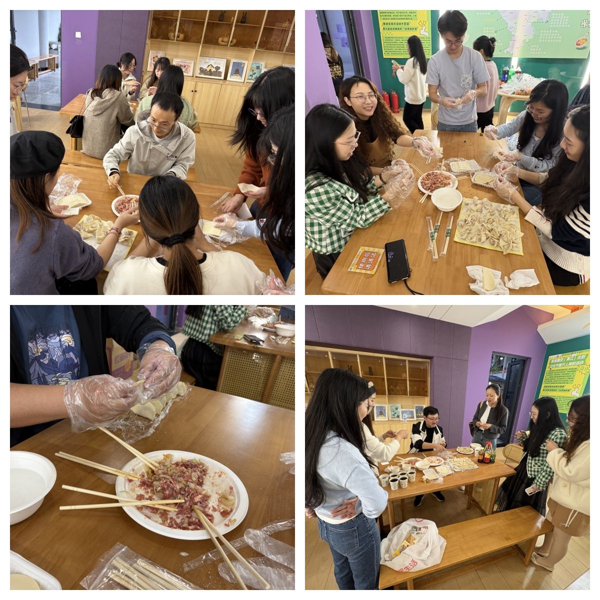 活动开始前,参与活动的老师首先围绕如何调制饺子馅料和佐料展开了激烈的讨论。在大家群策群力中,完成了馅料的调制。在包饺子环节,徐俊颀老师为大家展示了她自创的饺子新造型;张淇凯老师耐心地指导周围的老师们如何使饺子边缘紧实、包得更为漂亮。他细致地解释了饺子皮的包法、馅料的适量放置以及手指的用力技巧。教学副院长王哲老师兴致勃勃地分享了自己在北方家乡的包饺子经验;院长刘贵容老师也向大家分享了自己独特的包饺子小窍门。