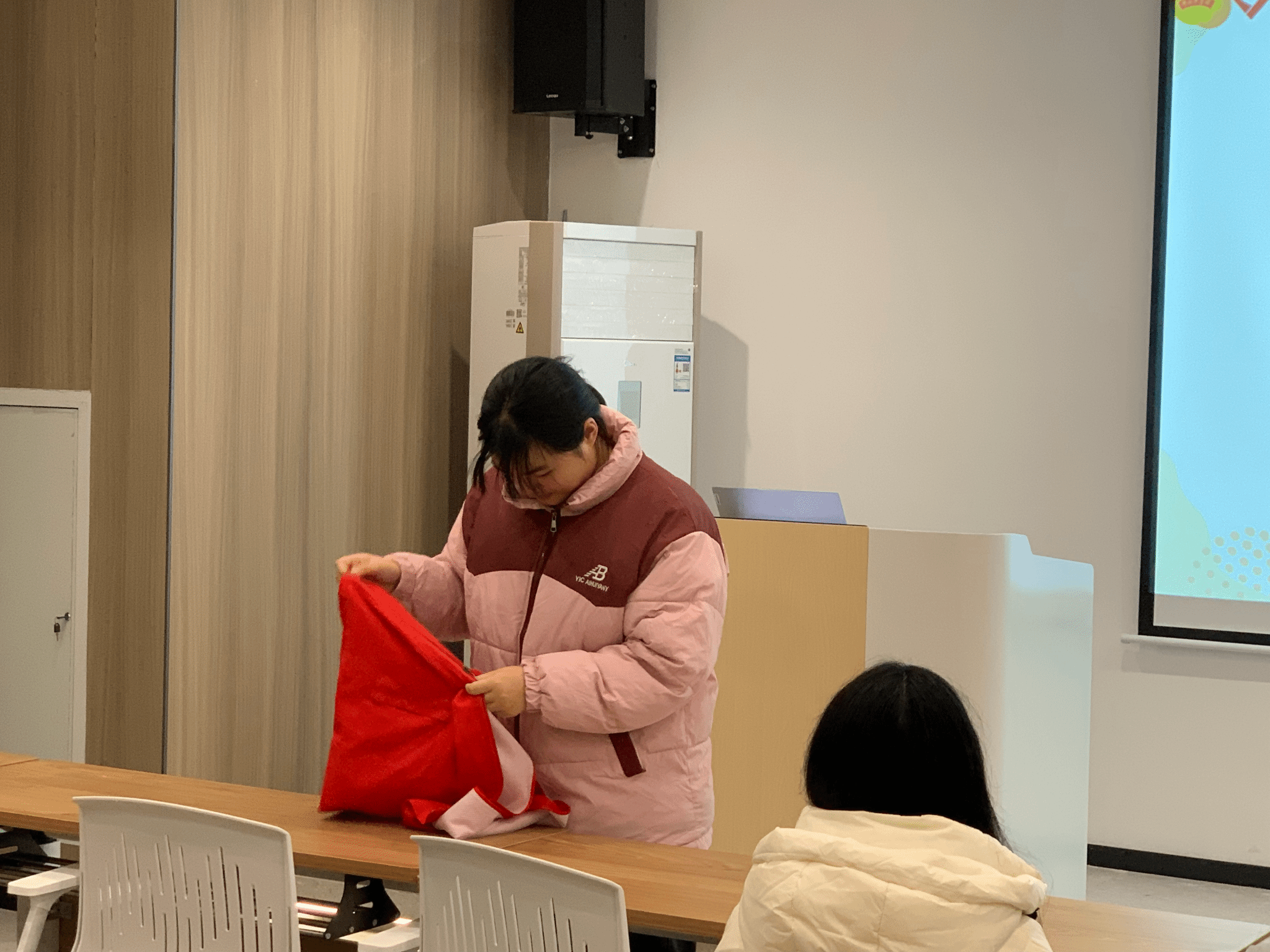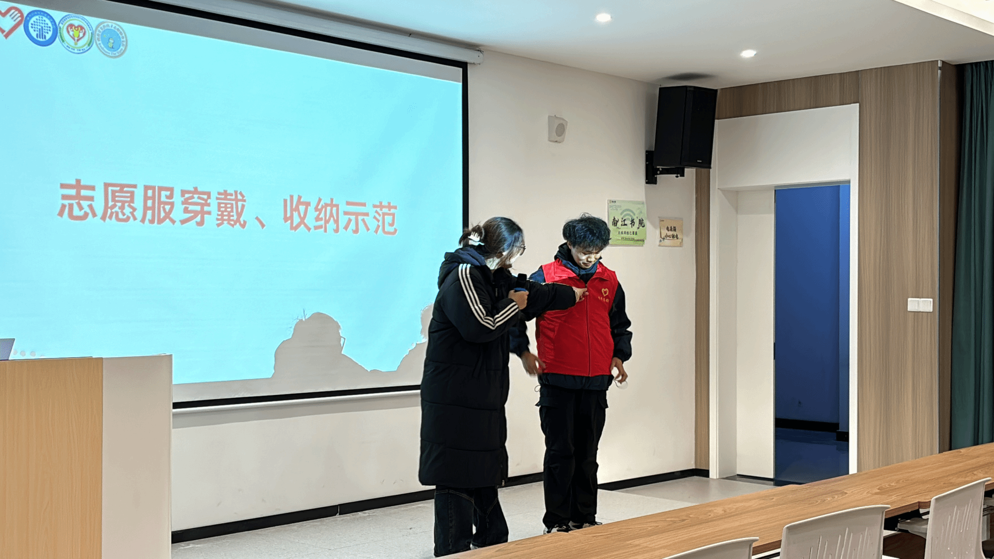 特别值得一提的是,此次会议有幸邀请到青年志愿者联合会项目孵化部部长徐梦亲临现场。徐梦部长亲自示范了志愿服的正确穿戴方式,从每一个细节入手,如马甲的整理、徽章的佩戴位置等,都进行了详细的讲解与演示。随后,支队新成员们积极踊跃地参与到志愿服穿戴的实践环节中,并在徐梦部长与支队干部们的悉心指导下,进行展示与纠正,确保每一位志愿者都能熟练且正确地穿戴志愿服,展现出志愿者的专业形象。