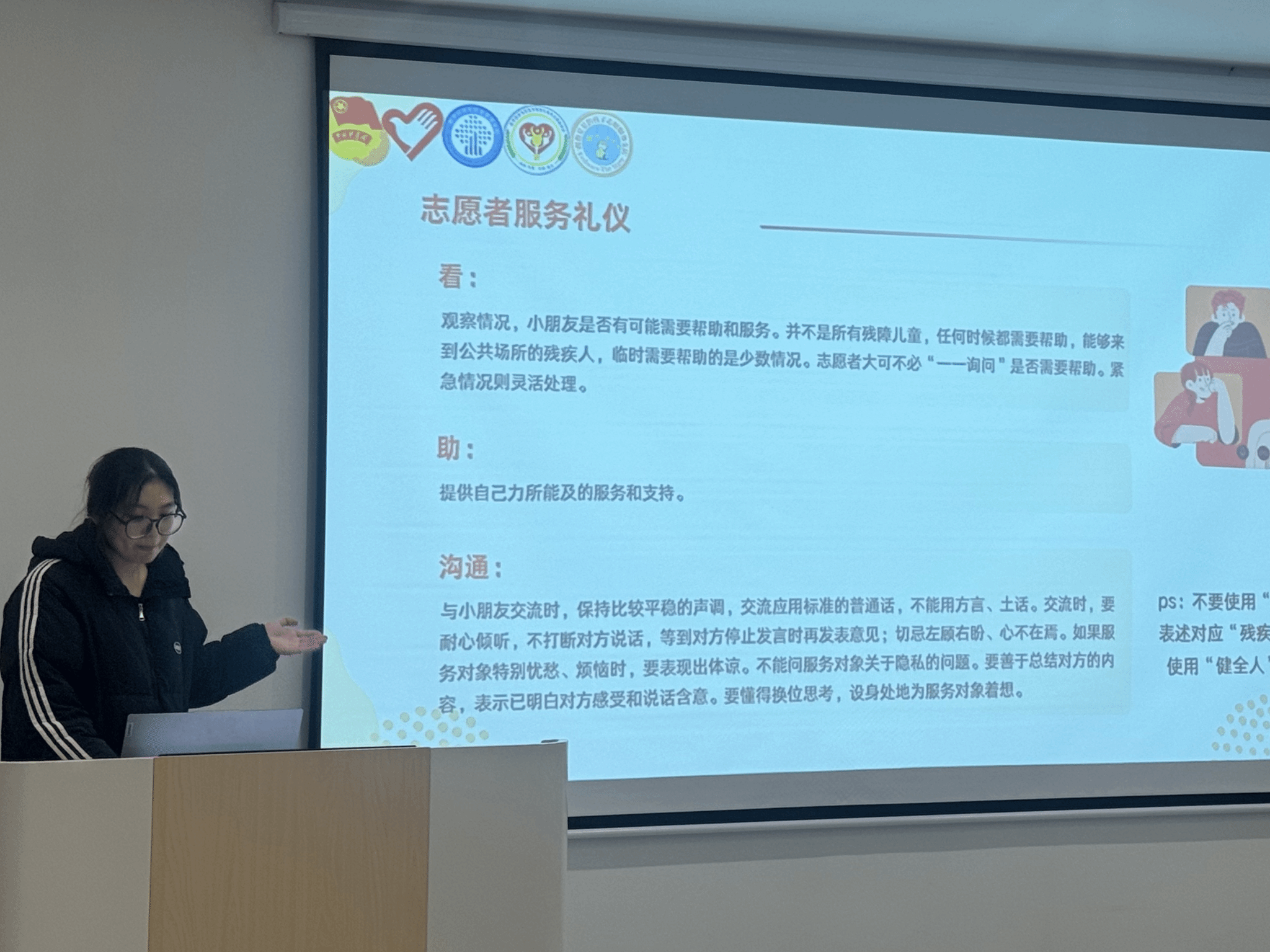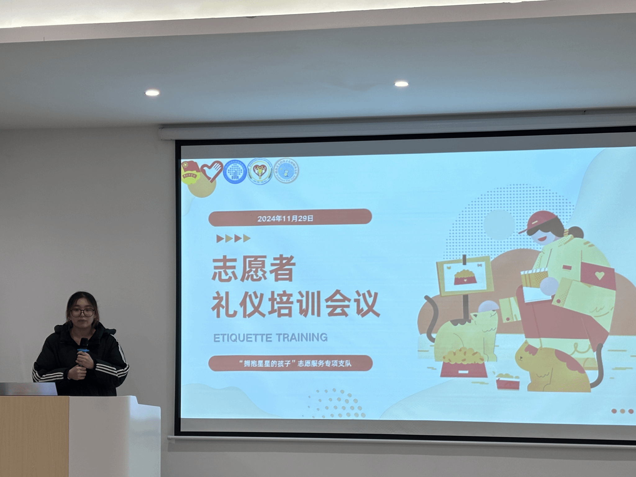 为彰显志愿者的良好风范,塑造规范且亲和的志愿服务形象,“拥抱星星的孩子”志愿服务专项支队于2024年11月29日20时,在南江书院审问·启迪思维学堂开展了“培训礼仪,扬志愿风采”志愿者礼仪培训会议。此次会议聚焦志愿服务礼仪的核心要点,通过理论讲解与实践演练相结合的方式,为志愿者们传授了实用的礼仪知识与技巧,致力于培育出一批满怀爱心、耐心、细心且举止优雅、言行得体的志愿者队伍,成果显著。