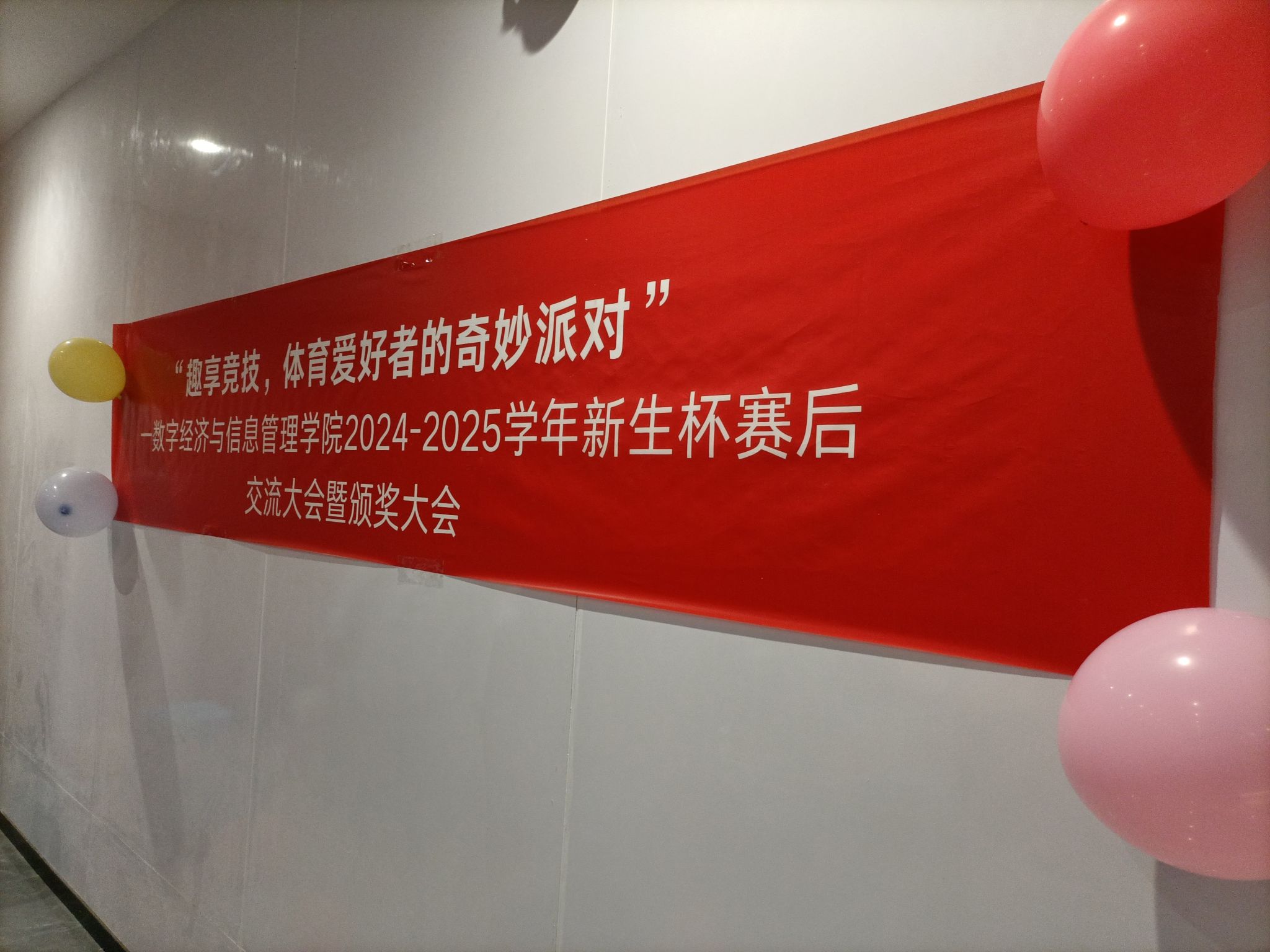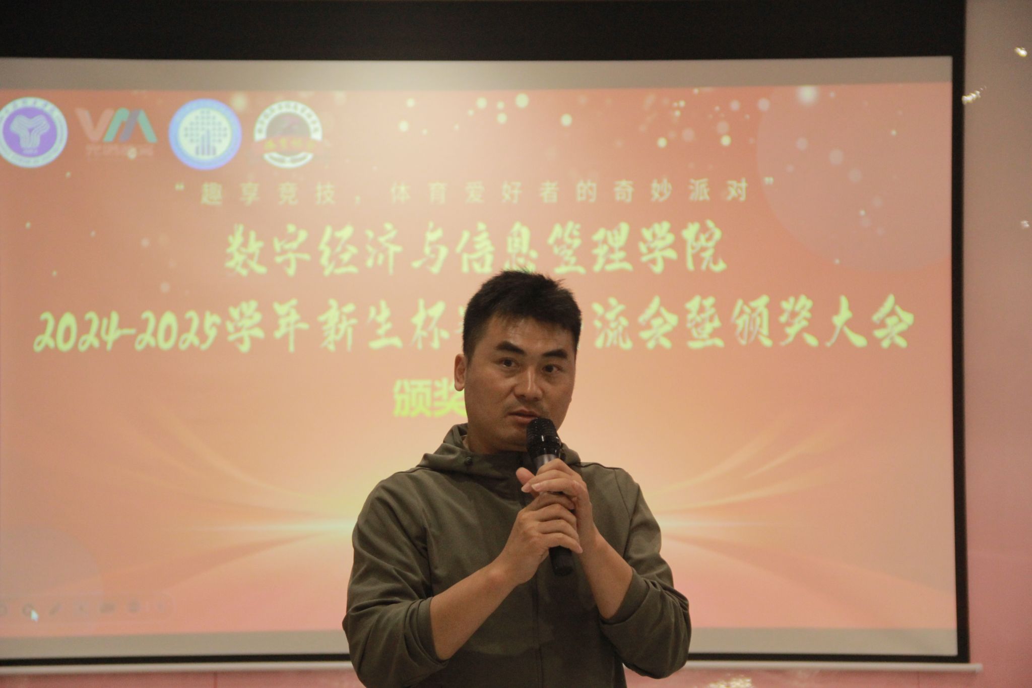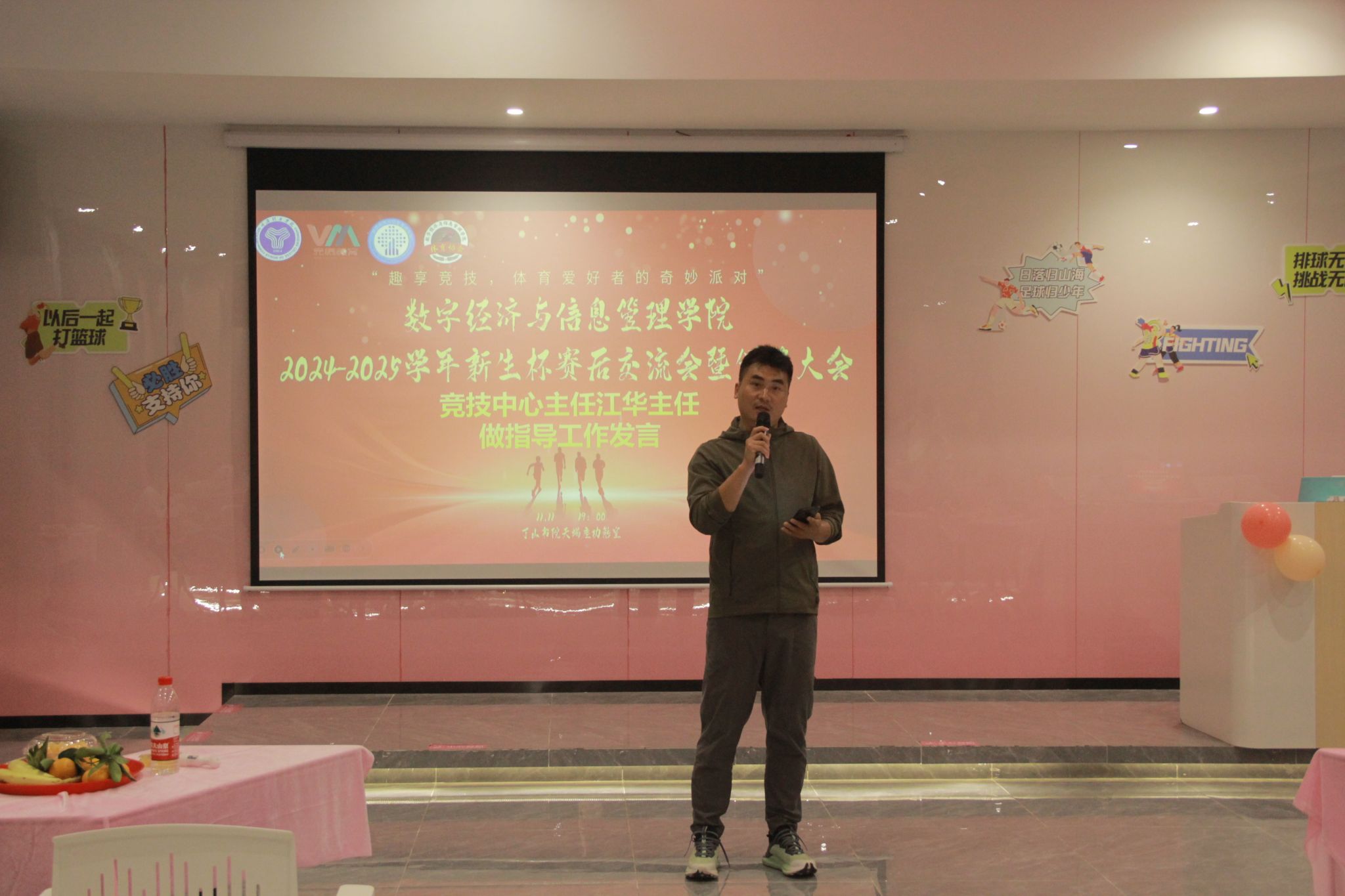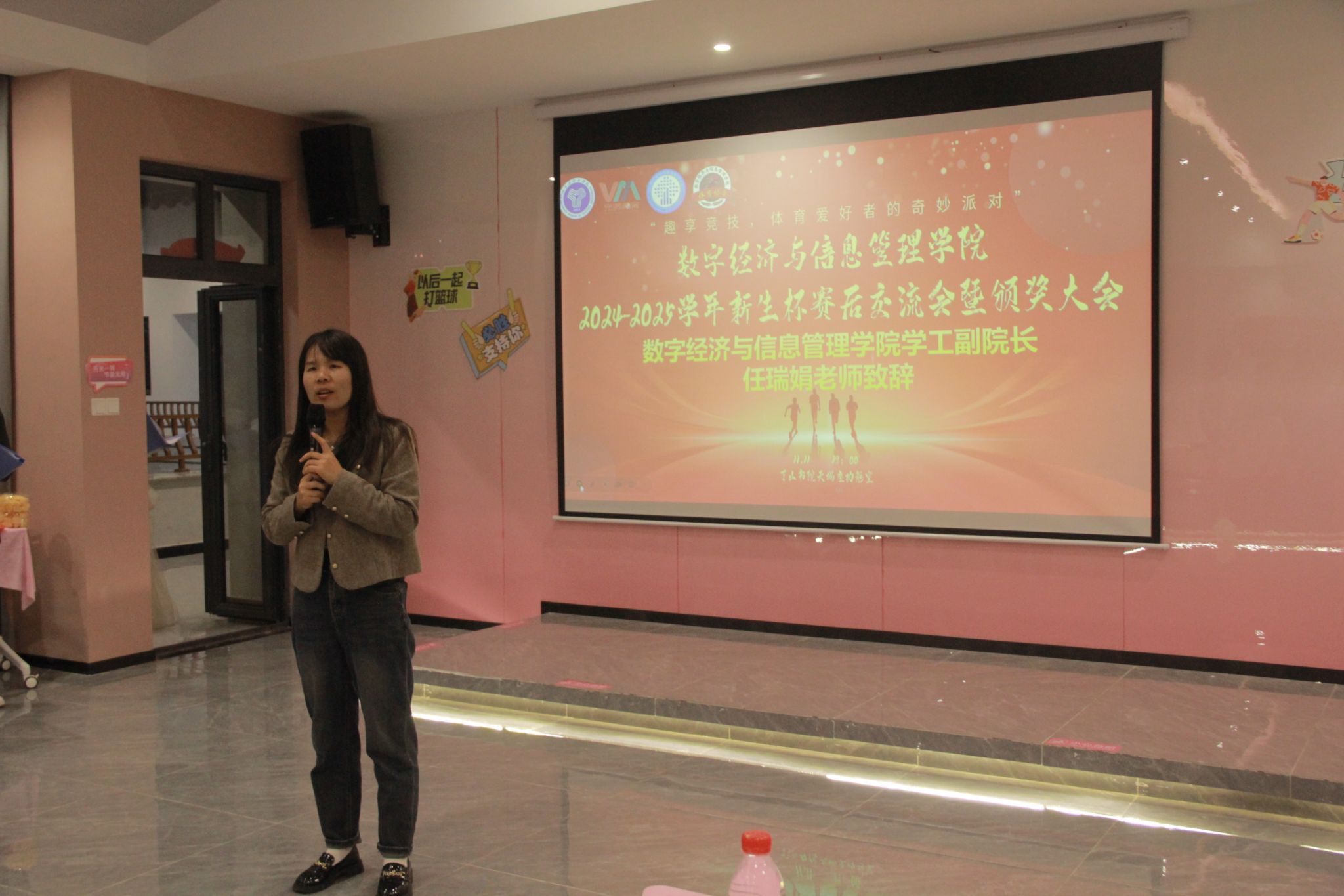 为促进数字经济与信息管理学院体育运动更好发展,增促进新生之间交流与融合,培养新生的团队精神和竞技意识,展示新生才艺与综合素质。2024年11月11日19点,数字经济与信息管理学院体育协会于丁山书院天蝎座多功能室成功举办了“趣享竞技,体育爱好者的奇妙派对”——数字经济与信息管理学院2024-2025学年新生杯赛后交流会暨颁奖大会,本次活动邀请了数字经济与信息管理学院学工副院长任瑞娟院长、竞技体育中心主任江华主任及竞技体育各板块教练代表廖秋怡老师、陈伟业老师、苏世达老师、江华老师和罗晨老师,数字经济与信息管理学院学工办主任任超群老师、团总支书记潘锐老师及学院全体辅导员出席。此外,本次活动的学生群体不仅包含数字经济与信息管理学院2024-2025学年新生杯的6支参赛队伍,还邀请到了各年级的文体委员们,旨在通过竞技体育活动的交流会的良好氛围来增强我院学生们的竞技精神和团队意识,从而为之后的竞体活动奠定良好的学生基础。