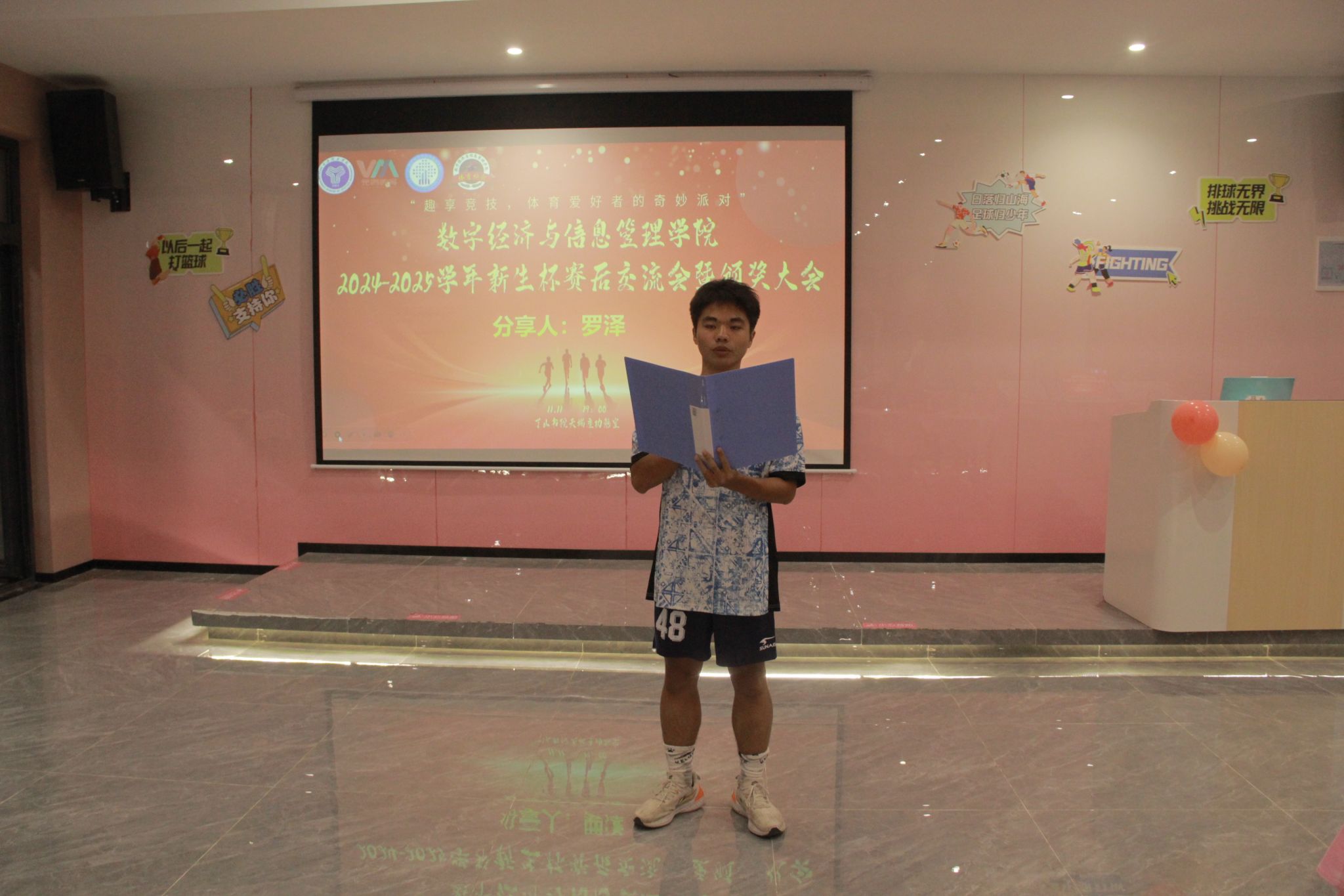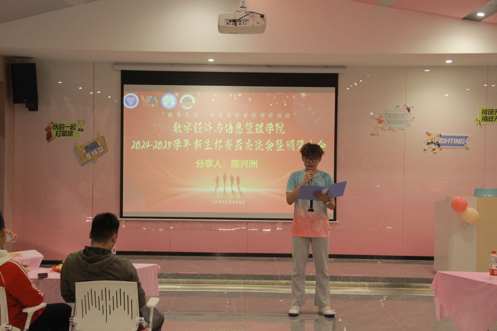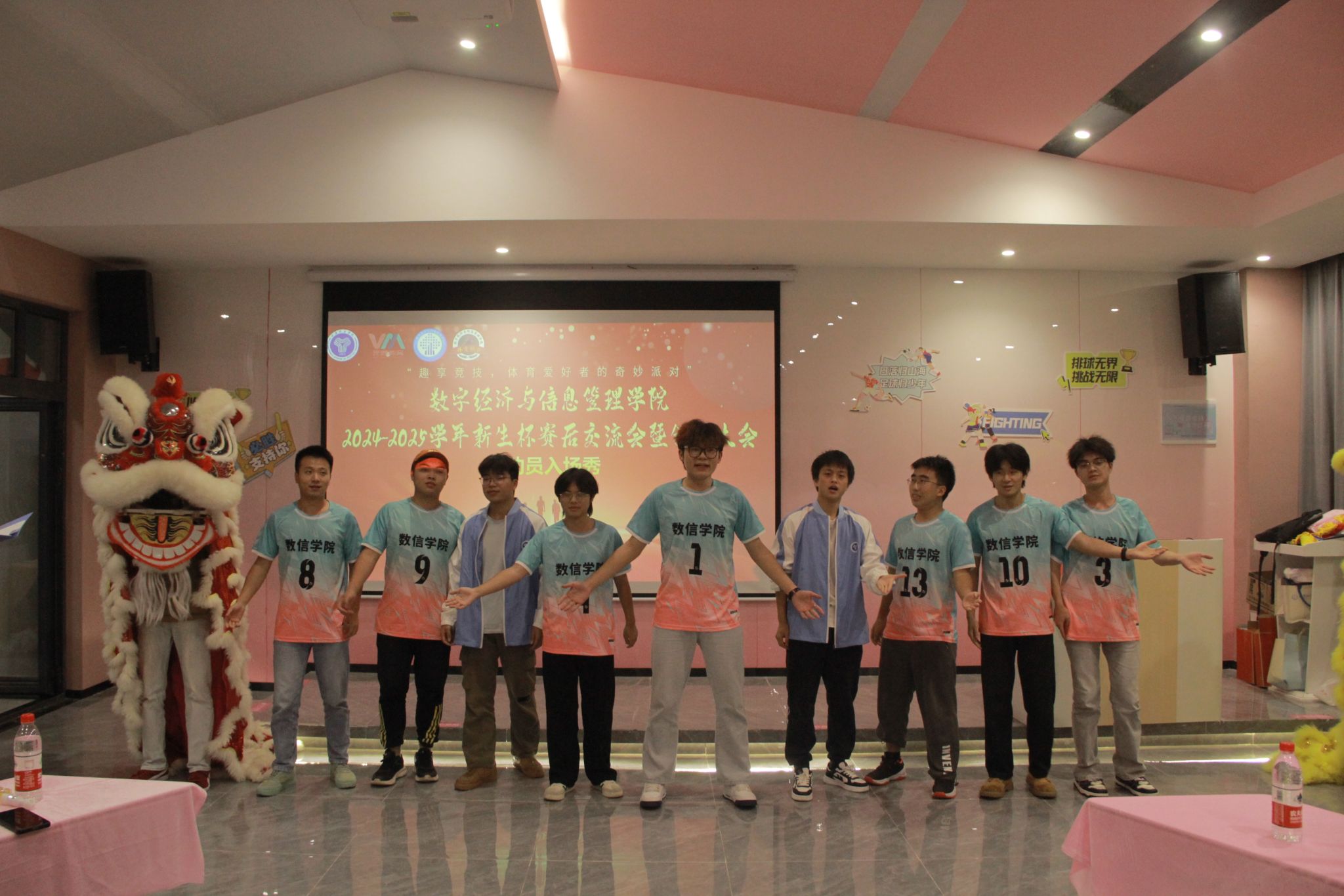 为促进数字经济与信息管理学院体育运动更好发展,增促进新生之间交流与融合,培养新生的团队精神和竞技意识,展示新生才艺与综合素质。2024年11月11日19点,数字经济与信息管理学院体育协会于丁山书院天蝎座多功能室成功举办了“趣享竞技,体育爱好者的奇妙派对”——数字经济与信息管理学院2024-2025学年新生杯赛后交流会暨颁奖大会,本次活动邀请了数字经济与信息管理学院学工副院长任瑞娟院长、竞技体育中心主任江华主任及竞技体育各板块教练代表廖秋怡老师、陈伟业老师、苏世达老师、江华老师和罗晨老师,数字经济与信息管理学院学工办主任任超群老师、团总支书记潘锐老师及学院全体辅导员出席。此外,本次活动的学生群体不仅包含数字经济与信息管理学院2024-2025学年新生杯的6支参赛队伍,还邀请到了各年级的文体委员们,旨在通过竞技体育活动的交流会的良好氛围来增强我院学生们的竞技精神和团队意识,从而为之后的竞体活动奠定良好的学生基础。