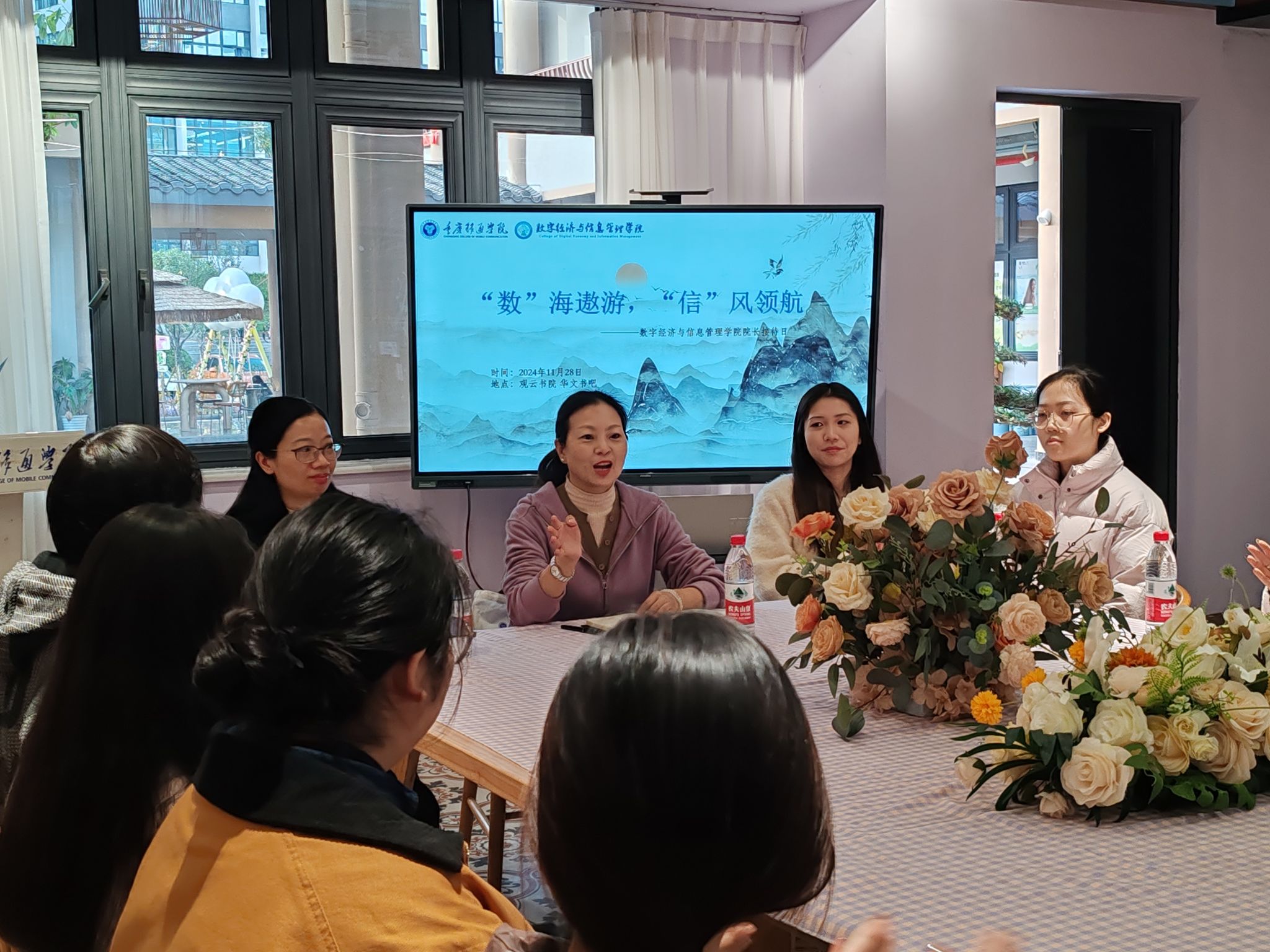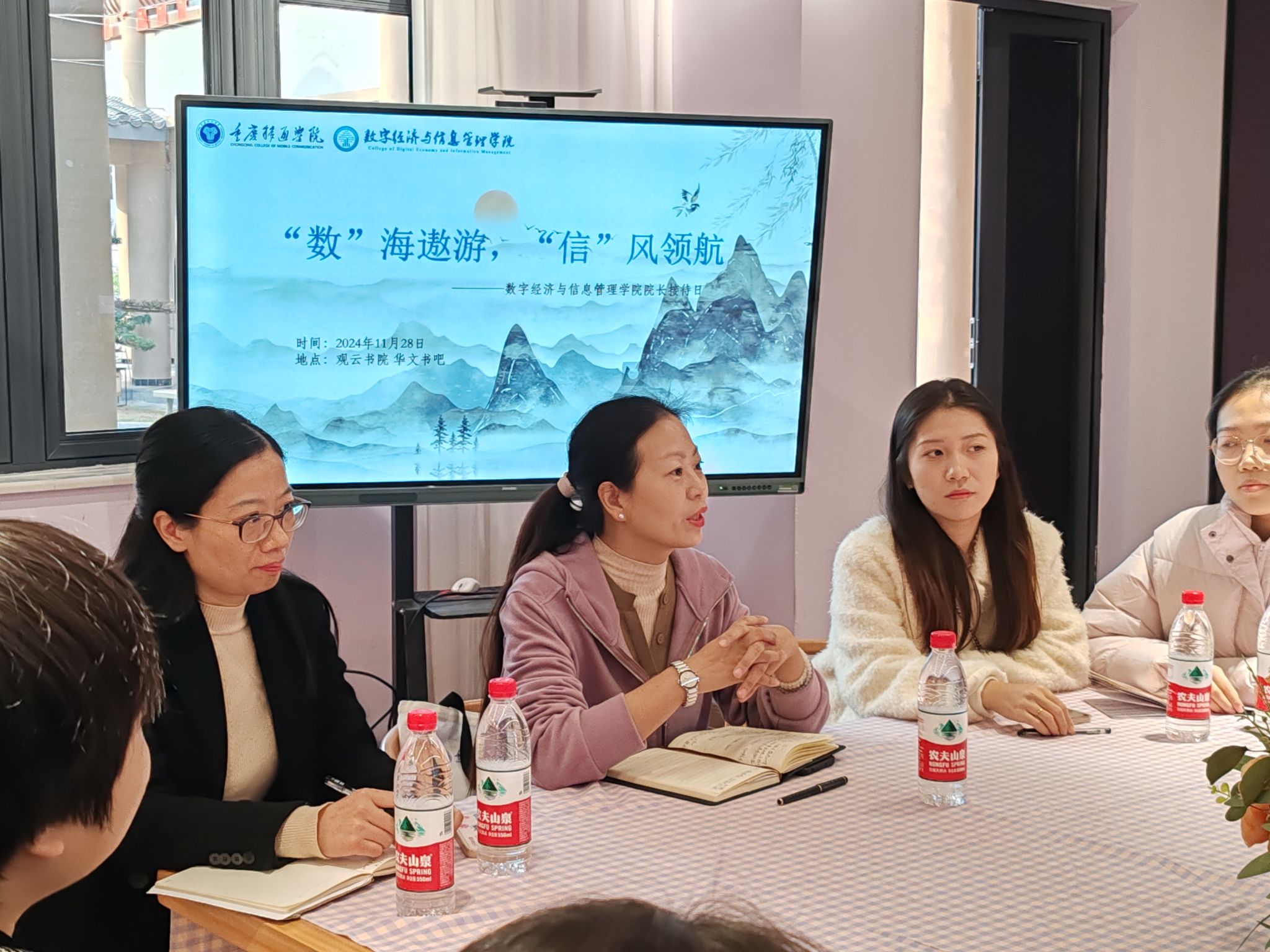 为搭建一个学院与学生之间直接沟通的桥梁,让师生能够更深入地了解彼此,共同为学院的繁荣发展贡献力量,数字经济与信息管理学院于2024年11月28日下午16:00在观云书院华文书吧开展了以“‘数’海遨游,‘信’风领航”第十三周院长接待日。本次会议有幸邀请到数字经济与信息管理学院院长刘贵容教授,数字经济专业教研室主任陈明燕老师,数字经济专业教研室骨干教师代表吴倩老师、李祺豫老师,以及2023级数字经济专业辅导员吴倩蓉老师作为出席嘉宾,2023级数字经济专业学生代表参会。