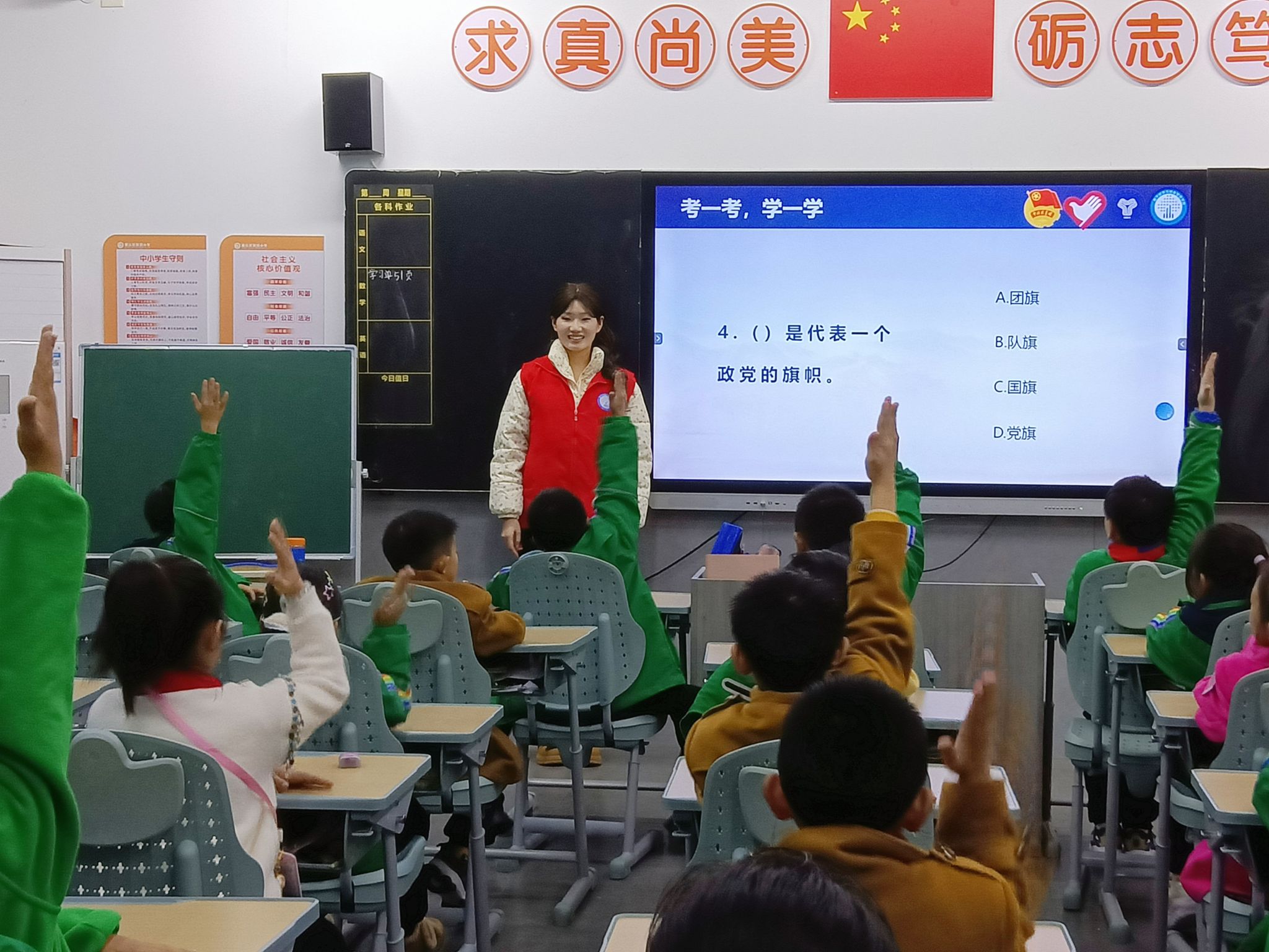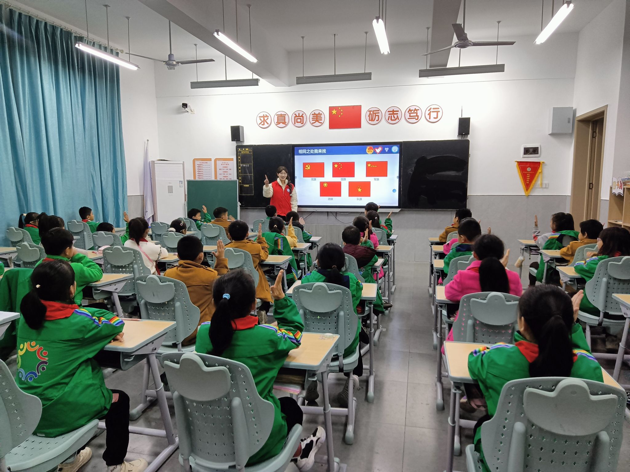 在“祖国旗帜在我心”的视频播放后,志愿者通过PPT放映,引导孩子们在国旗、党旗、军旗、团旗和队旗的图片中寻找它们的相似之处,并详细讲解了每面旗帜所代表的不同含义。通过图片文字连线小游戏,进一步加深孩子们对各旗帜的印象。