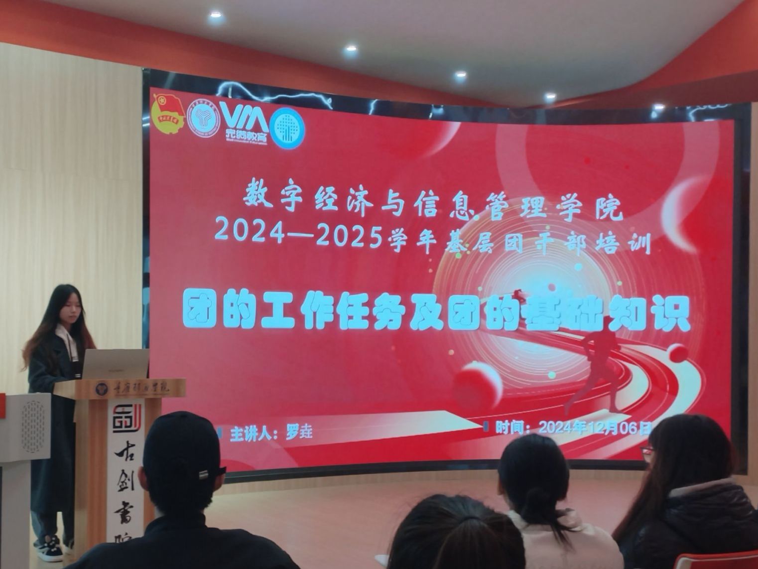为了加深团干部对团的工作任务和团的基础知识的理解与掌握,进一步提升基层团组织的凝聚力和战斗力,数字经济与信息管理学院于2024年12月6日开展了以《团的工作任务和基础知识》为主题的基层团干部培训。此次培训由组织部部长罗垚担任主讲人,其内容涵盖团干部的职责定位、组织建设主要工作任务、团的组织制度等核心知识领域,为团干部们的后续工作开展指明了方向,明确了目标。