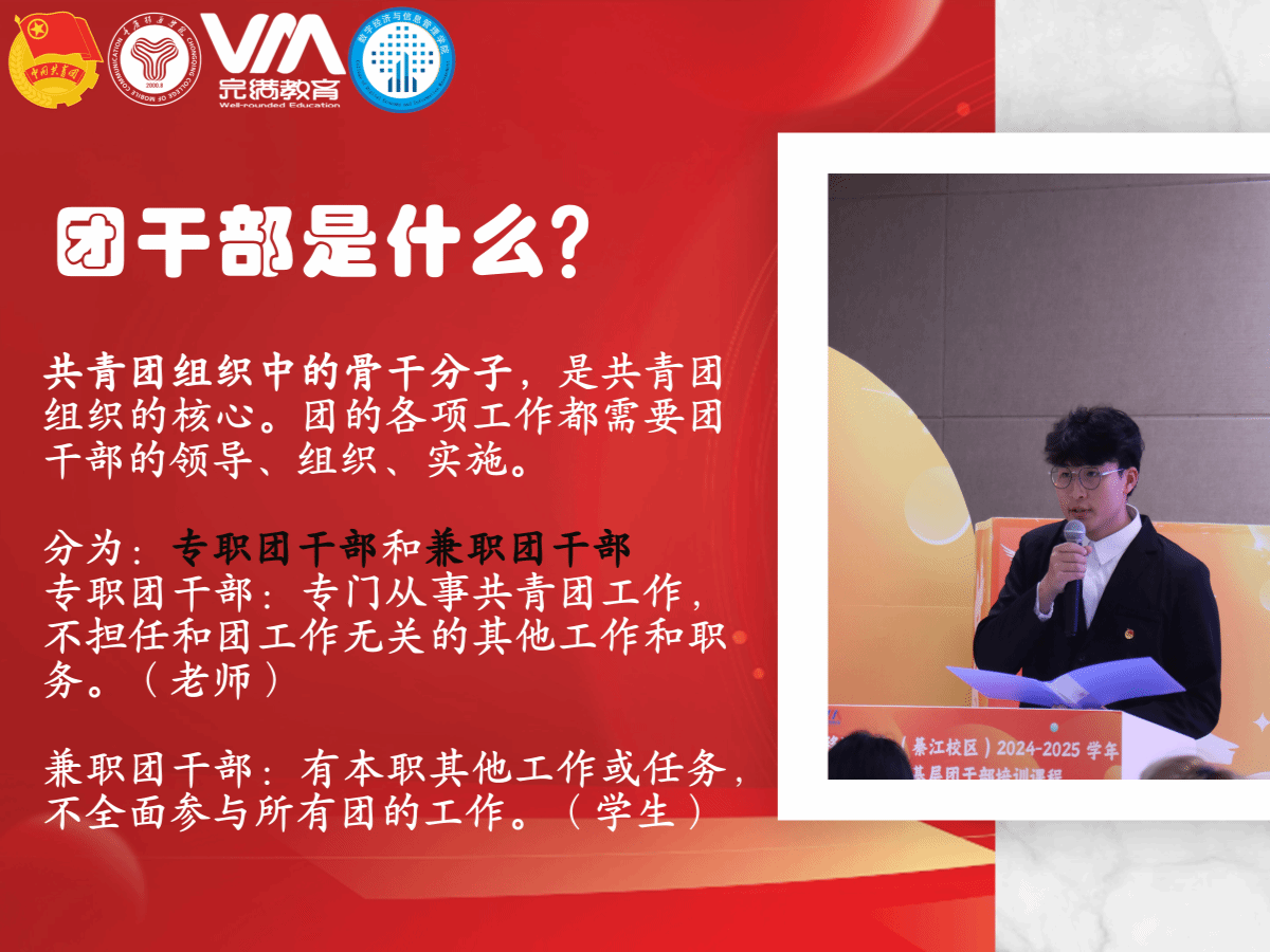 培训伊始,罗垚部长便强调团干部在共青团组织中的引领作用,团干部作为团组织的核心力量,既是党的助手和后备军,也是广大青年团员的引路人,他们肩负着组织、引导、服务青年的重要使命,她对团干部的角色与定位进行了深入剖析,由“团干部是什么”引入,明确了团干部在思想引领、组织建设中的重要作用,本学院现有 117 个团支部和 2400 余名团员,其庞大架构涵盖合川、綦江双校区,团干部作为关键力量与桥梁纽带,为学院共青团组织建设的工作发展注入强大动力。
