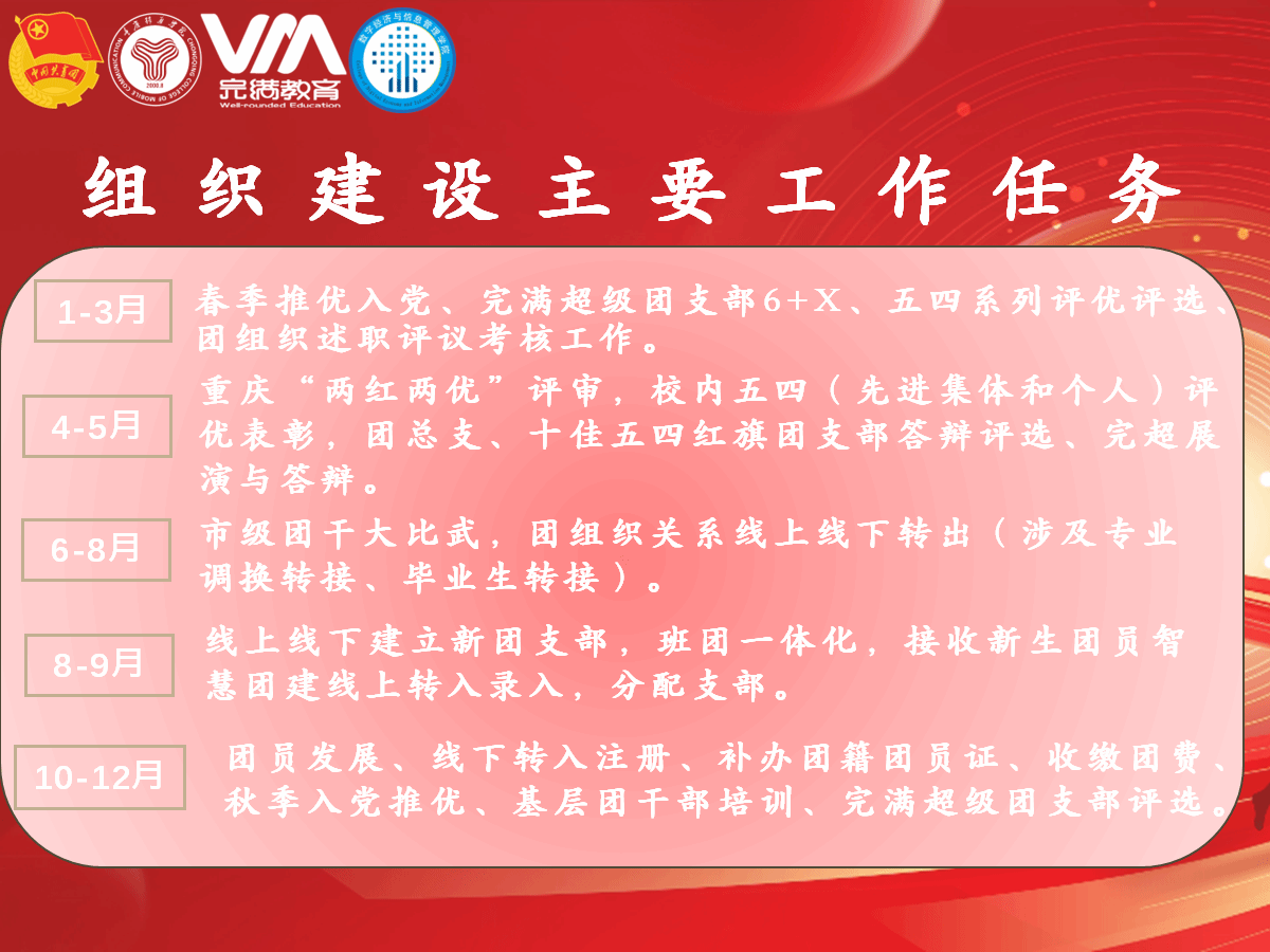 在组织建设方面,罗部长主要从“工作任务”方面阐述。以时间为脉络,为我们梳理了从1月至12月各阶段的主要工作任务,涵盖了春秋两季进行的共青团推优入党工作、重庆市“两红两优”评选相关事宜、团关系的线上转出与转入事宜、新团员的发展以及教育管理等内容,为我们理清了团干部基础工作任务,为后续团干部们对于团组织的工作顺利推进筑牢根基。