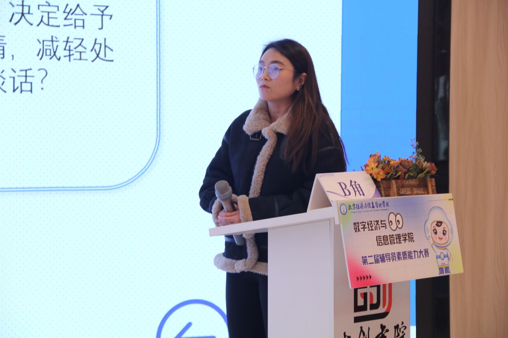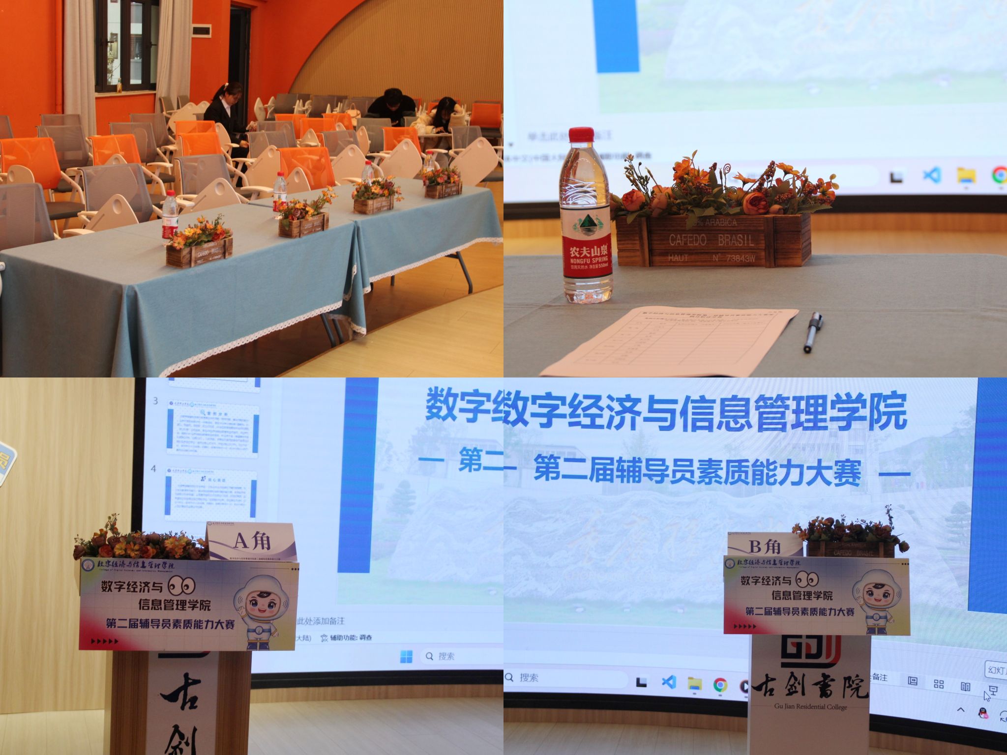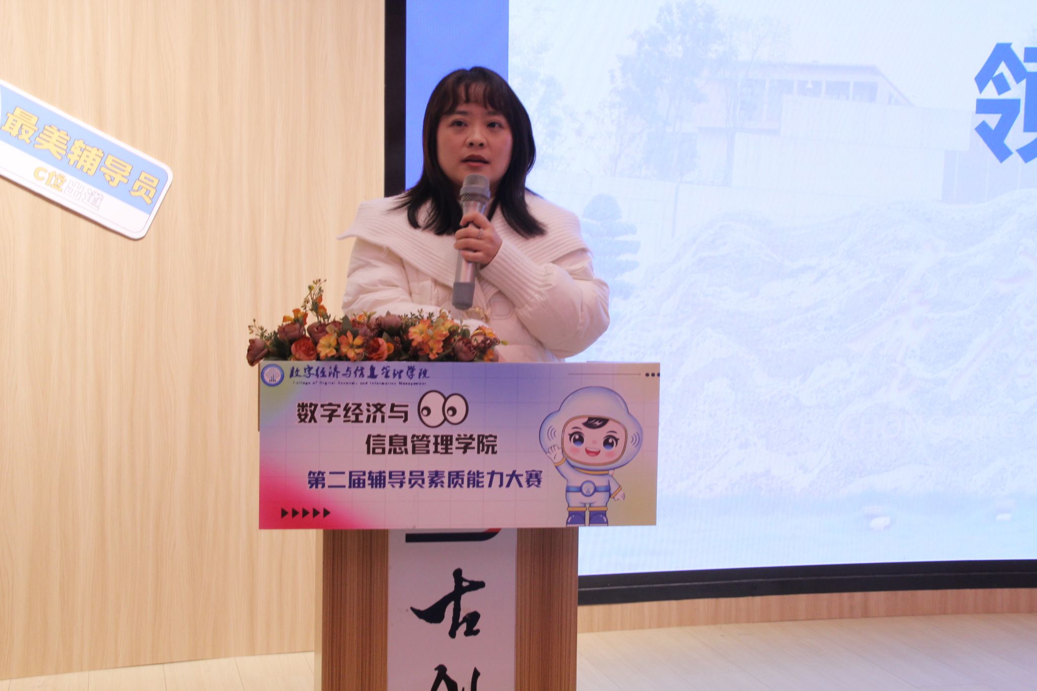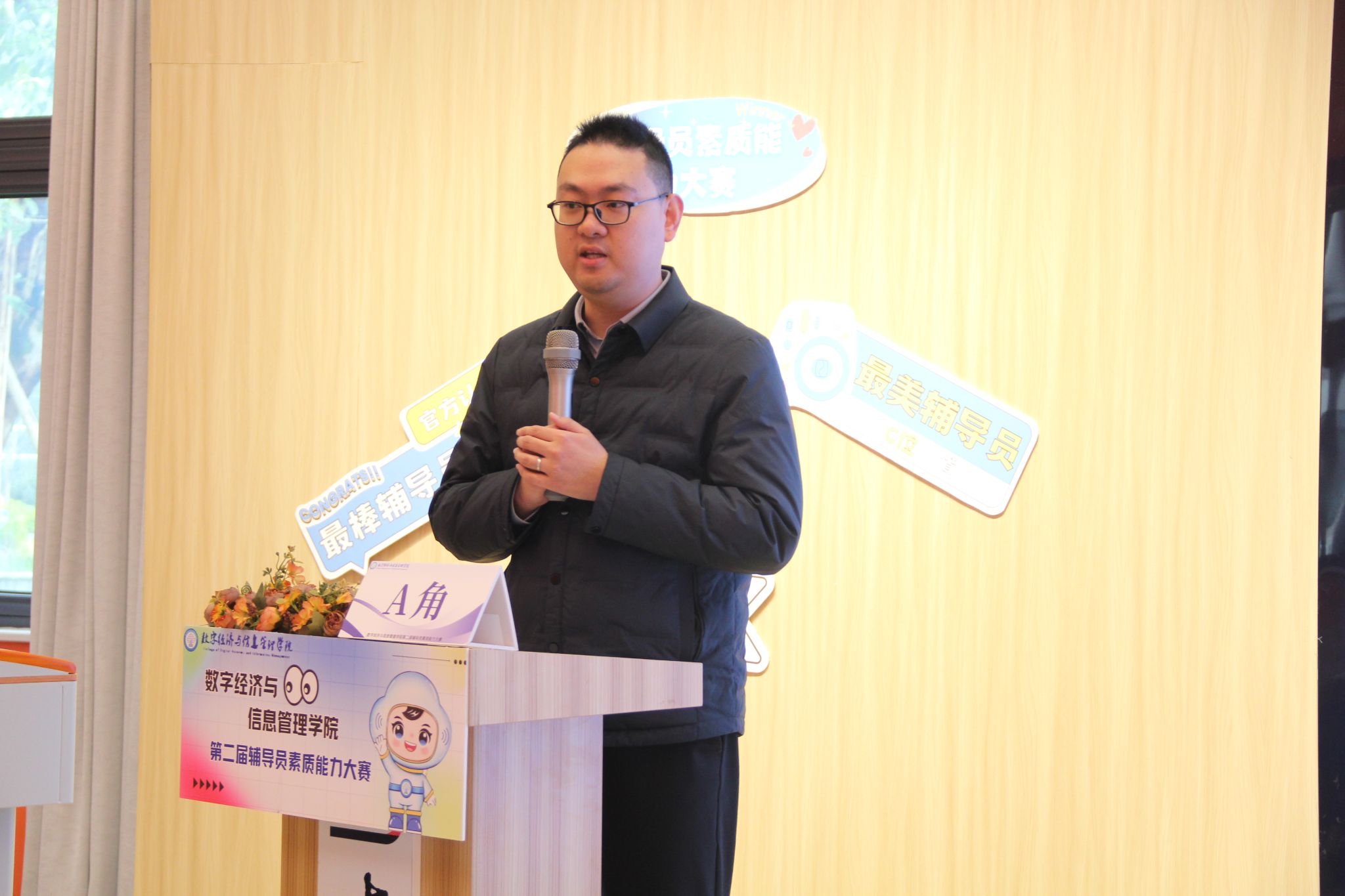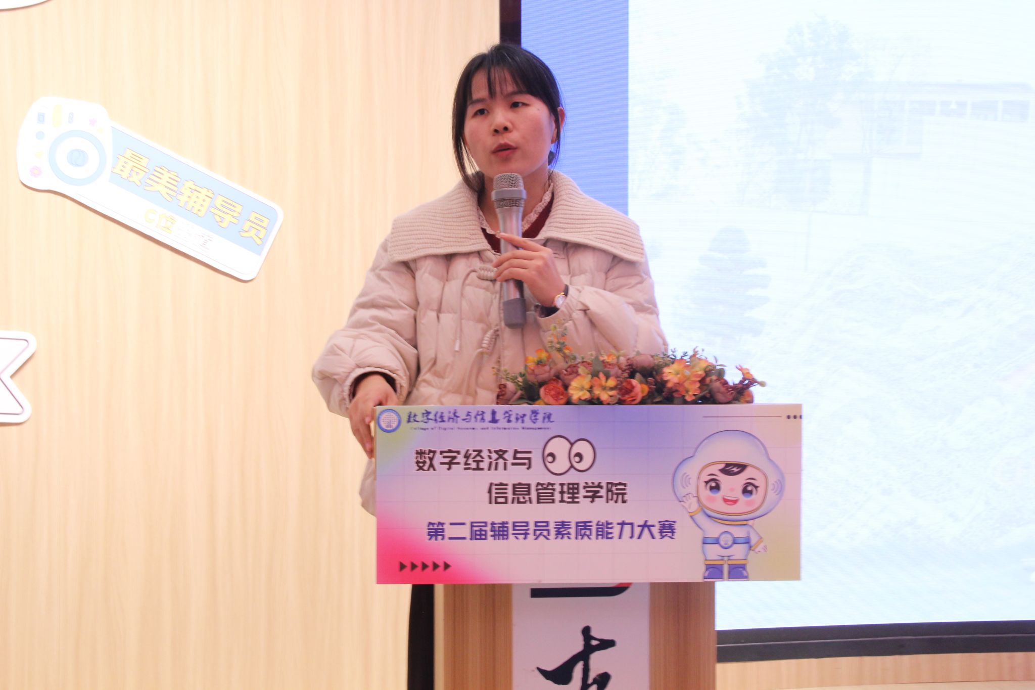 为进一步提升辅导员的职业能力与综合素养,推动学院学生工作队伍的专业化建设,12月6日,数字经济与信息管理学院第二届辅导员素质能力大赛决赛在古剑书院 含光·多功能报告厅举行。本次大赛特别邀请了数字经济与信息管理学院学工副院长任瑞娟老师、大健康管理学院学工办主任童学容老师、通信与信息工程学院团总支书记田海燕老师、戏剧影视学院学工办主任曾玉娇老师担任评委,数字经济与信息管理学院辅导员参加,部分学生到场观摩比赛。