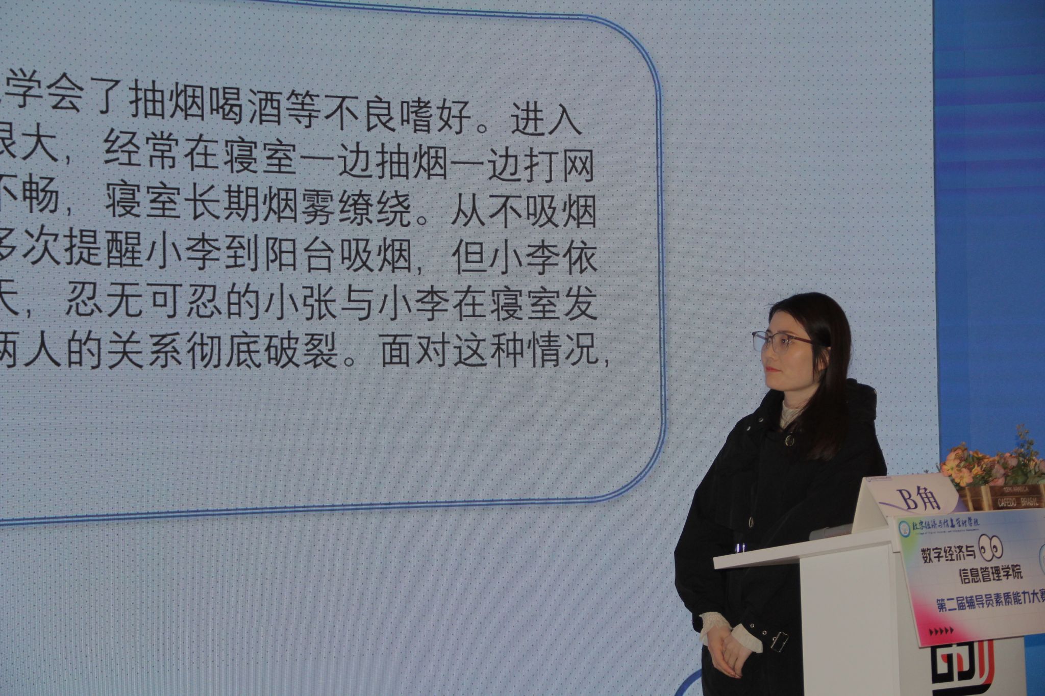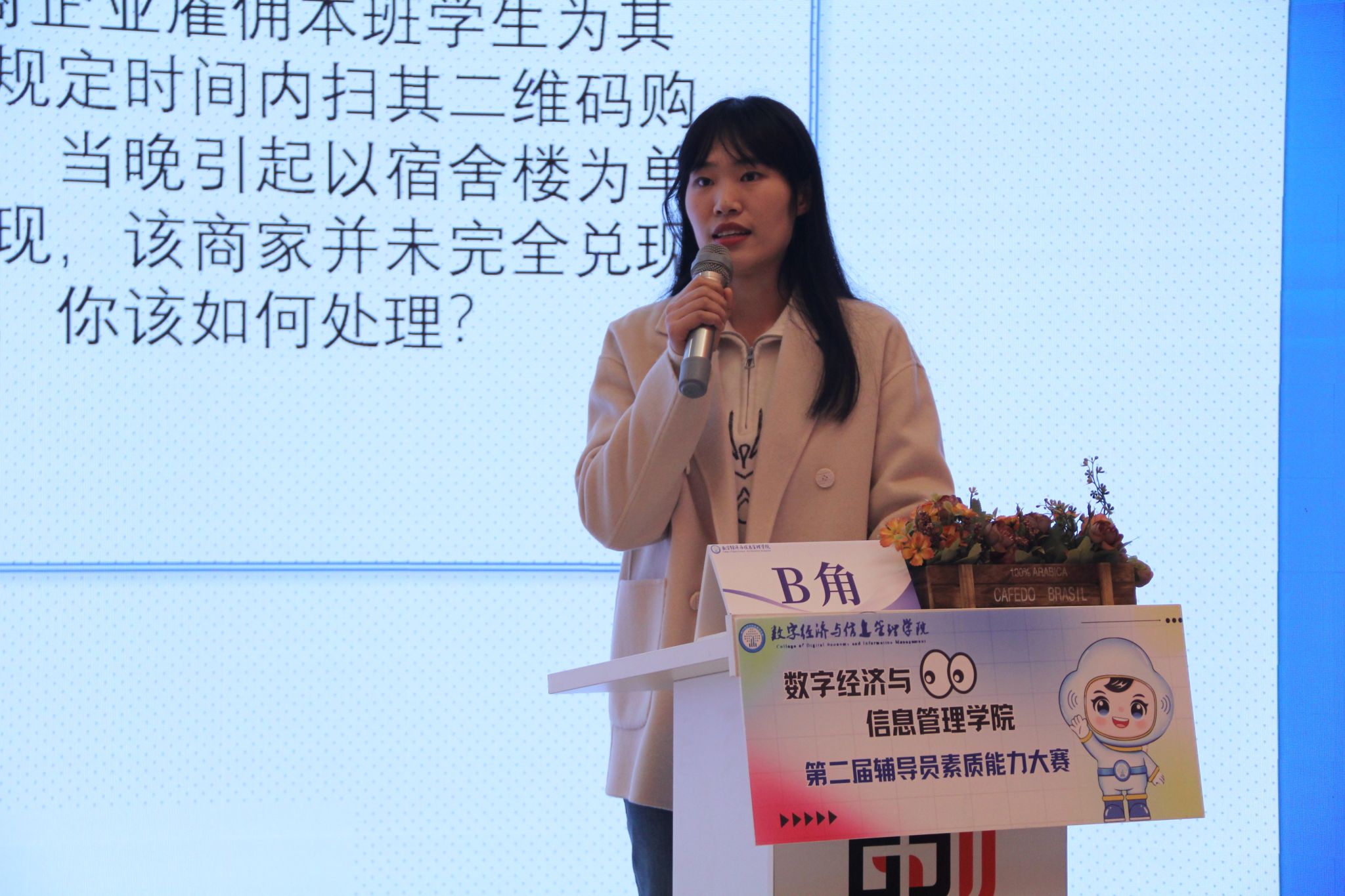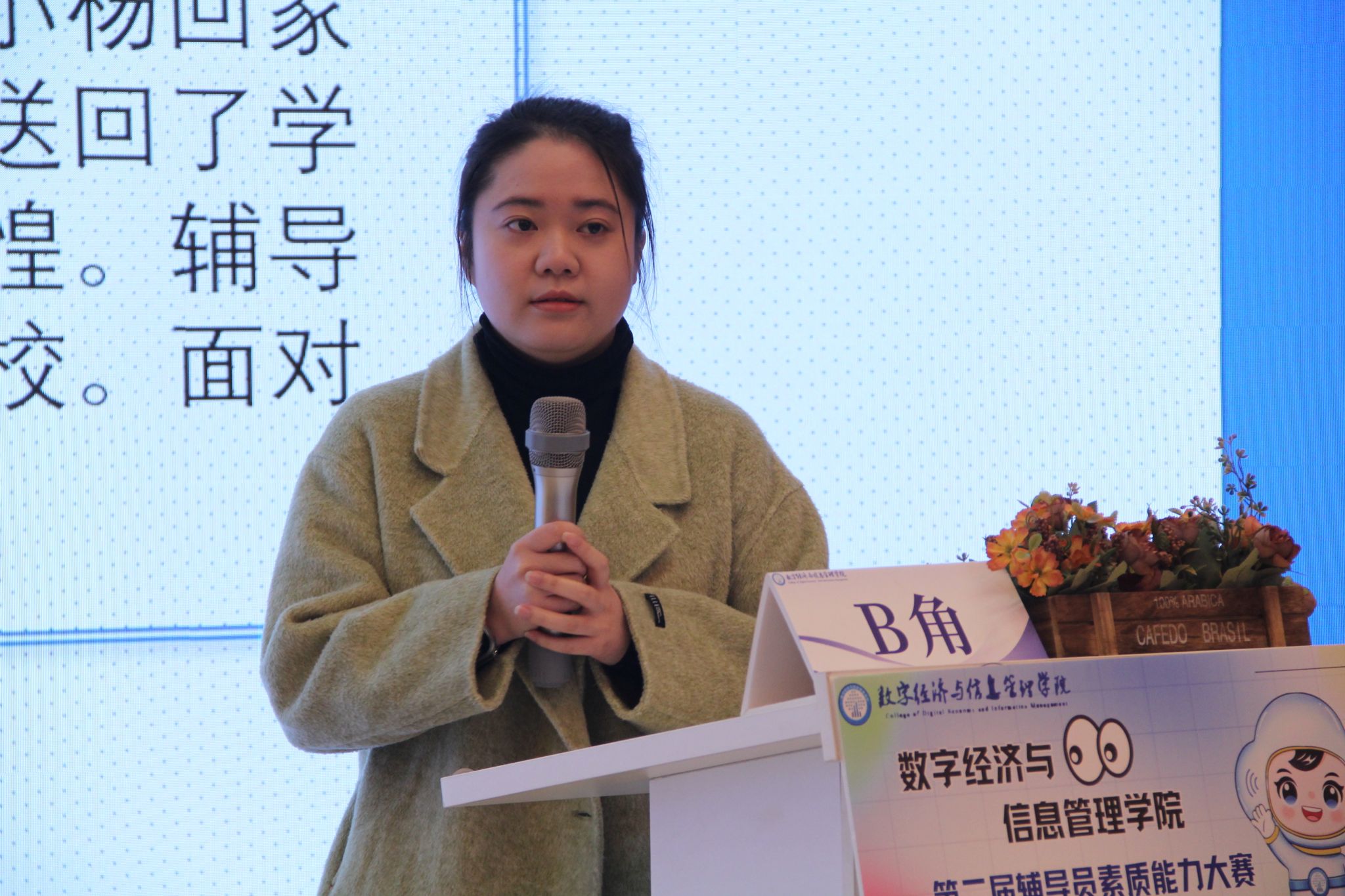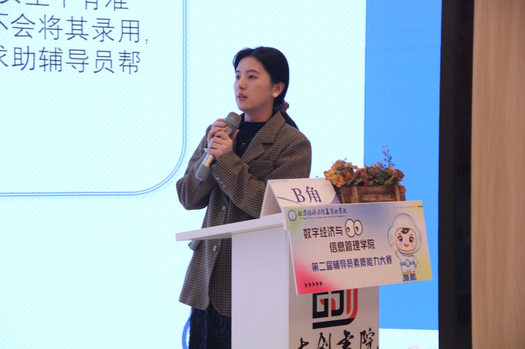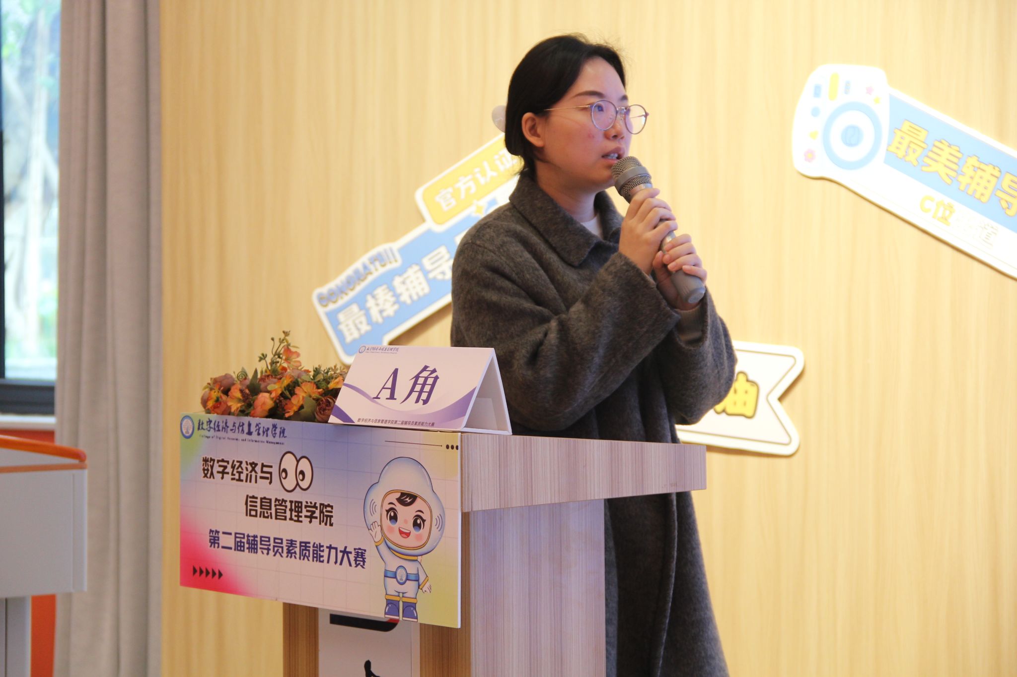 为进一步提升辅导员的职业能力与综合素养,推动学院学生工作队伍的专业化建设,12月6日,数字经济与信息管理学院第二届辅导员素质能力大赛决赛在古剑书院 含光·多功能报告厅举行。本次大赛特别邀请了数字经济与信息管理学院学工副院长任瑞娟老师、大健康管理学院学工办主任童学容老师、通信与信息工程学院团总支书记田海燕老师、戏剧影视学院学工办主任曾玉娇老师担任评委,数字经济与信息管理学院辅导员参加,部分学生到场观摩比赛。