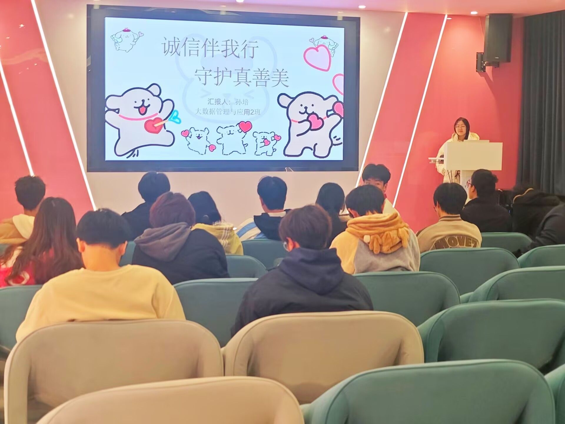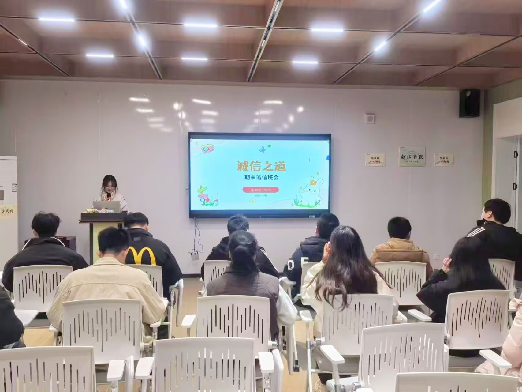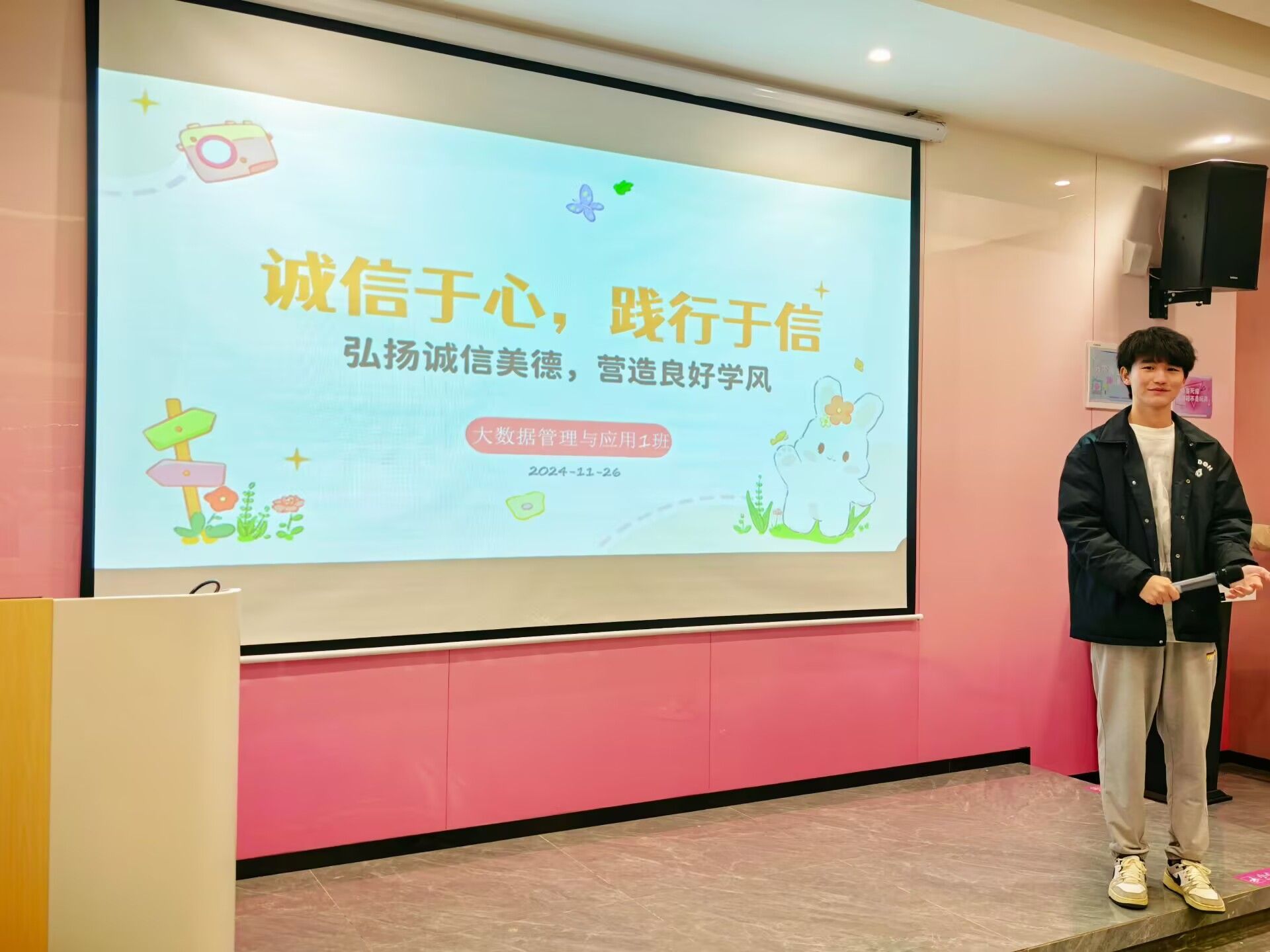 2024级大数据管理与应用1班于11月28日19:30在丁山书院·处女座开展本次诚信班会。一个个诚信视频不断提醒着在座的同学在待人接物方面应当时刻遵守诚信,心理委员许森也通过对真实案例的生动讲解,向各位同学展现诚信的重要性。随着诚信小游戏“猜猜猜”以及“诚信加法”的开展,现场气氛被推向高潮,各位同学积极参与,大胆分享自己的诚信小故事以及感悟,通过周围人的影响,在潜移默化中深刻大家对诚信的理解与践行。