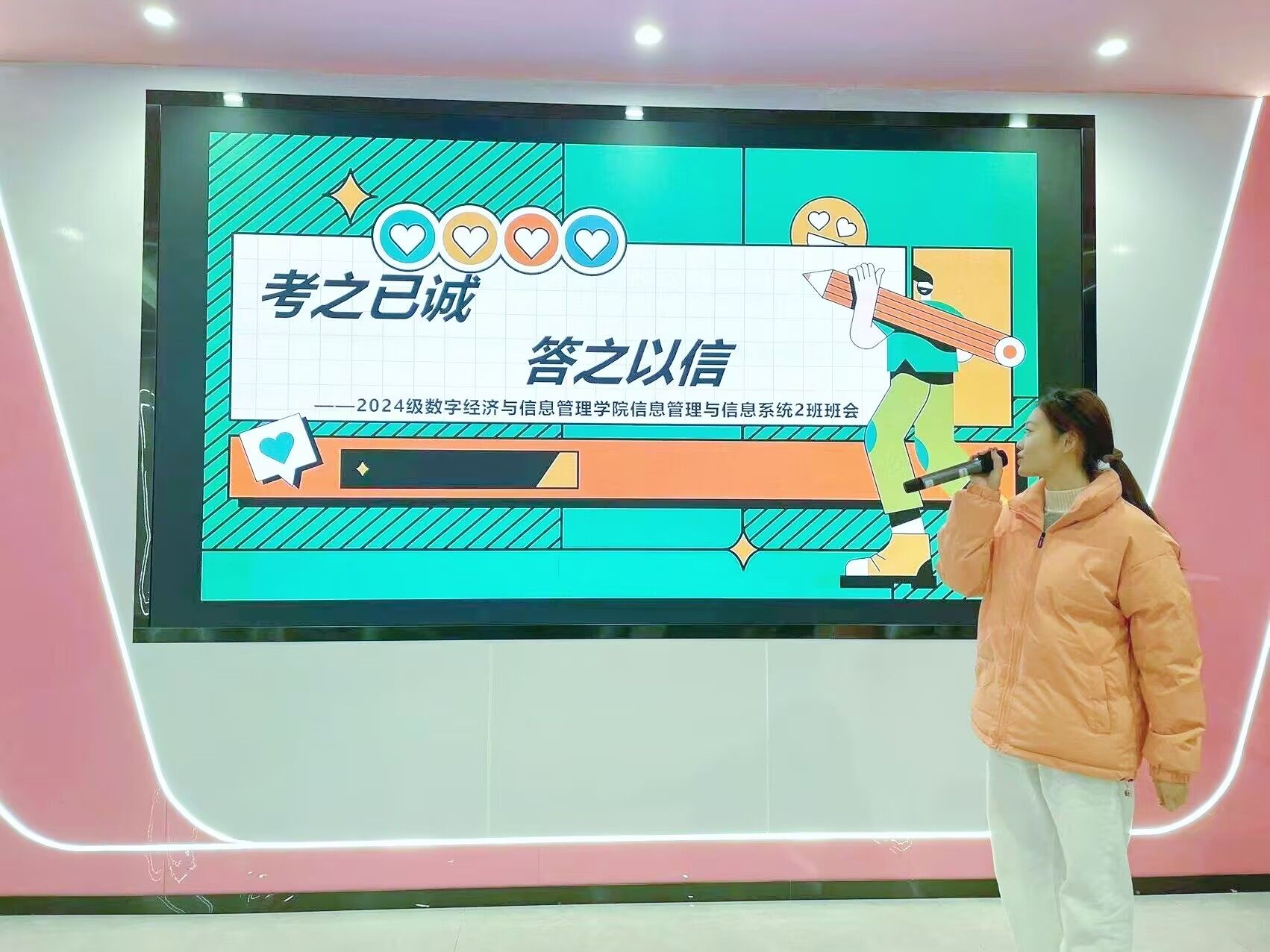 2024级信息管理与信息系统2班于12月9日19:30在丁山书院·射手座举办本次诚信班会。班会以大学生诚信考试视频开场,搞笑轻松的风格触动心弦;同学们热情回应主持人的提问,“在考试中什么最重要?”“诚信考试我们应该做到哪些?”并积极参与诚信游戏。“向后倒”考验着朋友之间的信任,“诚信大考验”通过情景剧的演绎,让同学们置身诚信考验的情景中,使其更深刻地理解诚信的含义,现场氛围热烈。最后主持人深入剖析诚信的含义与重要性,让诚信理念深植同学们灵魂深处。