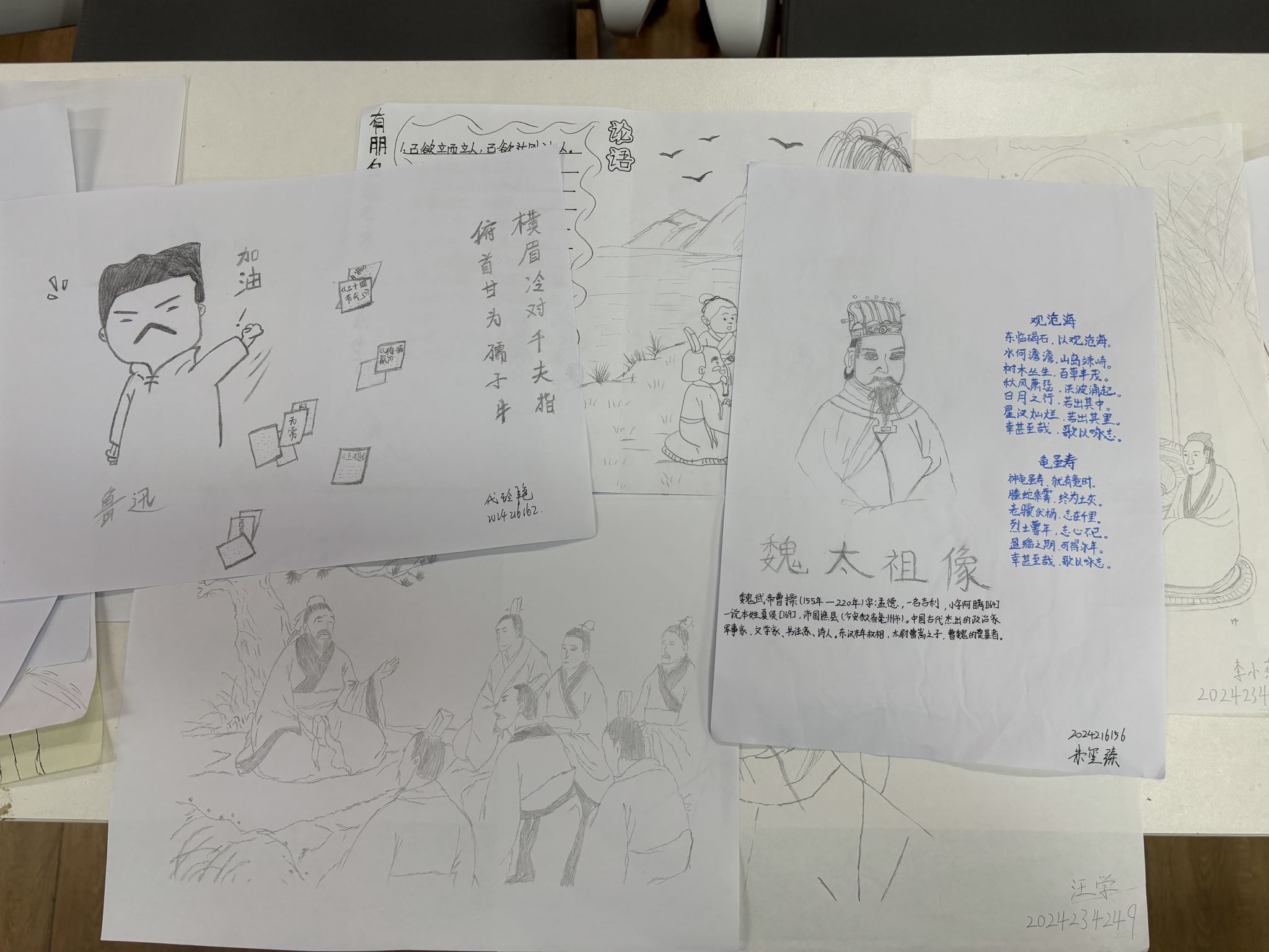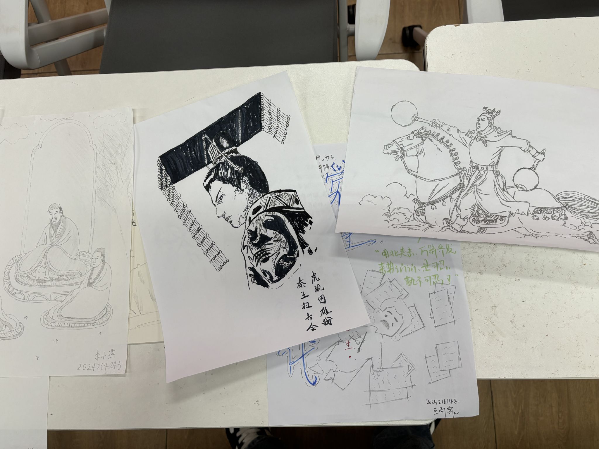 这次绘画活动,我深刻认识到中国画的独特魅力,知晓了许多的历史故事,极大地增加我对那些历史人物的兴趣,使我明白国画承载着历史的积淀与文化的底蕴。同时,同学们创作的历史人物画作也让我眼前一亮,深受启发。