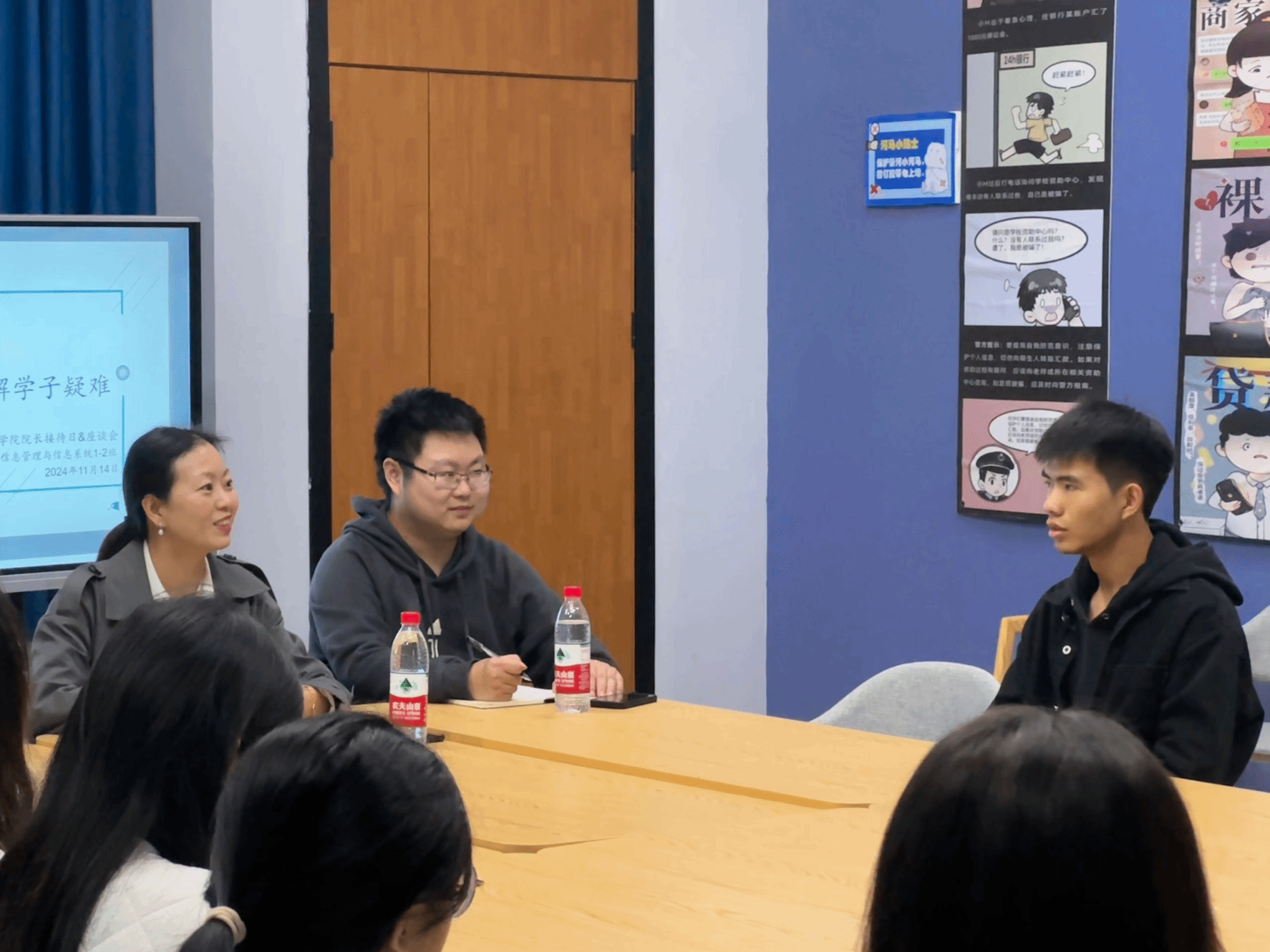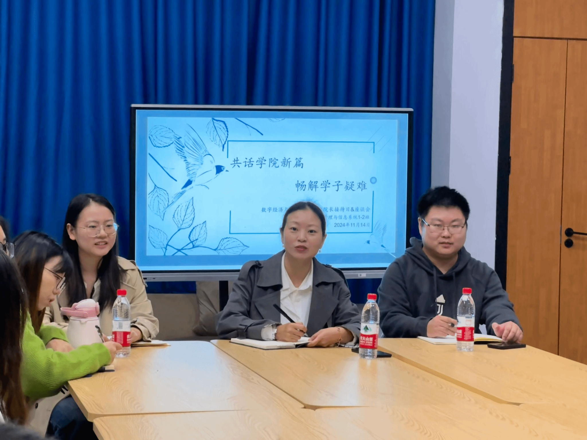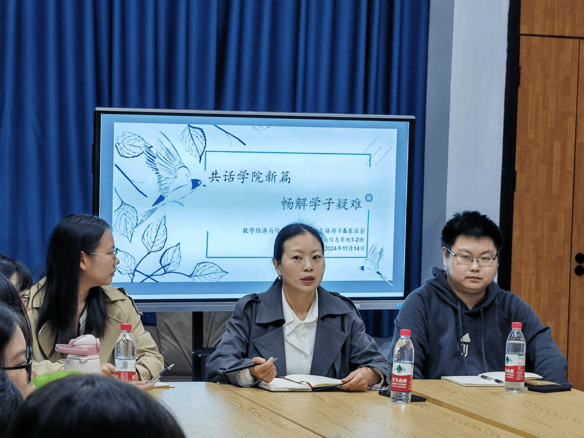 为搭建学院与学生之间的沟通桥梁,切实了解学生在学业发展中的需求,帮助学生解决实际问题,数字经济与信息管理学院于2024年11月14日10:30在綦河书院2号楼南渊·创写功能室开展了第十一周院长接待日。本次会议有幸邀请到数字经济与信息管理学院院长刘贵容教授、信管教研室主任文豪老师、骨干教师代表胡红琼老师、辅导员张倩老师作为嘉宾出席,2022级信息管理与信息系统专业1-2班学生代表参会。