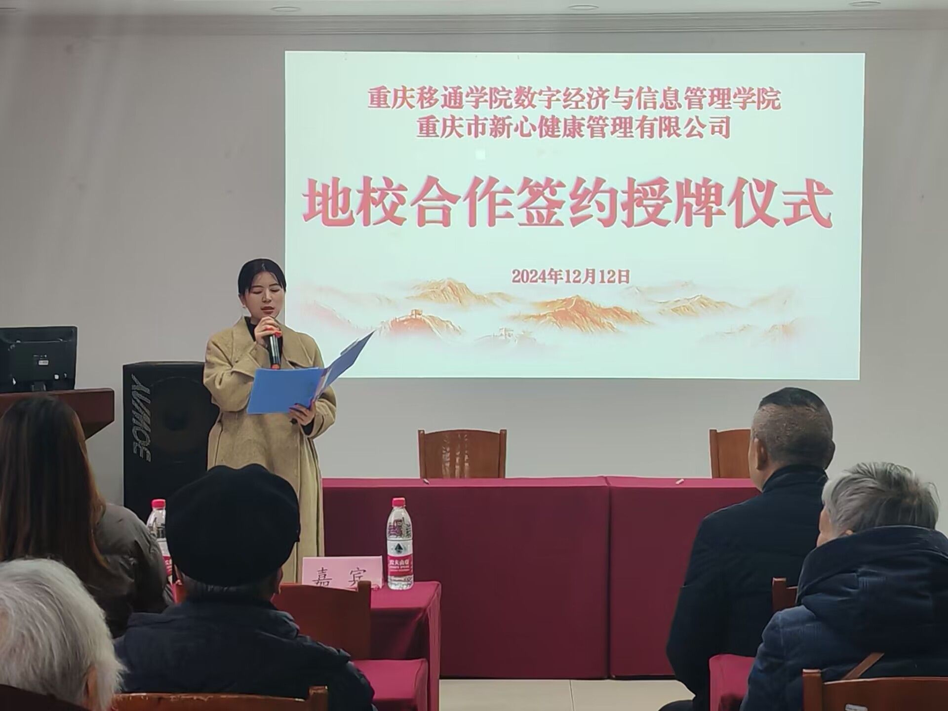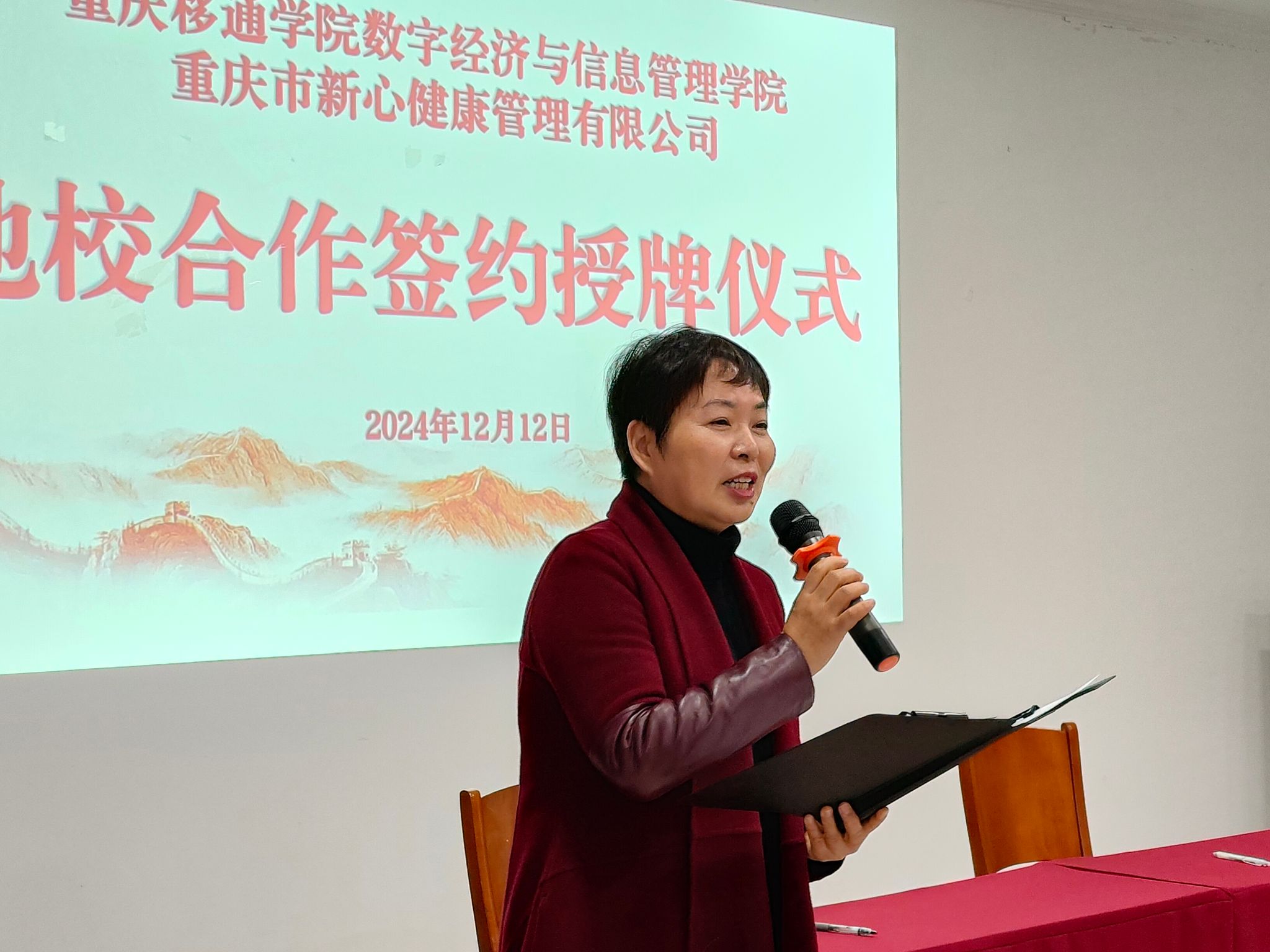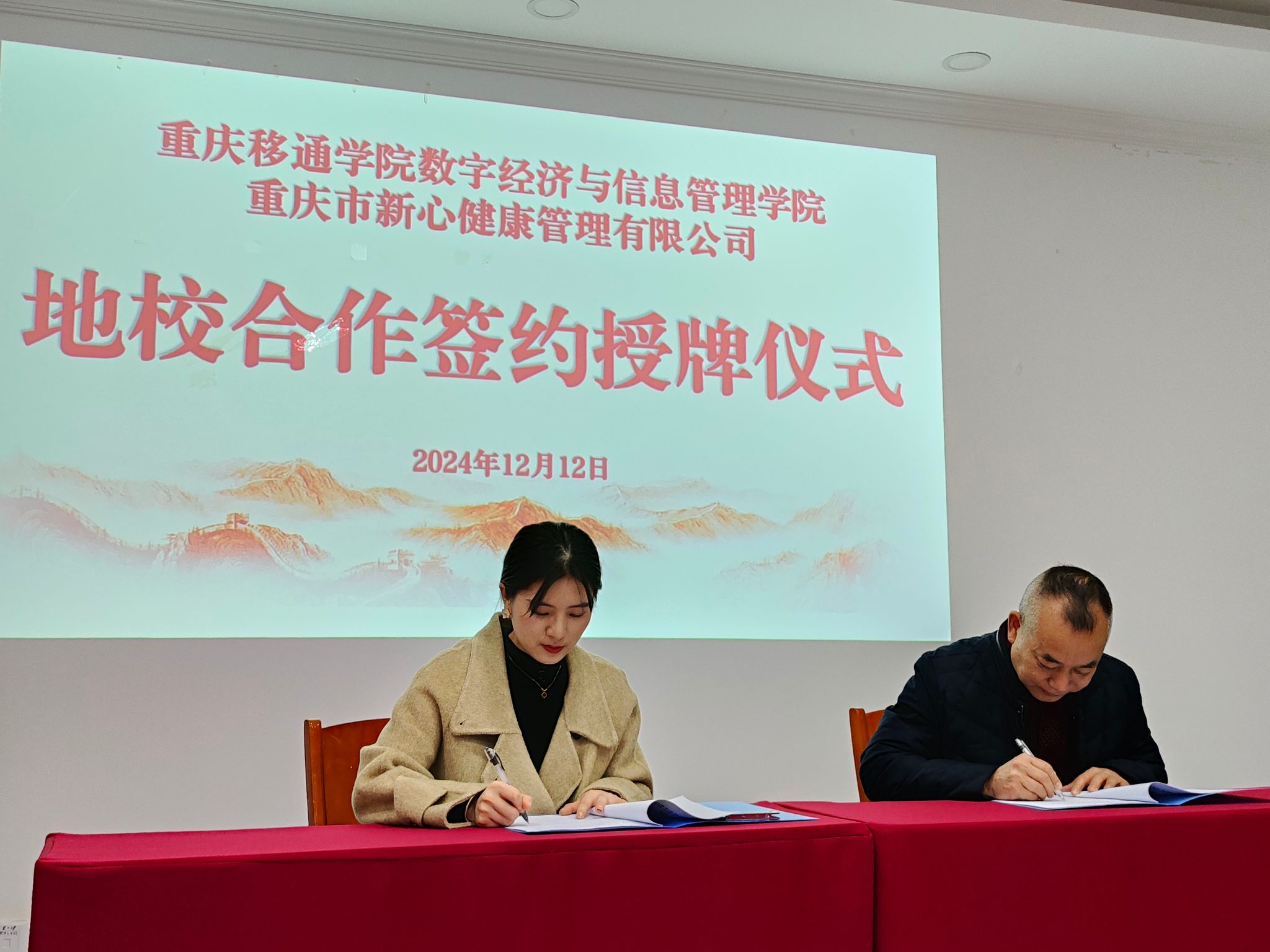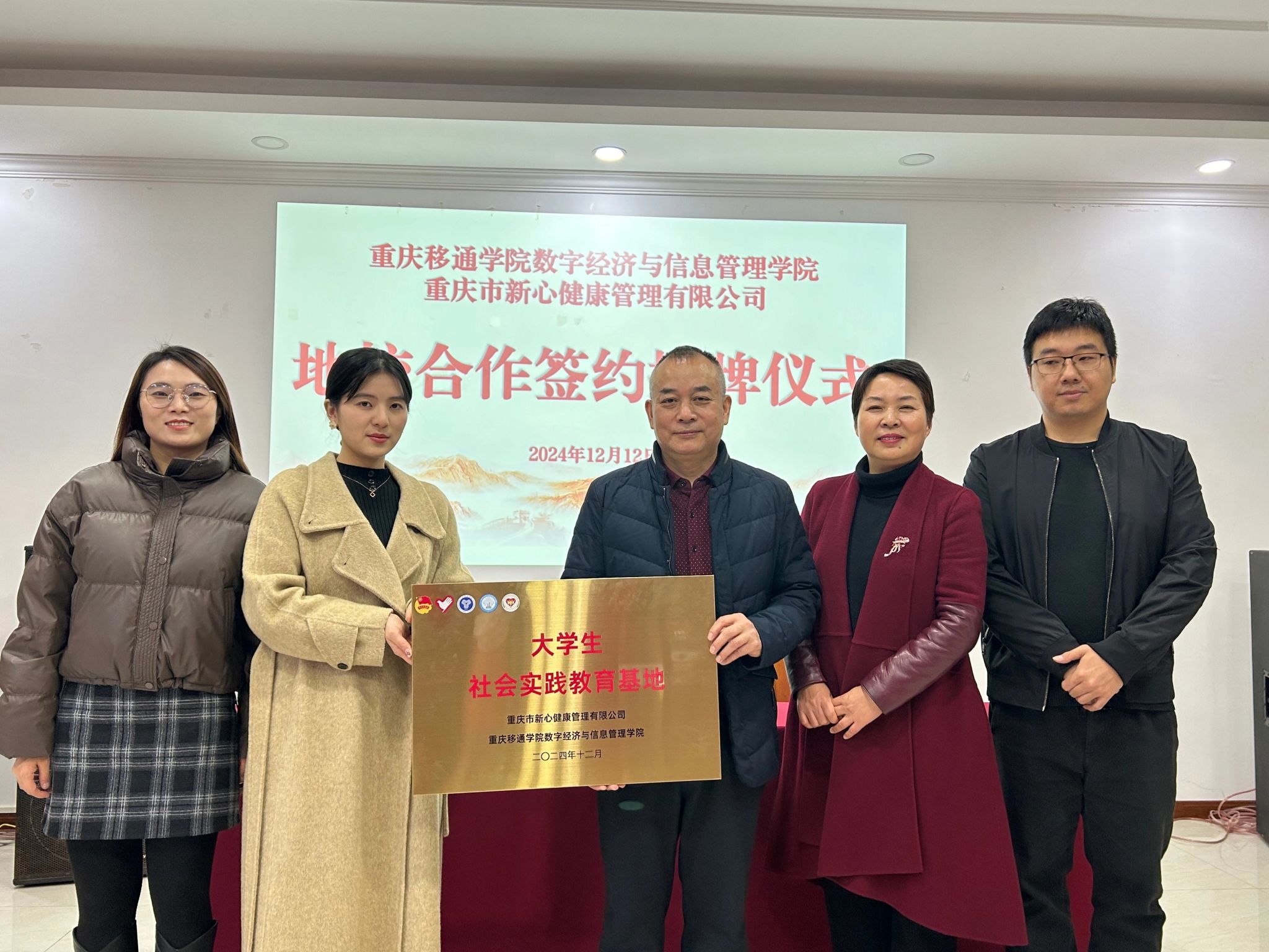 12月12日9时30分,重庆移通学院数字经济与信息管理学院志愿服务板块的指导老师张静、彭仙前往重庆市新心健康管理有限公司与李中才院长签订了地校合作意向书,并正式将重庆心新康养中心确立为我校大学生的社会实践教育基地,举行了授牌仪式。
