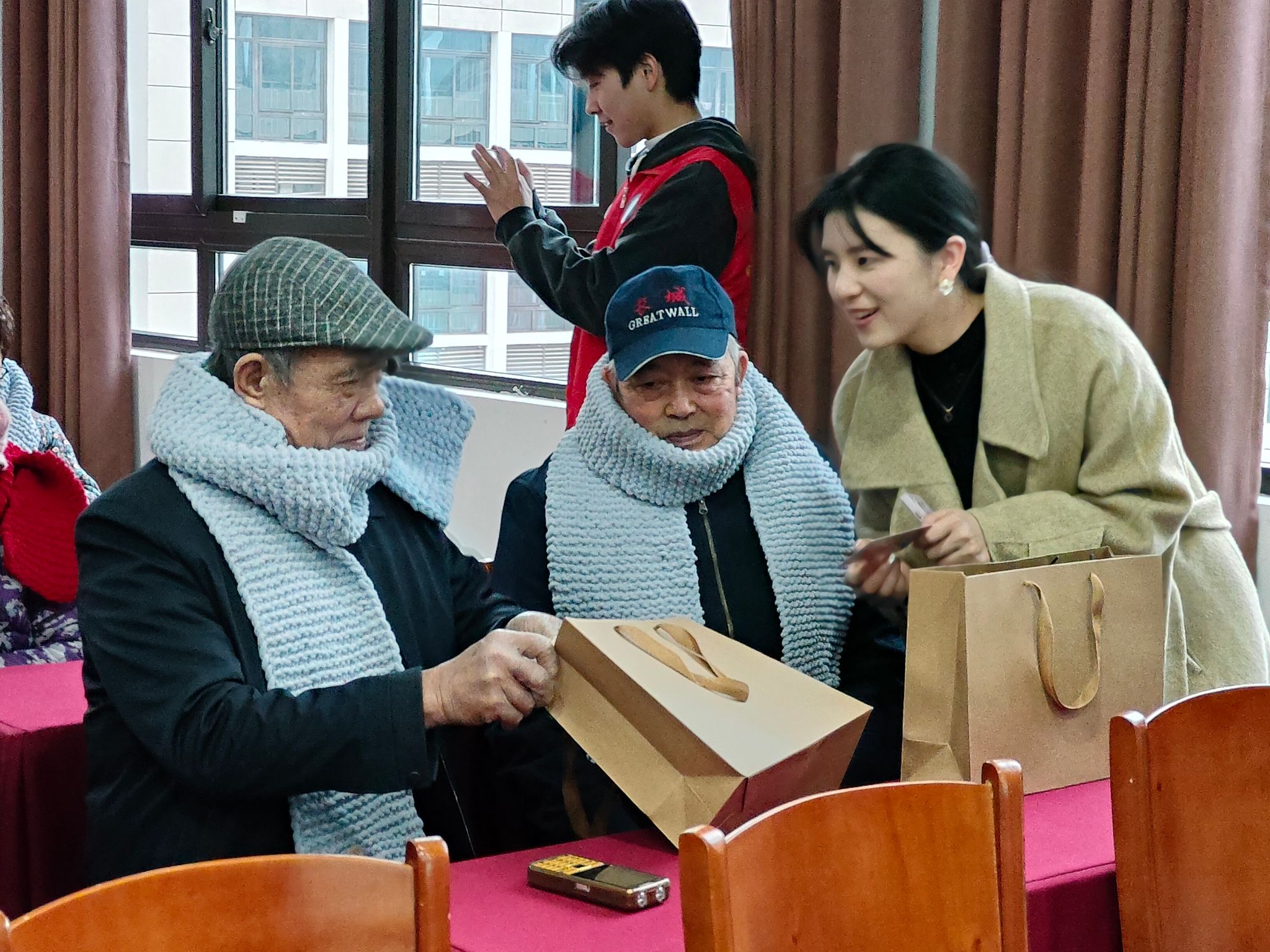 仪式最后,志愿者们将同学们手工编织围巾赠送给老人们,并邀请他们一起跳手势舞,共享这份跨越年龄的快乐与温暖。