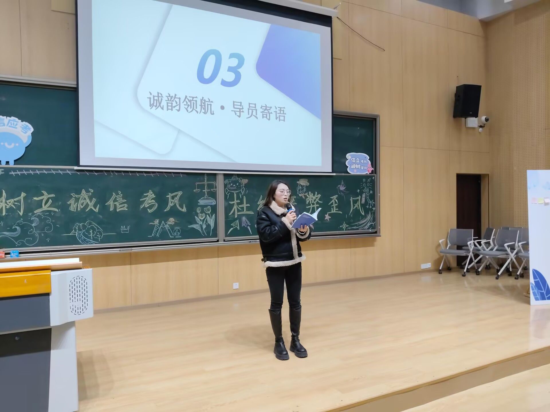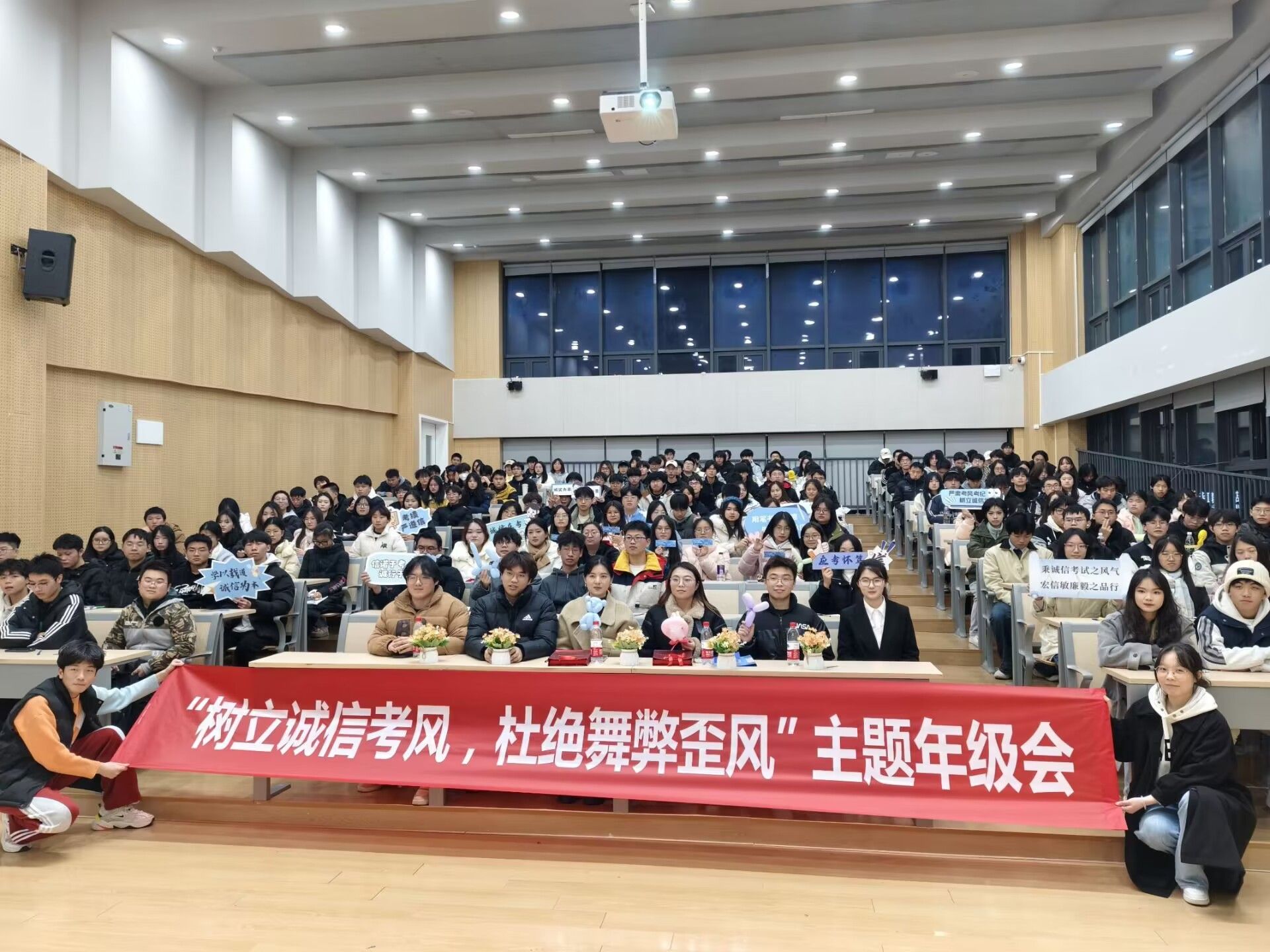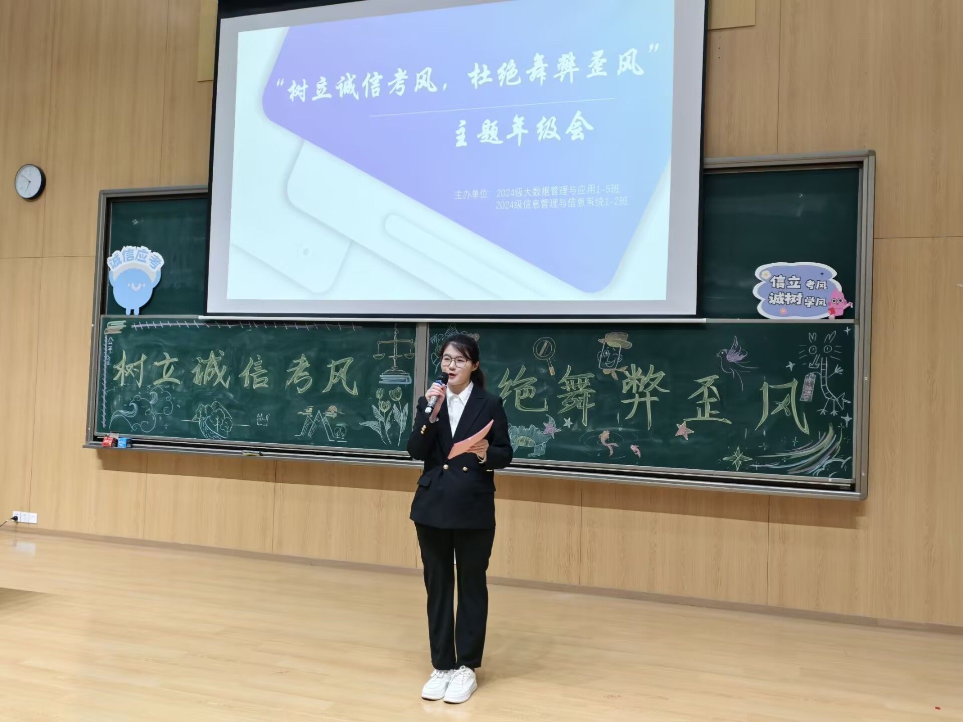 “人而无信,不知其可也。”诚信作为中华民族传统美德,在我国文化中具有极其重要的地位。如今临近期末考试月,为强调考风考纪,贯彻诚信考试理念,同时加强学生的道德品质建设,营造良好的校园风气,延续传统美德,2024级大数据管理与应用1-5班、信息管理与信息系统1-2班全体学生于2024年12月15日在玉棠书院阶梯教室成功举办一场以“树立诚信考风,杜绝舞弊歪风”为主题的年级会,数字经济与信息管理学院志愿服务板块指导教师张静作为嘉宾出席本次年级会。