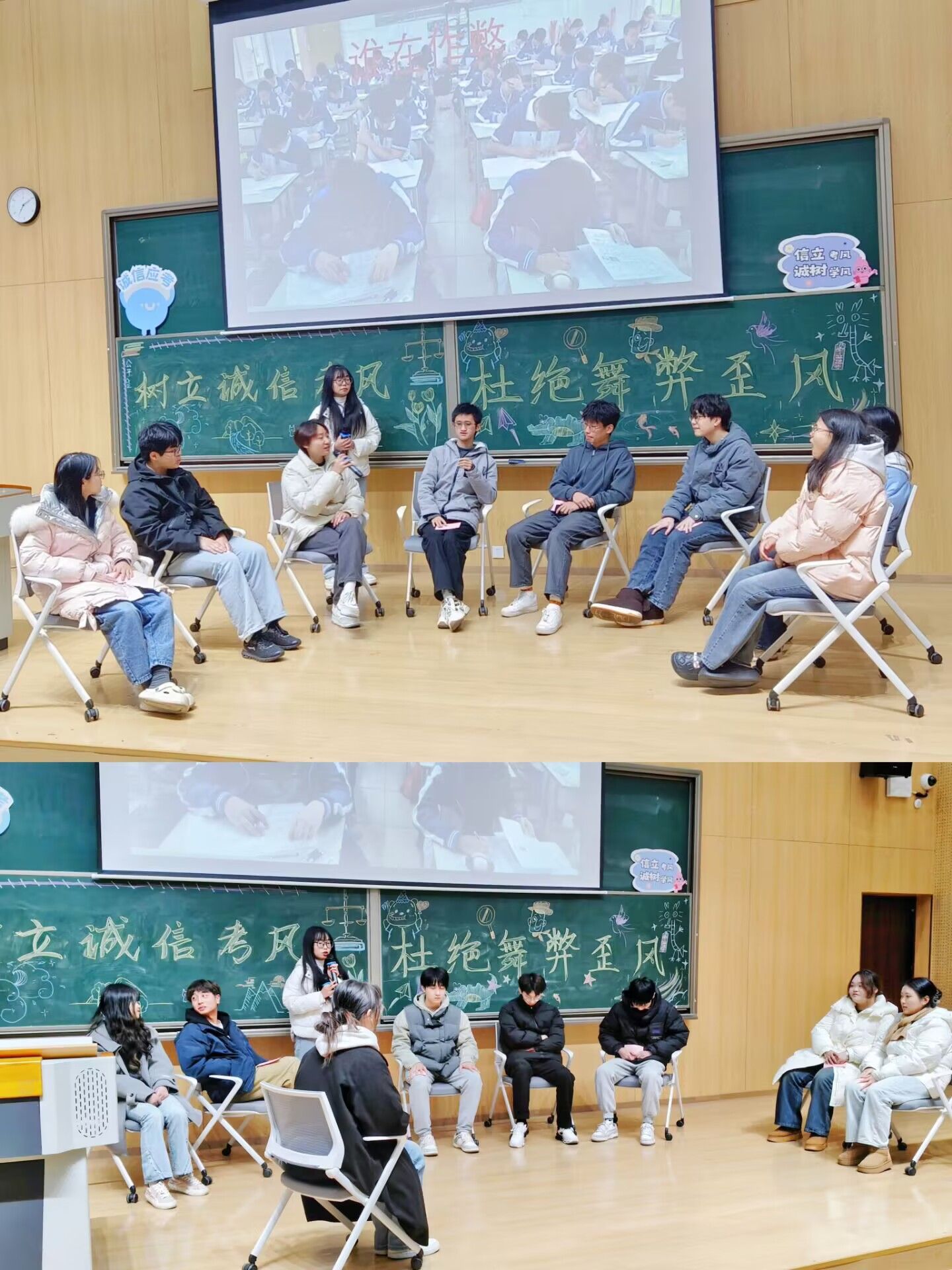 为加深各位同学对诚信考试这一理念的认知,活动进入诚信知识问答环节。“诚信考试的含义?”“诚信考试的具体体现?”等,共10个选择题和3个简答题。同学们积极举手抢答,现场氛围活跃热烈,一个个答案体现着同学们对诚信考试的深刻理解。随后各位同学在组内进行激烈探讨,各抒己见,在便利贴上写下自己对诚信的理解,并分享自己知道的诚信故事,或是名不经转的普通人,自尊自省,默默坚守诚信底线,或是家喻户晓的名人,用榜样的力量照亮诚信之路,赓续诚信之魂,我们传唱他们的故事,让诚信之花葳蕤盛开。