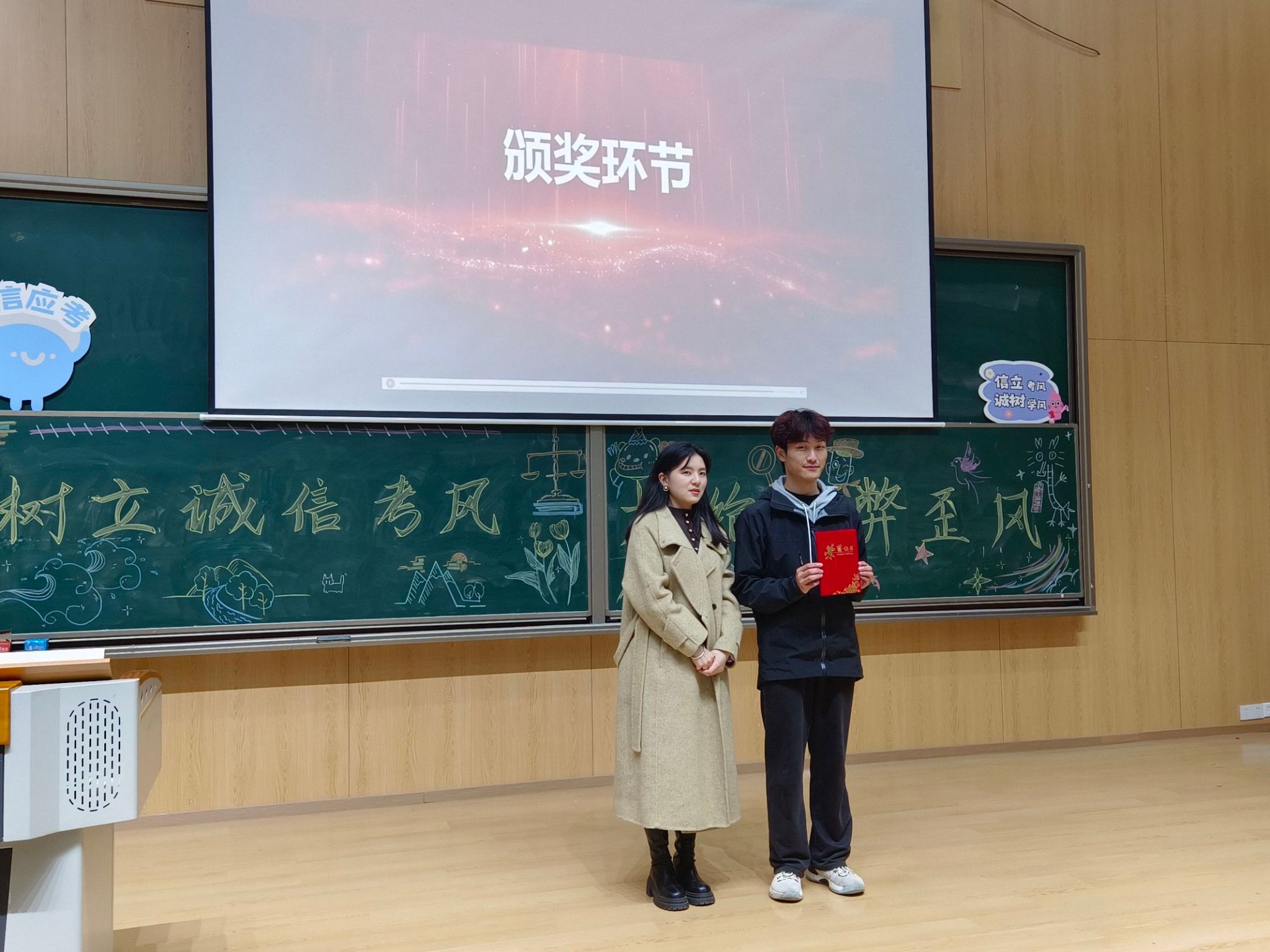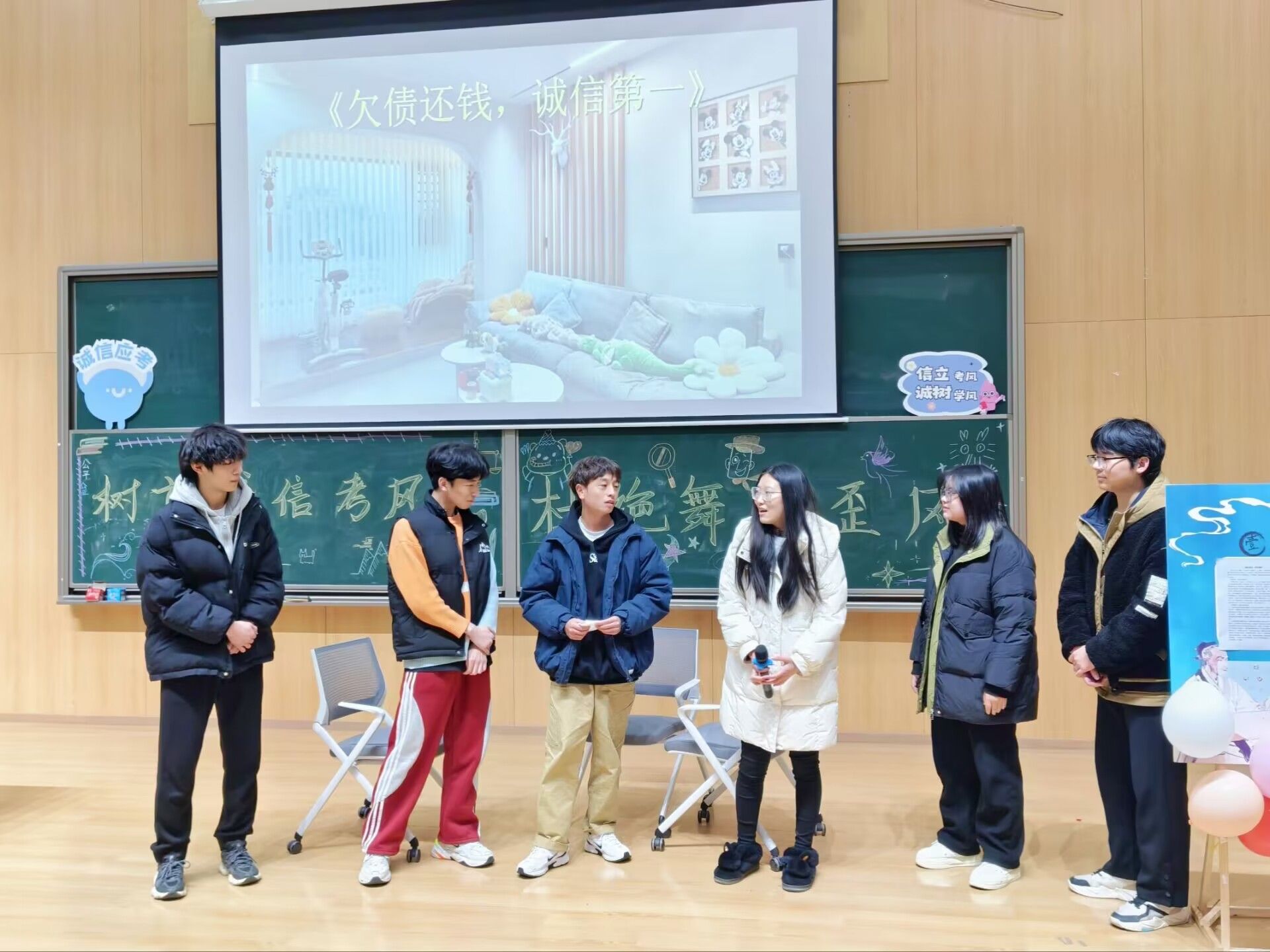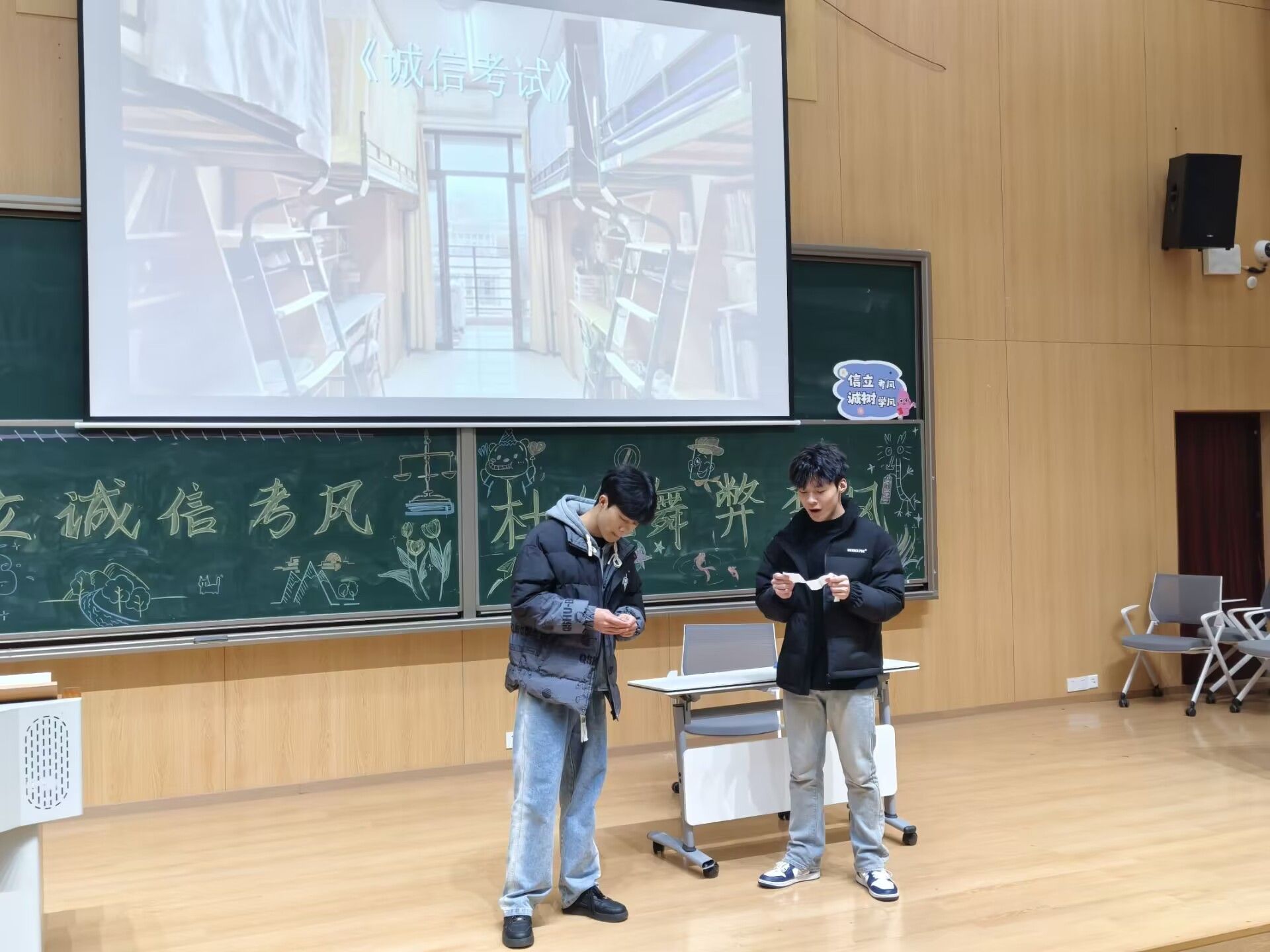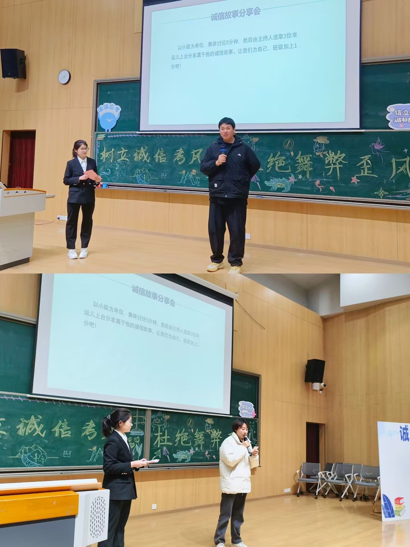 活动现场布置温馨,阶梯教室门外,各位同学在打卡墙前合影留念,教室内的大屏幕上放映着各班诚信班会视频,生动有趣,展示各班风采,回忆着往日的欢乐。四周陈列着各位同学自愿投稿的手抄报以及征文,情文并茂,在一笔一画中传达着为人者必言而有信的理念,同学们有序地入场进行参观,同时为征文进行投票。作为一名学子,诚信参考不仅是对个人学习成果的检测,更是对个人品德修养的重要考量。“人无信不立,国无信不强。”主持人刘佳怡引用这句古言向大家传递诚信参考的重要性,年级会的序幕由此正式拉开。