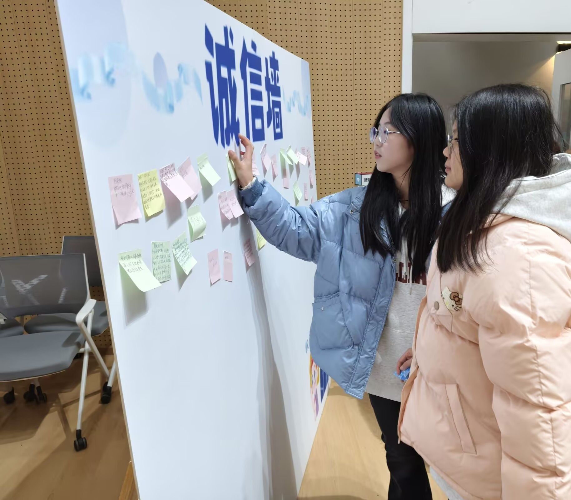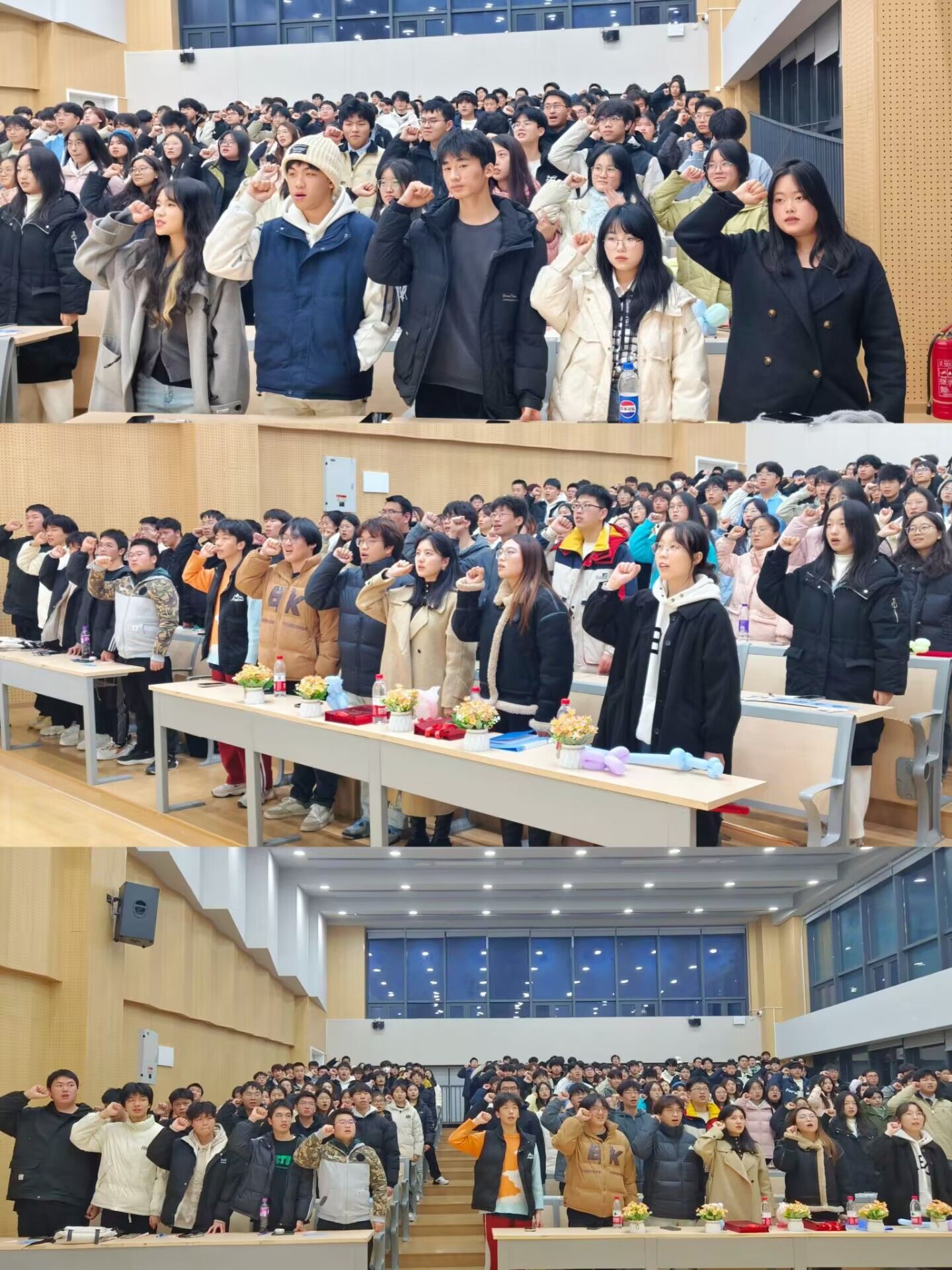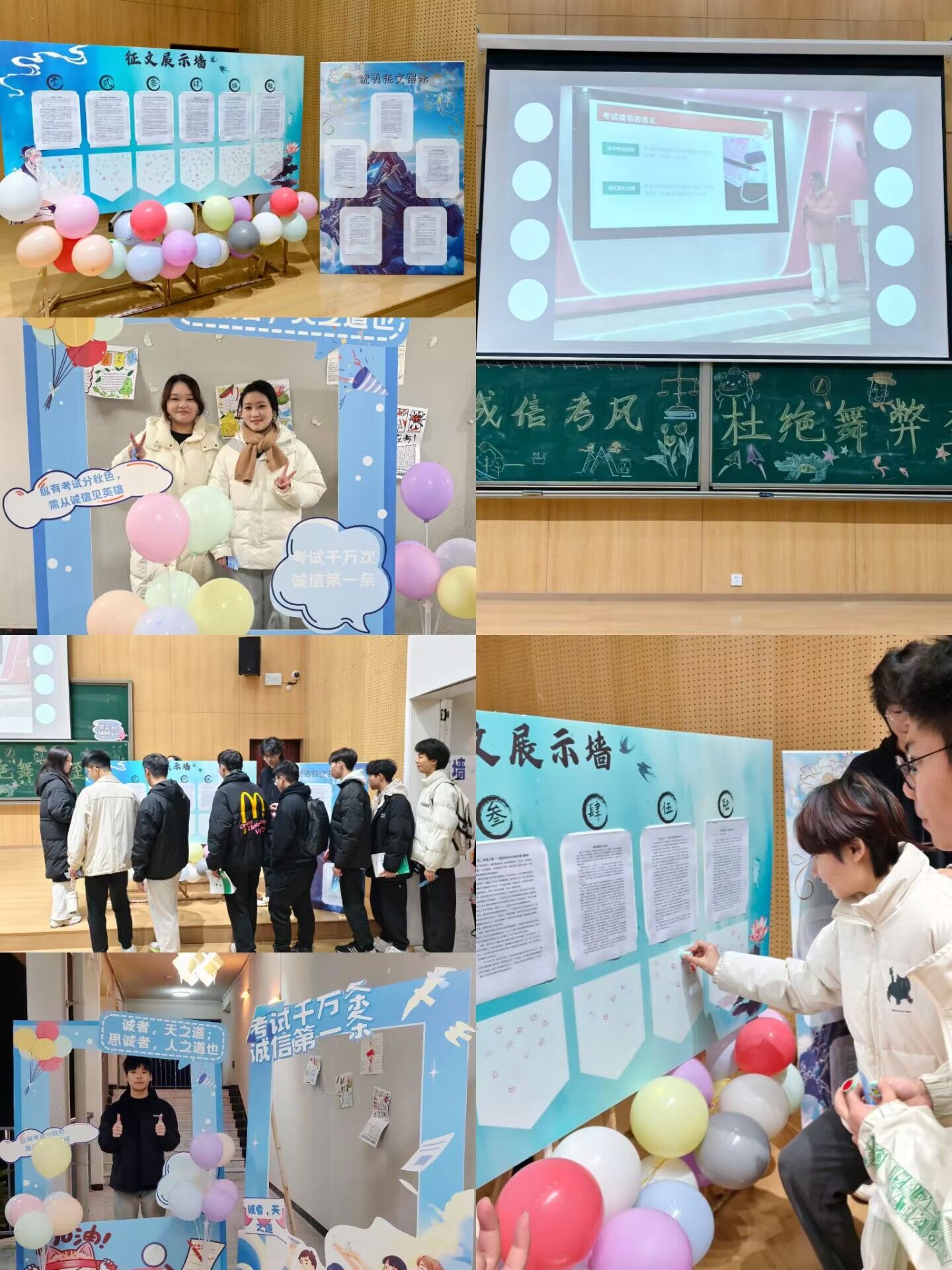 活动逐渐步入尾声,辅导员彭仙老师在总结中引用“车无辕而不行,人无信则不立”来表达诚信这一优良品质的重要性,并对各位同学寄予厚望,希望在接下来的期末考试中各位同学秉承诚信考试的原则,共同维护考试的公平性,用真实的成绩证明自己的实力,让诚信的火花温暖寒冷的冬日。随后,全体起立,庄严宣誓,“我郑重承诺,在考试中奉守诚实原则,自觉约束、规范自己的言行,严格遵守考试纪律...”,共同许下誓词,将诚信考试理念内化于心,外化于行。在一片欢声笑语中,本次年级会缓缓落下帷幕,美好的时光总是短暂的,但是我们用相机定格这一瞬间,便成为了永恒,各位同学离场时在诚信墙上贴下写着属于自己的诚信誓言。