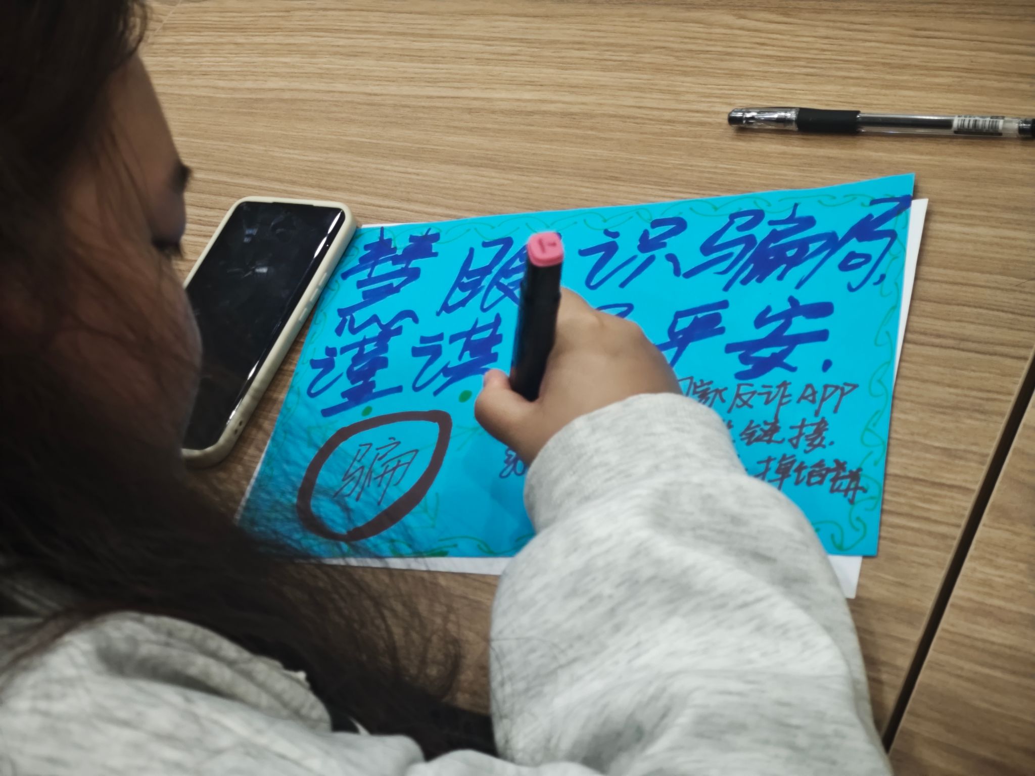 活动现场气氛热烈,同学们满怀期待。随着主持人开场致辞完毕,“慧眼识诈护青春”反诈知识问答活动正式拉开帷幕。 当下校园诈骗频发,网络诈骗占比颇高。志愿者们通过展示真实案例,深入剖析诈骗分子狡猾的作案手段,让同学们深刻认识到诈骗近在身边,其隐蔽性和危害性不容小觑。“知识问答”环节更是激发同学们对活动的参与热情,现场氛围紧张而活跃;宣传标语制作环节则尽显同学们的创意与智慧。丰富的互动环节不仅为活动增添活力,也让同学们在交流合作中深化了反诈认知,共同为营造安全和谐的校园环境助力。