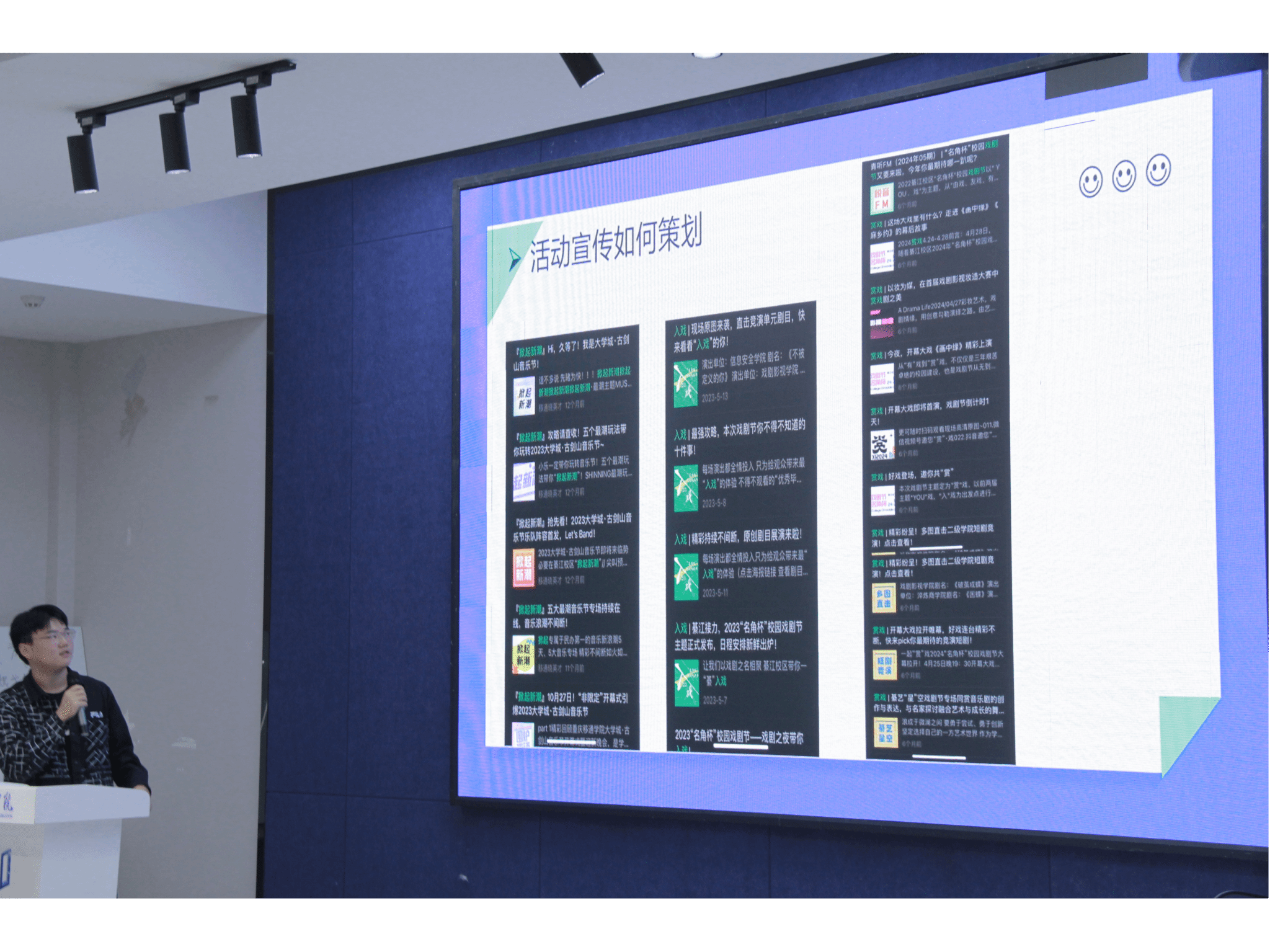 卢彬同学以自己的活动宣传经验为例,阐述了2023古剑山音乐节、名角杯戏剧节等大型校园活动的宣传推文宣传策划思路,总结出了活动宣传的相同点,