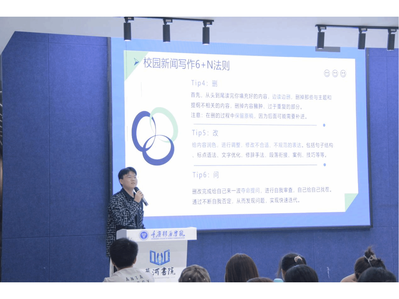 客观、真实是新闻稿的核心,那思考则是新闻稿的灵魂。卢彬同学以新闻写作“6+N”法则,分享了他的写作心得。即“思”——深度挖掘并明确核心主题;“列”——巧妙利用小标题来组织内容;“堆”——广泛收集并整合所有相关信息;“删”——在审阅过程中边读边精简,去除冗余;“改”——对内容进行细致润色,提升表达质量;“问”——通过自我审查确保内容的严谨性。卢彬同学通过六个实用的Tips,为写作新手同学们构建提供了清晰的逻辑框架。而对于“N”,它则象征着无限的雕琢空间,让新闻稿在逻辑清晰的基础上,通过不断的完善与调整,达到更加精致与完美的状态。通过理论与实例相结合的方式,卢彬同学使复杂的新闻写作知识变得易于理解,为学生干部们提供了宝贵的实践指导。