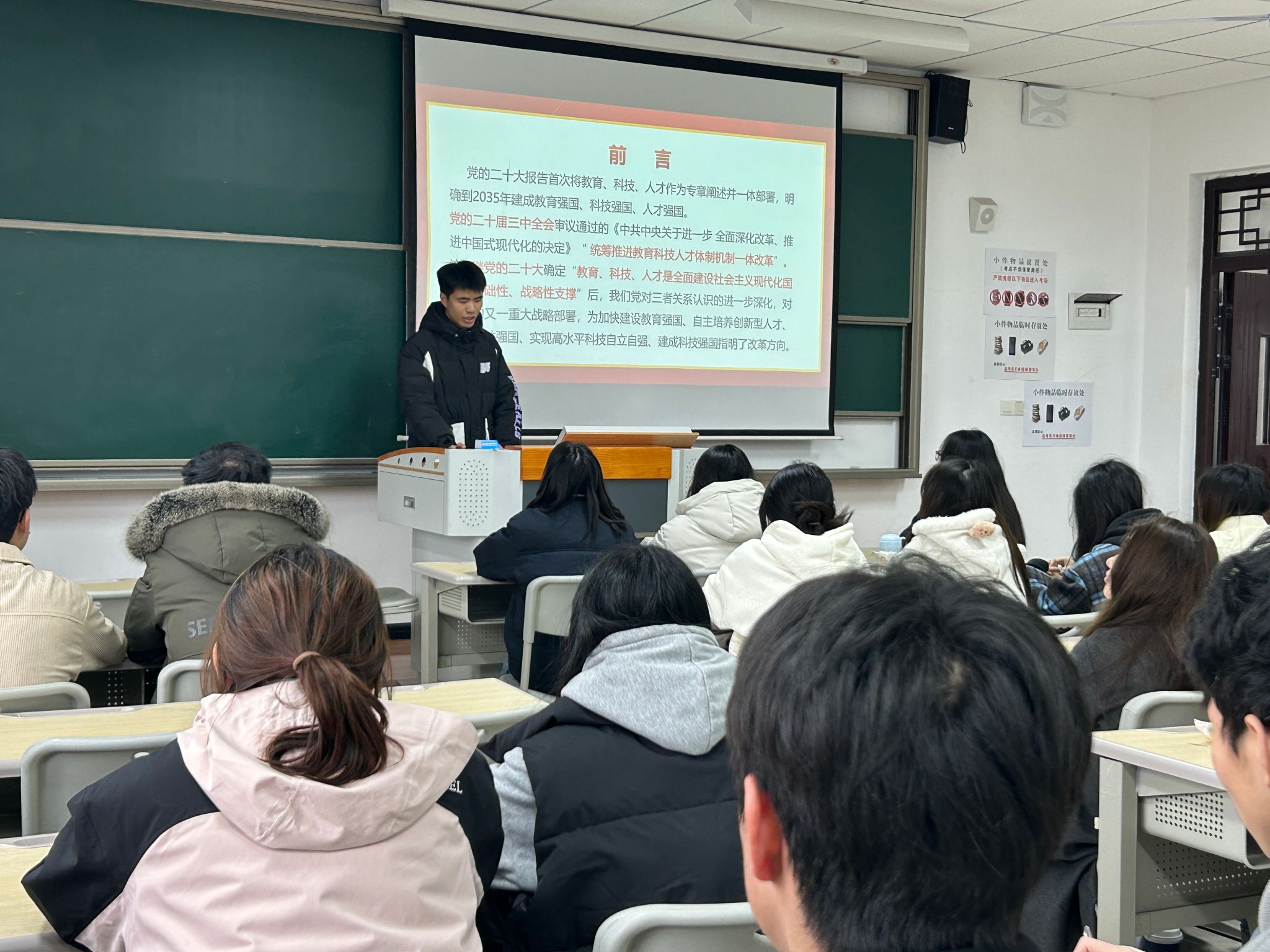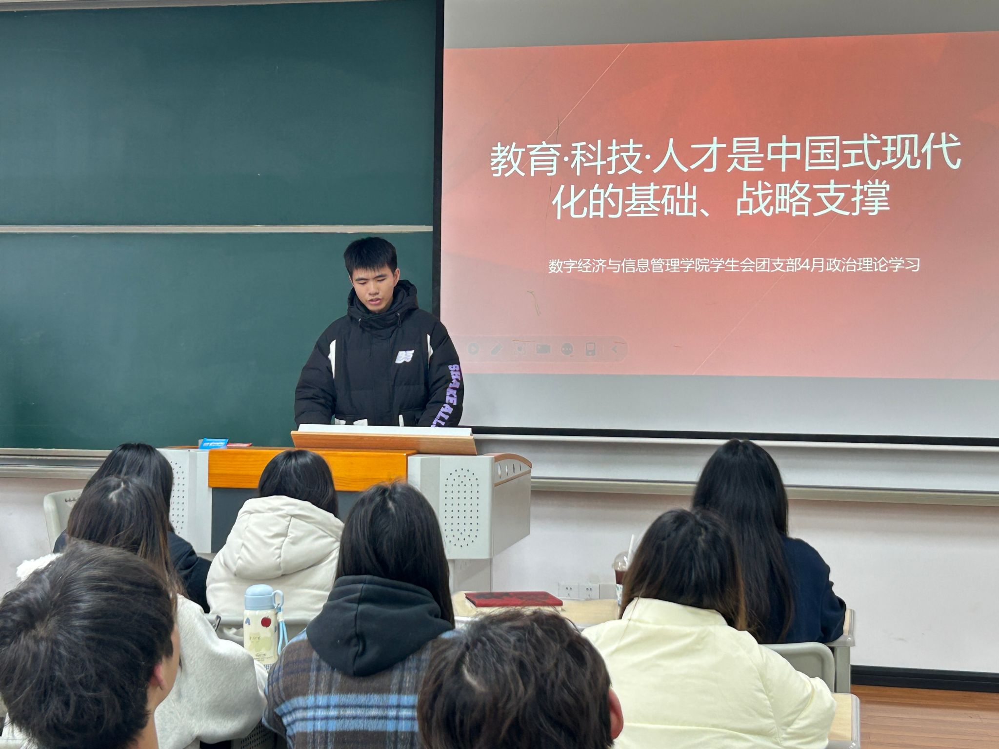 近日,数字经济与信息管理学院学生会团支部在学生会主席张祥的组织带领下,开展了一场以“教育·科技·人才是中国式现代化的基础、战略支撑”为主题的政治理论学习活动。此次学习紧扣时代脉搏,深度解读政策方针,旨在引导团员青年明晰时代责任,积极投身于中国式现代化建设。