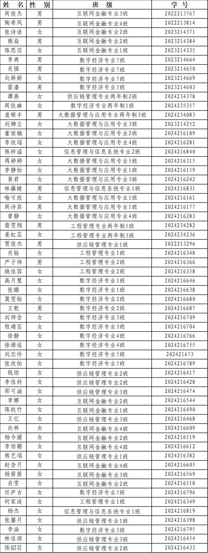为深入贯彻落实党的组织建设原则,进一步落实中共中央组织部、共青团中央《关于进一步加强推荐优秀团员青年大学生作党的发展对象工作的通知》 精神,促进我校“推优”工作制度化、规范化,建设一支数量充足、素质优良的入党积极分子队伍。经本学院团总支、团支部认真推选,现将数字经济与信息管理学院2024-2025学年春季优秀团员青年入党积极分子人员名单公示如下。