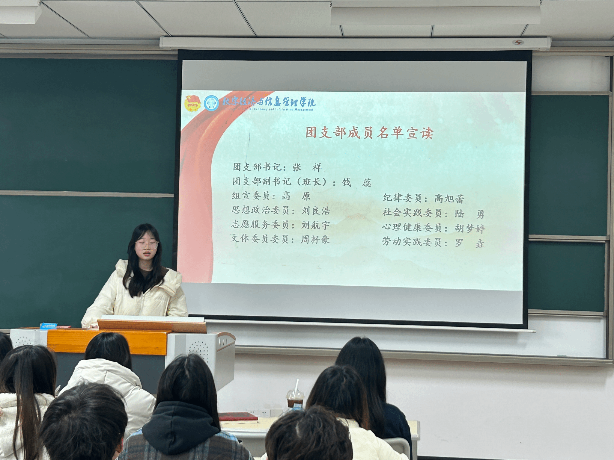 在热烈的掌声中,刘韵涵宣读了功能性团支部成员名单。新当选的团支部书记在发言中表示,将不辱使命,带领全体团支部成员,以实际行动践行共青团的宗旨,为学院的发展添砖加瓦,为同学们的成长成才搭建平台。