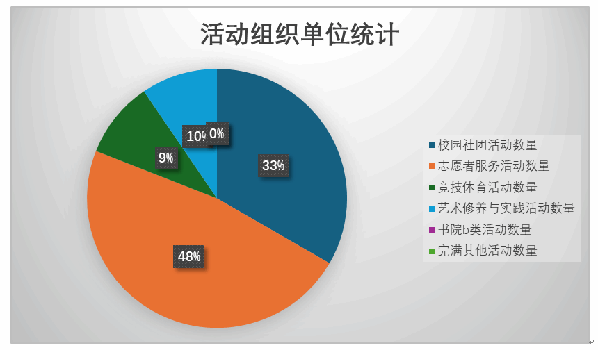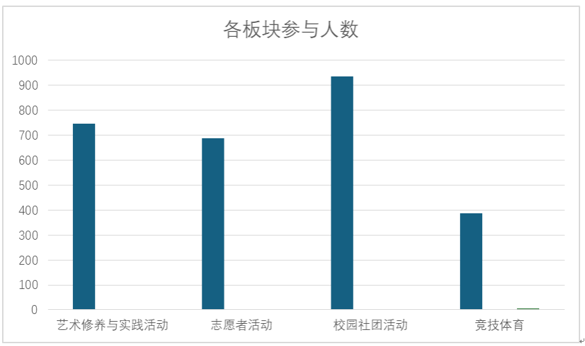 由这个月的数据来看,数信的竞技体育活动参与人数最少,可见,数信的小伙伴对体育竞技的重视度不高。在完满教育活动中,竞技体育是不可或缺的一部分,也是我们生活中的一部分。数信的小伙伴可以在学习的途中可以参加一些各色活动放松、丰富自己,同时也不要忘了学习,做到德、智、体、美、劳全面发展。