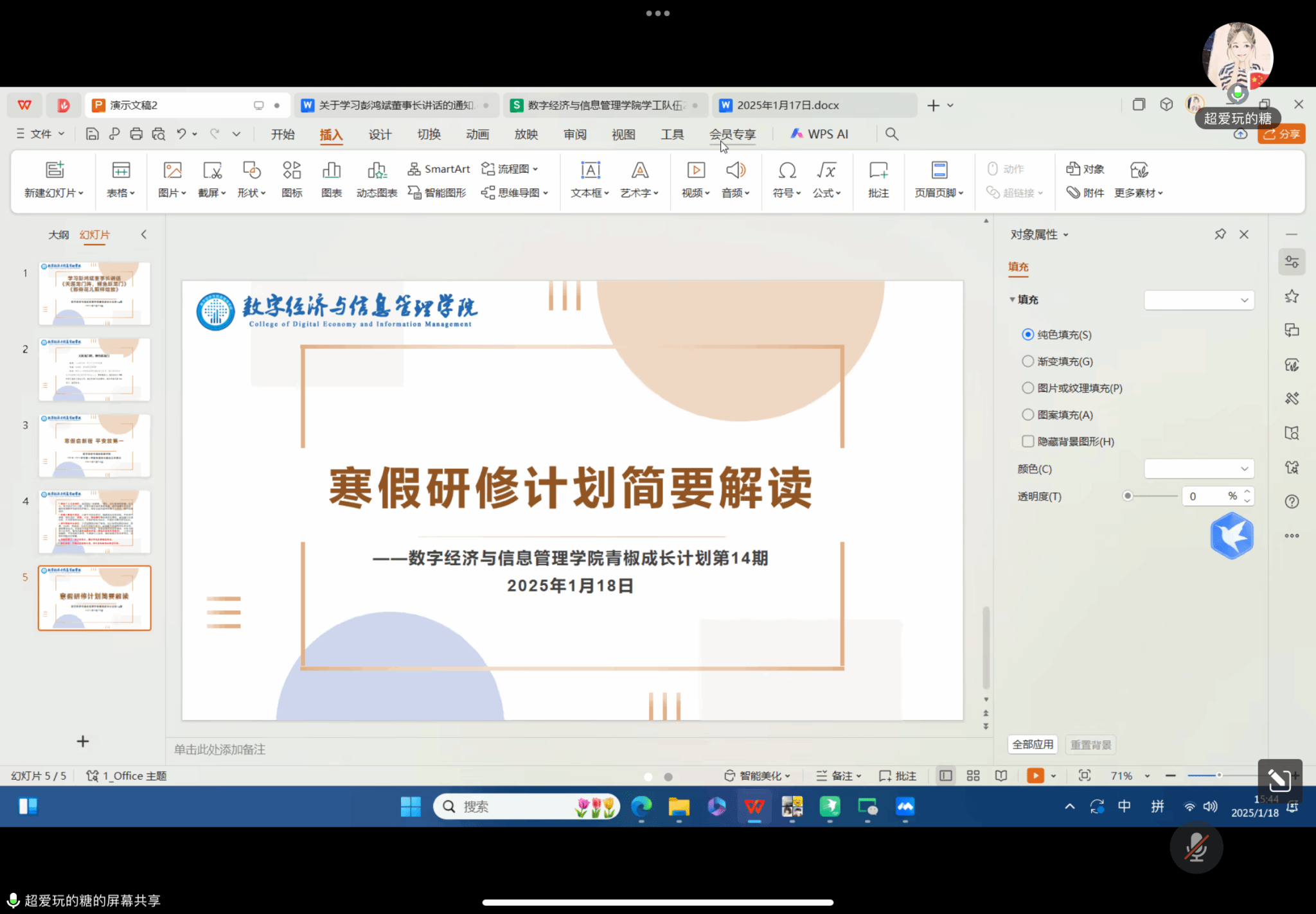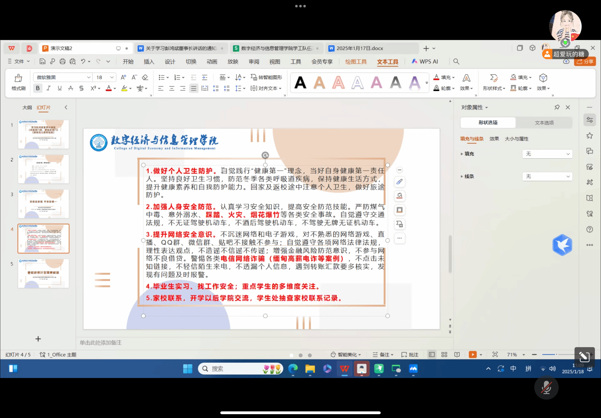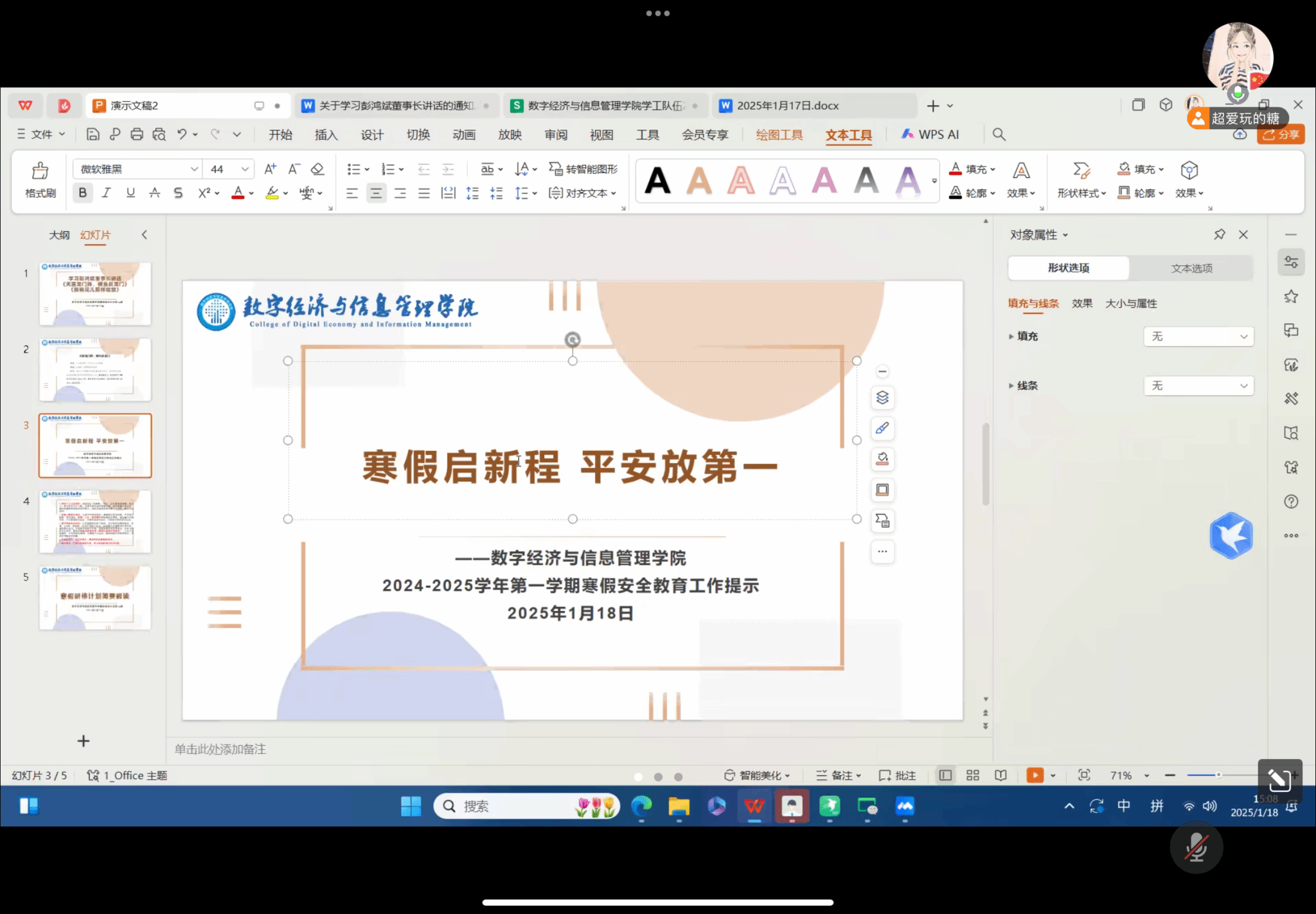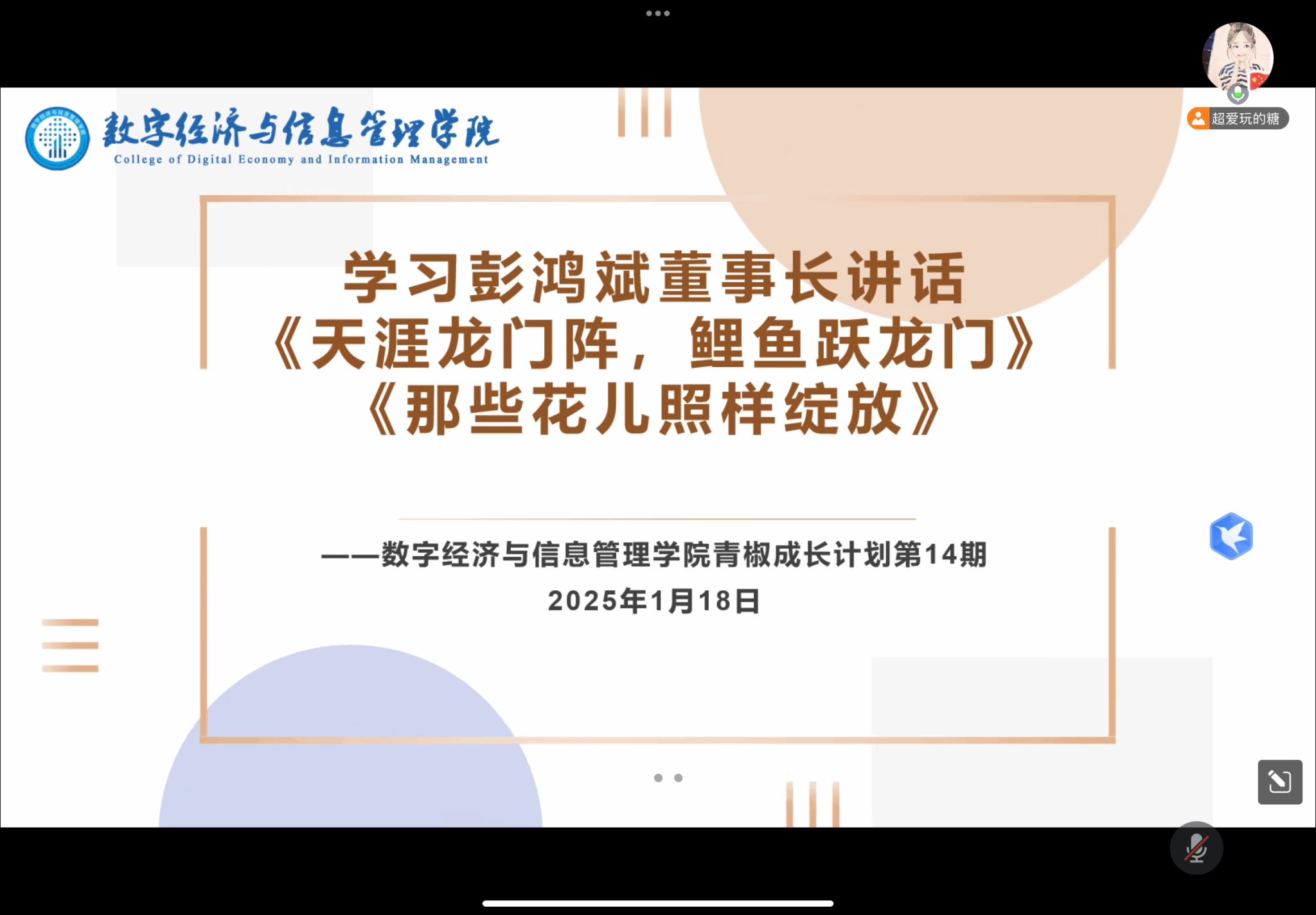 岁末年初,寒假将至,为确保各项工作平稳有序地开展,2025年1月18日下午15:00,数字经济与信息管理学院线上召开2025年寒假工作会议。会议内容包含董事长讲话精神学习、寒假研修工作计划解读及安全稳定工作部署。会议由学工副院长任瑞娟主持,双校区全体辅导员参加。