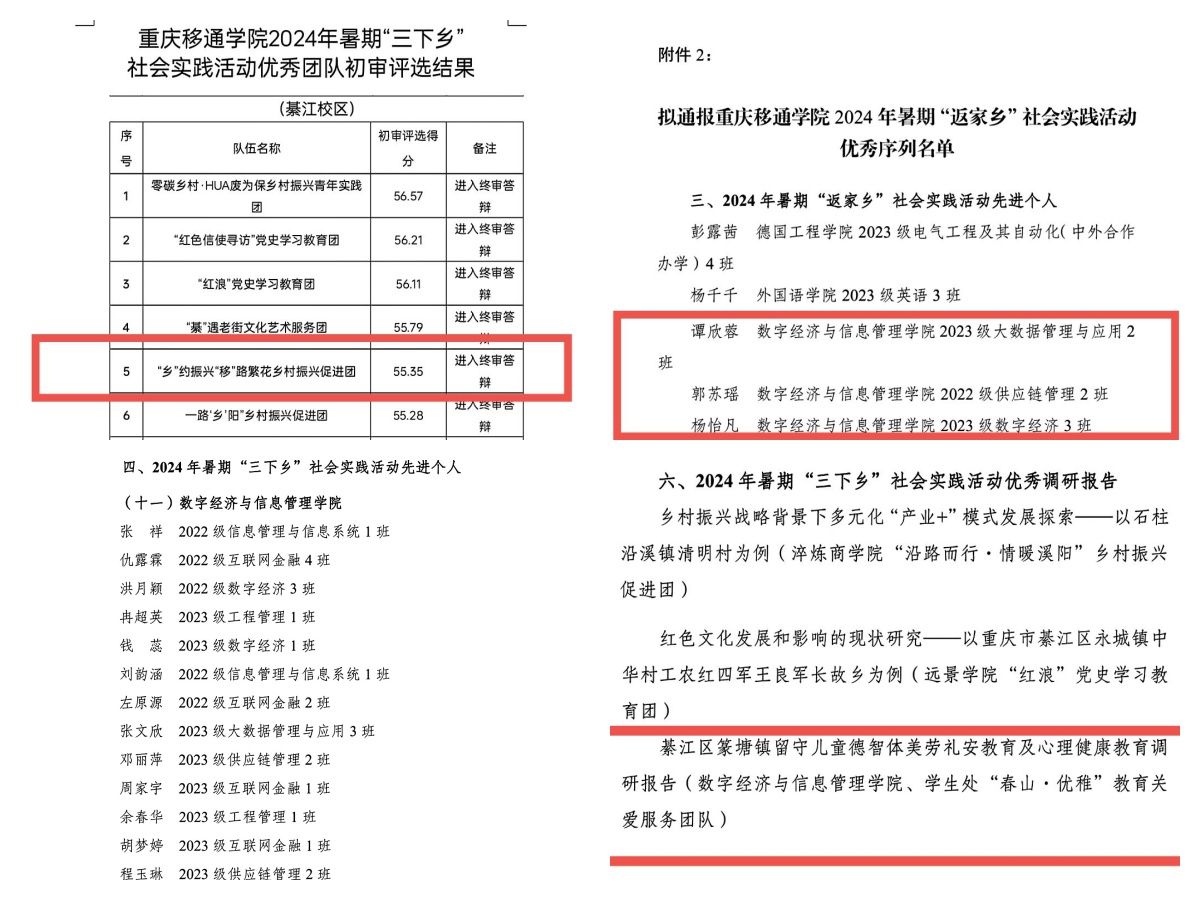 为进一步弘扬我校“完满教育”育人理念,提高我校实践育人工作成效,经校团委整体统筹,我院在2024暑期社会实践活动中共派出4支“三下乡”实践队伍以及300余名“返家乡”社会实践活动志愿者,分别围绕乡村振兴、国情观察、党史教育、教育关爱等主题,深入基层一线,广泛开展各类实践活动。在“学习强国、三下乡网、多彩大学生、重庆綦江共青团”等国家级、省市级外媒平台活动累计发送推文118篇,其中外媒平台推送20余篇,抖音直播观看人数2000+,点赞20w+。此外,我院还荣获“优秀组织单位”称号,“春山·优稚”团队获“优秀调研报告”奖,张静老师获“优秀指导老师”称号,14名同学获“先进个人”荣誉,3名同学获“返家乡”先进个人称号。