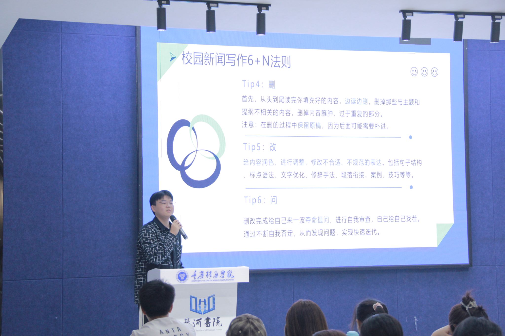 为进一步提升学院宣传工作的质量,增强学生干部的新闻写作能力,数字经济与信息管理学院于10月9日晚在綦河书院成功举办了“信鸽计划”第二季第一期“聚‘微’成长,遇见‘媒’好。本次活动特别邀请到校团委学生副书记卢彬作为主讲嘉宾,数信学院团总支学生会干部干事及基层班团干部参加。卢彬同学结合自己的宣传实践经验,从“从概念入手:新闻稿”“思考:如何写出来”“几点实用小技巧”“活动宣传如何策划”“终极大招”五个方面入手,阐述了培训主题“如何写出一篇合格的新闻稿”。学院宣传板块指导老师张倩进行了总结发言,她鼓励团干部们勇于实践,积极传播学院故事。活动现场气氛热烈非凡,团干部们积极参与互动,共同探讨宣传工作的优化策略。未来,数信学院将持续致力于培养新媒体人才,以更高的媒介素养和更专业的视角,讲述数信故事,传播数信声音,为学院宣传工作贡献坚实力量。