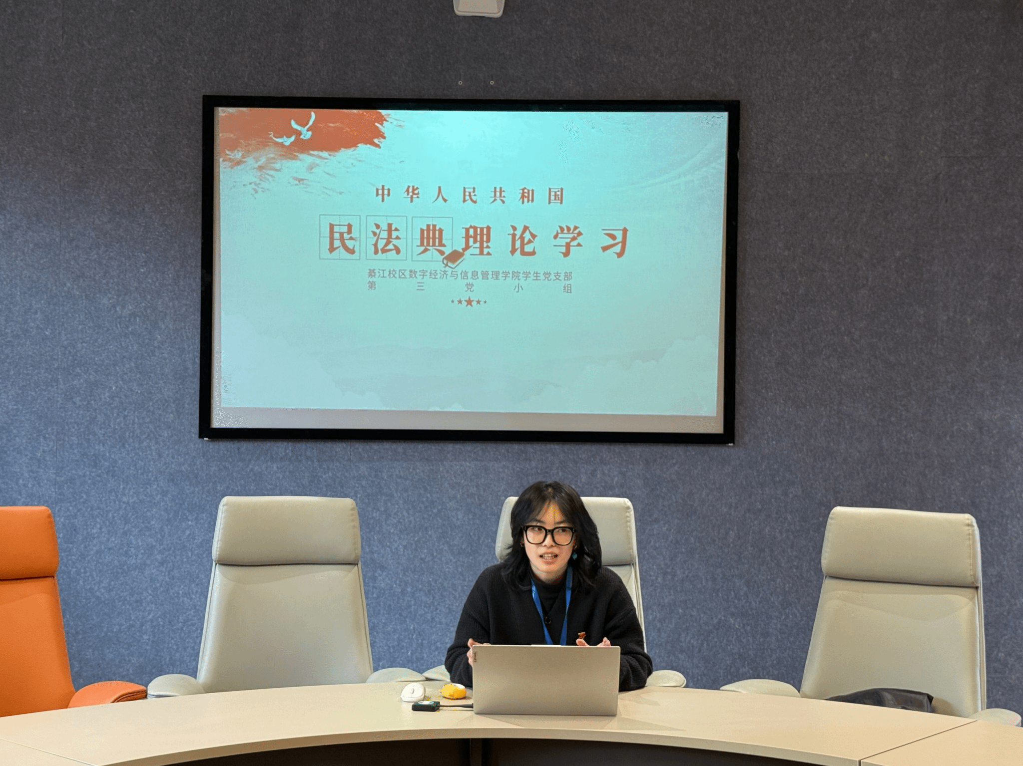为深入学习宣传贯彻《中华人民共和国民法典》,加强党支部在法治教育中的先锋引领作用,组织多样化理论学习活动,提升党员法治素养,以党建促法宣,营造良好法治氛围,在2025年3月6日13时,数字经济与信息管理学院学生党支部第三党小组的学生党员于古剑书院龙泉会议室开展了“学民法典,担法治责任”主题理论学习会,第三党小组全体学生党员参与此次会议。
