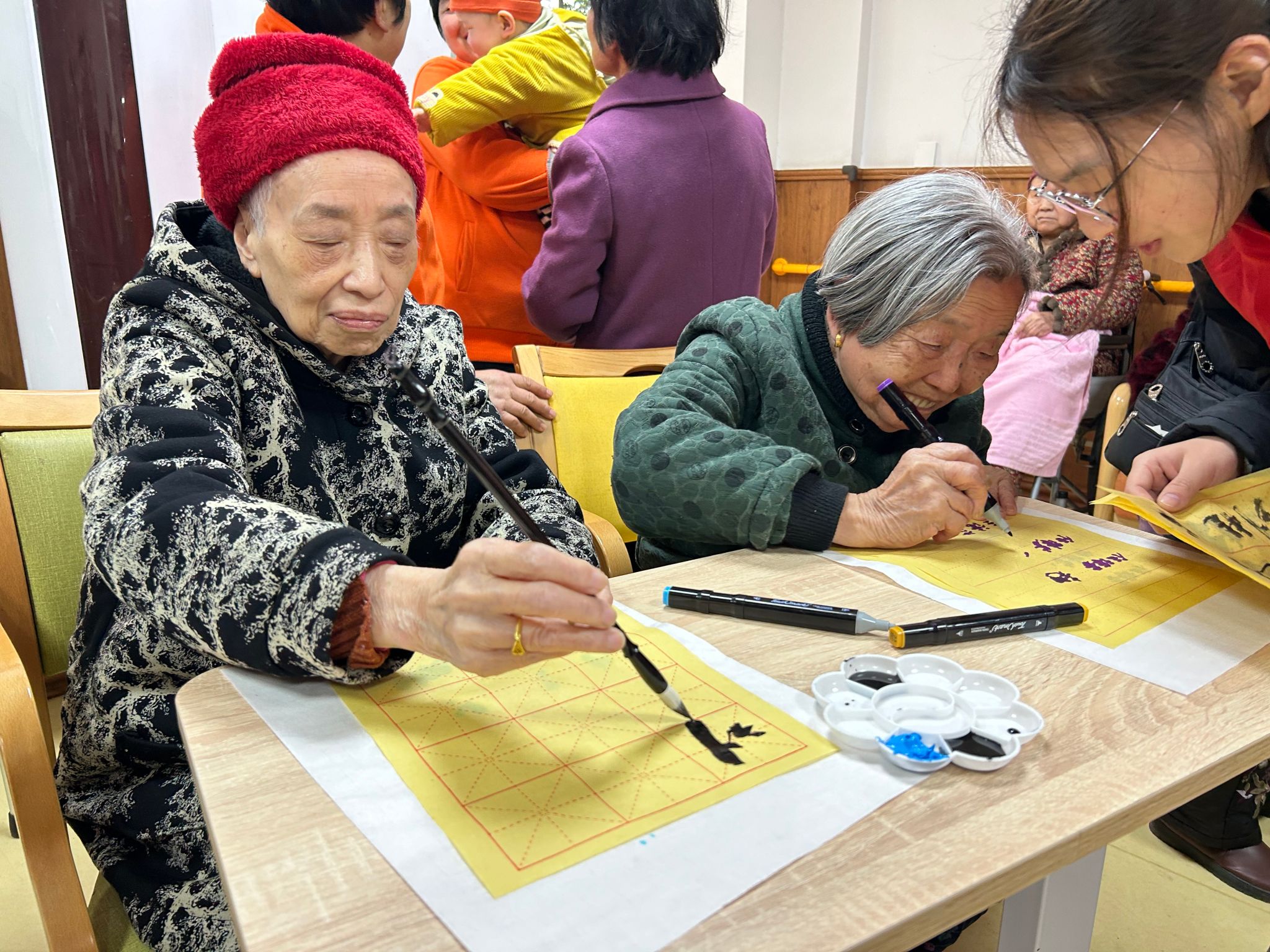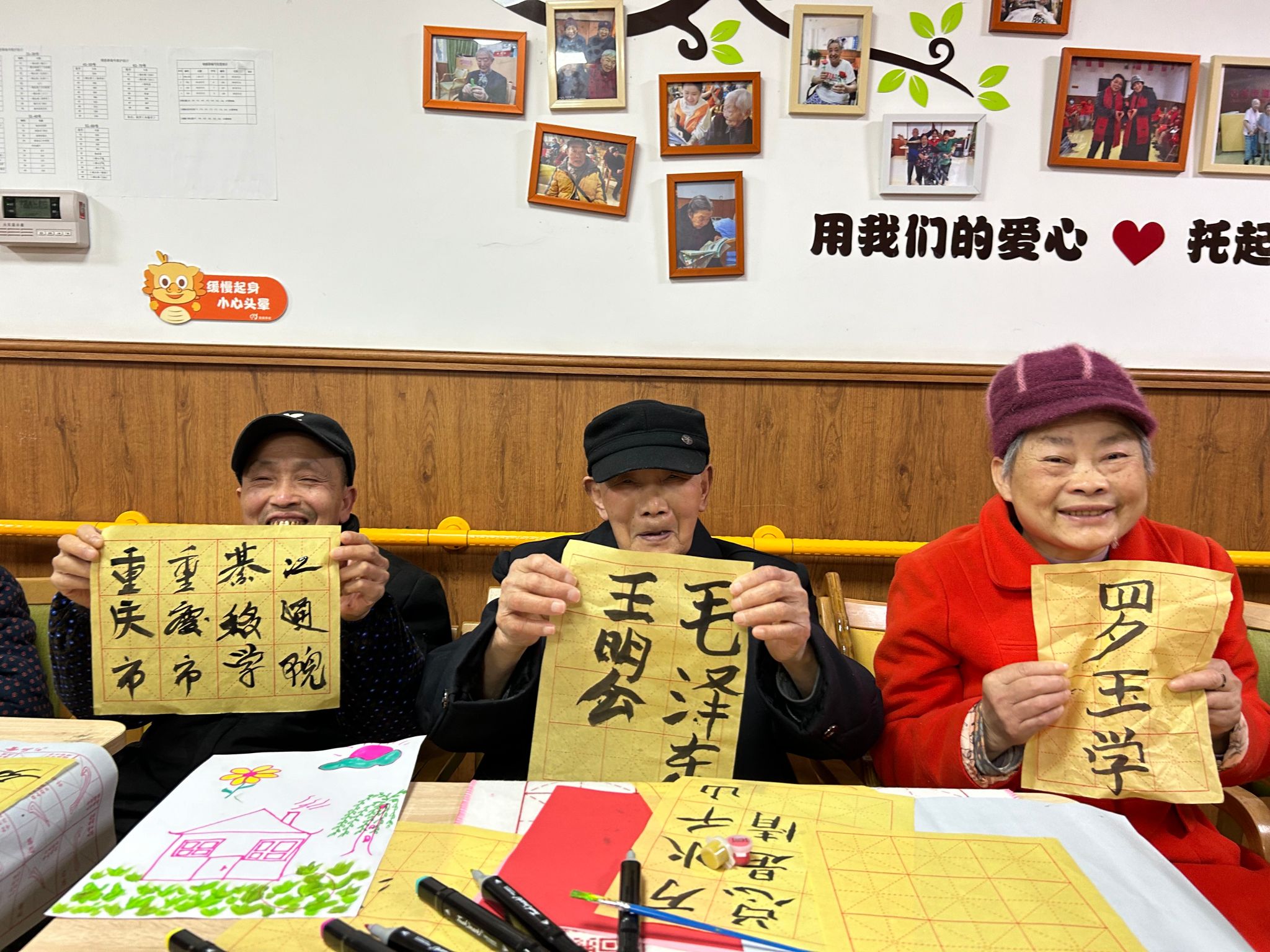 在创作环节,志愿者们根据老人的兴趣,悉心引导他们参与绘画、书法或涂色石膏娃娃等活动。以 “春天” 为主题,老人们纷纷拿起画笔、毛笔,尽情地挥洒心中创意。有的老人用细腻的笔触描绘出春日里盛开的花朵,有的老人则以苍劲有力的书法写下对春天的赞美之词。志愿者们在一旁耐心协助,与老人们亲切交流,倾听他们讲述往昔的故事,一同分享创作心得。在这一来一往的互动中,现场氛围温馨而愉快,老人们的脸上绽放着幸福的笑容,仿佛忘却了所有的烦恼。