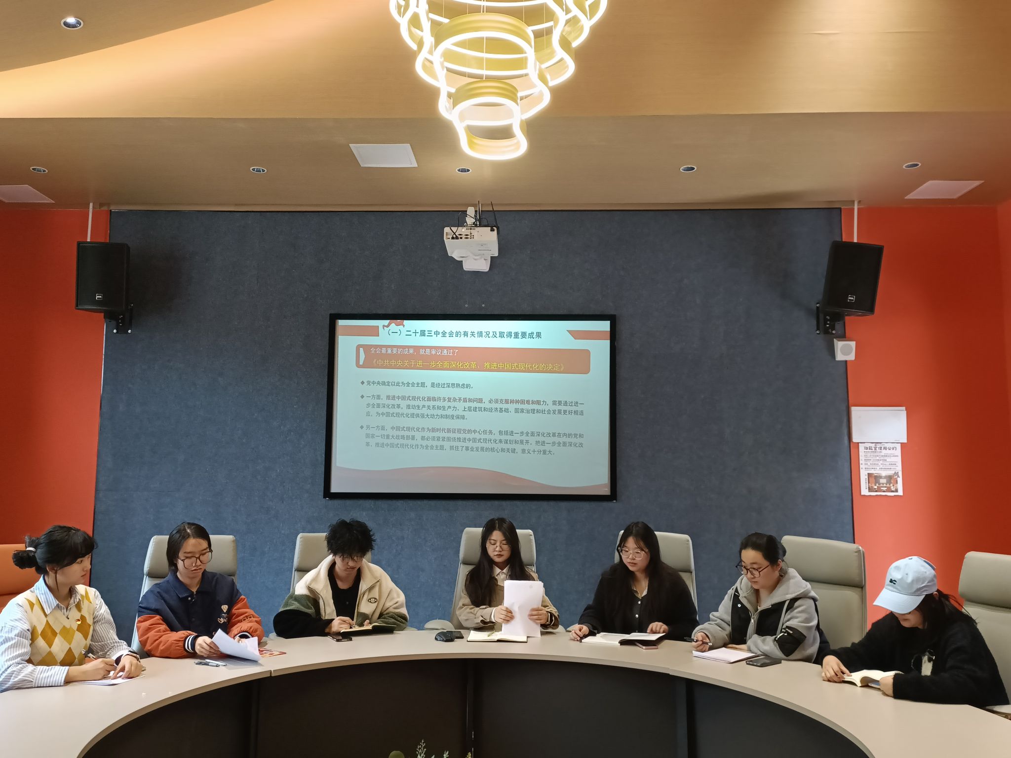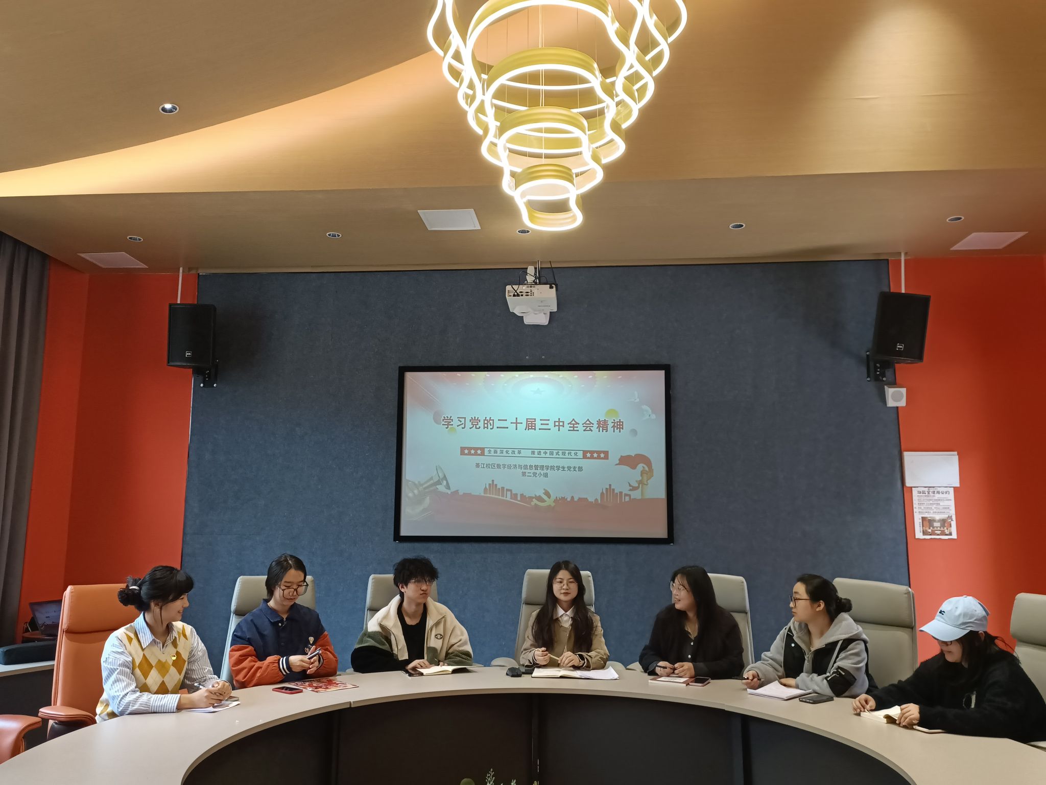 2025年3月12日12:30,数字经济与信息管理学院学生党支部第二党小组的学生党员们齐聚古剑书院龙泉会议室,共同开展了一场以学习党的二十届三中全会精神为主题的理论学习研讨会。此次活动旨在深入贯彻落实党的二十届三中全会精神,加强党支部在理论学习中的引领作用,提升党员的政治素养和理论水平,为推进全面深化改革贡献青春力量。