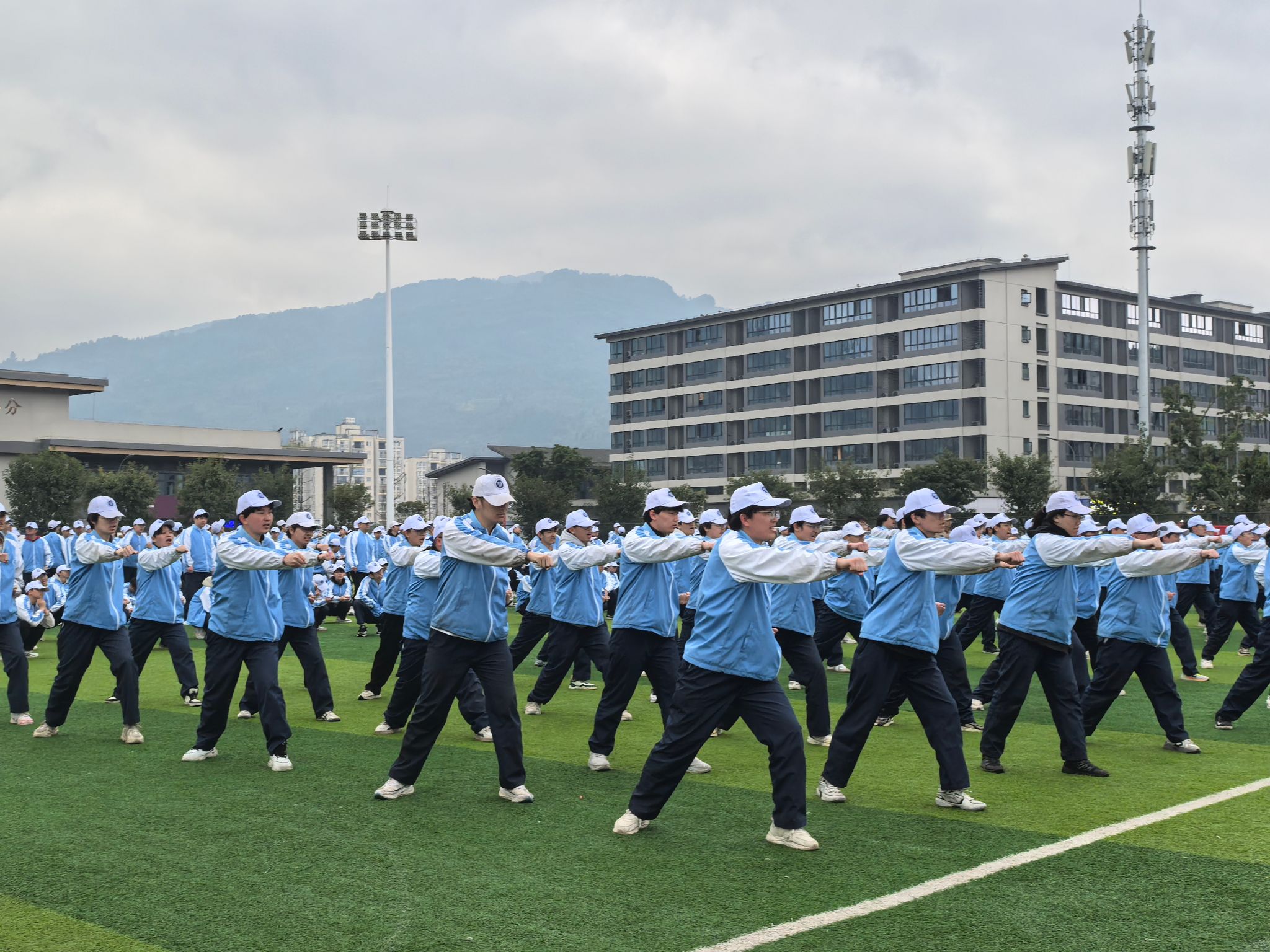 军体拳方阵中,同学们出拳刚猛,恰似猛虎出山,拳风呼啸,虎虎生威;踢腿凌厉,仿若闪电划过,刚劲有力。一招一式间,尽显阳刚之气,那蓬勃的朝气如同初升的朝阳,光芒万丈。他们的呐喊声整齐嘹亮,响彻云霄,仿佛在向世界宣告着青春的力量与热血。