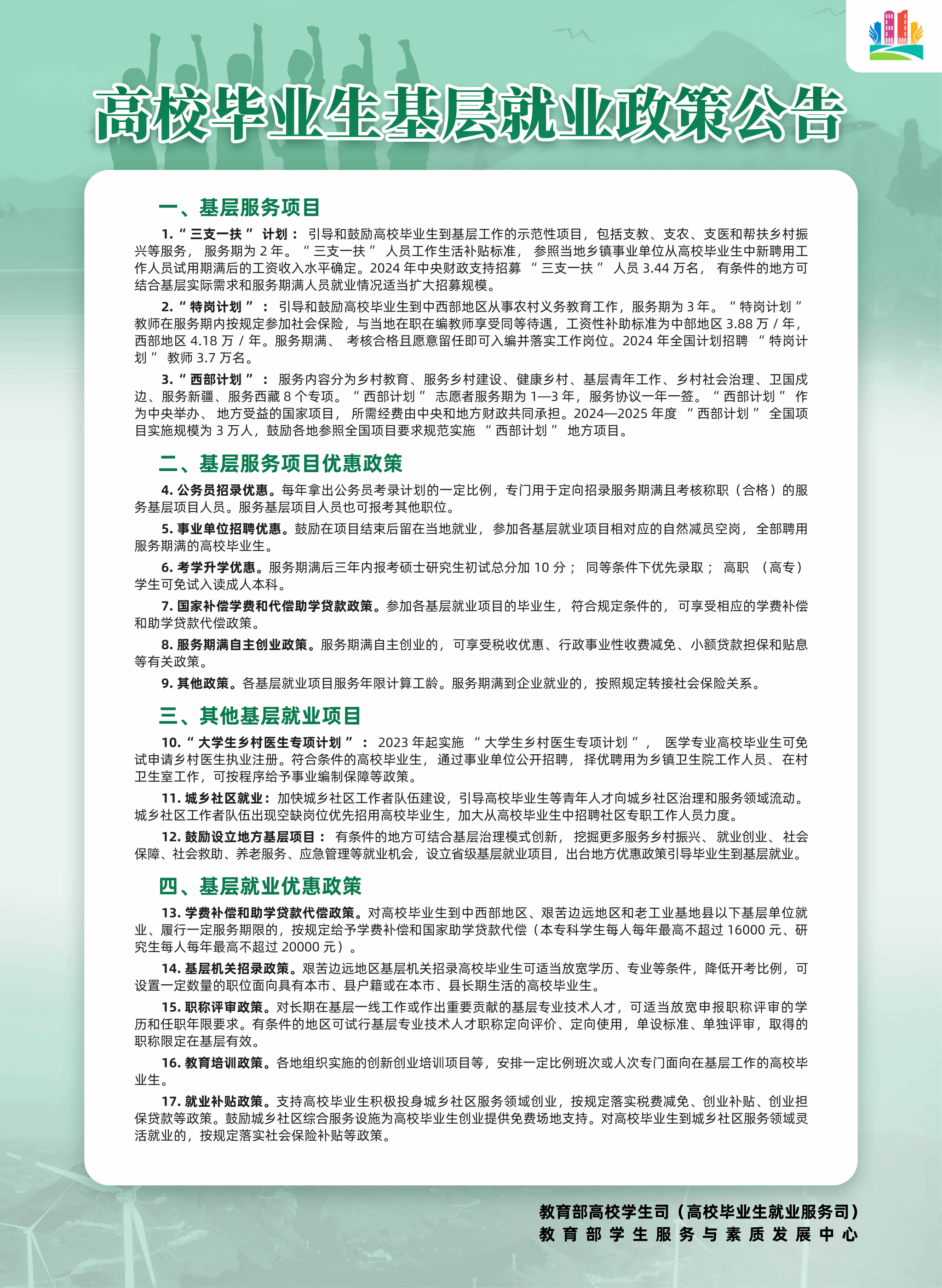 由教育部高校学生司、教育部学生服务与素质发展中心发布的《普通高校毕业生基层就业政策公告》。