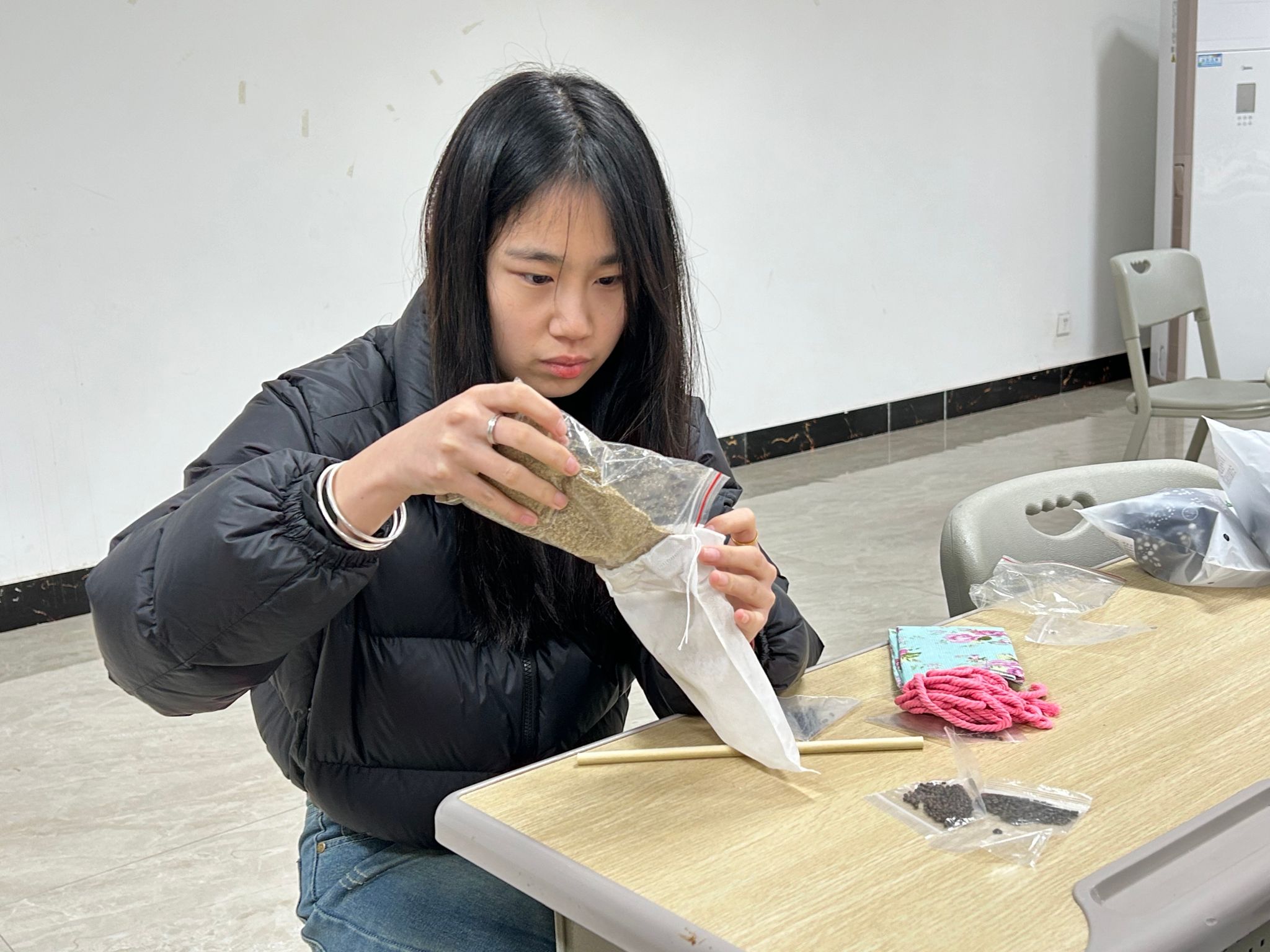 活动现场,志愿者们通过视频研学艾草锤制作技艺,将晒干艾草反复揉捻成紧实药芯,裹以素色棉布,再以彩线缠绕出吉祥纹样。支队同青协成员们在制作时感叹:“一缠一绕间都是心意,亲手做的礼物更能表达对老师平日辛劳的感念。”经过两小时精心制作,20枚兼具传统美学与养生功能的艾草锤渐次成型。