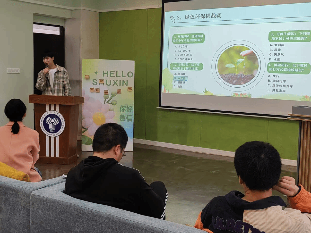当主持人宣布进入思维碰撞时刻——绿色环保挑战赛,全场氛围瞬间被点燃。此次挑战赛以趣味问答的形式展开,题目内容丰富,涵盖垃圾分类的精细知识,如不同材质垃圾的分类标准;可再生能源的广泛应用,像太阳能、风能在生活与工业中的具体利用等。这些题目不仅考验同学们对环保知识的储备,更注重对创意和灵活应变能力的考察。经过多轮激烈角逐,最终脱颖而出的同学成功捧走象征荣耀的“校园环保先锋”专属绿植盆栽。这盆绿植不仅是一份荣誉,更是对同学们环保知识与实践能力的高度认可,激励着大家在未来的生活中继续践行环保理念,成为绿色生活的倡导者和践行者。