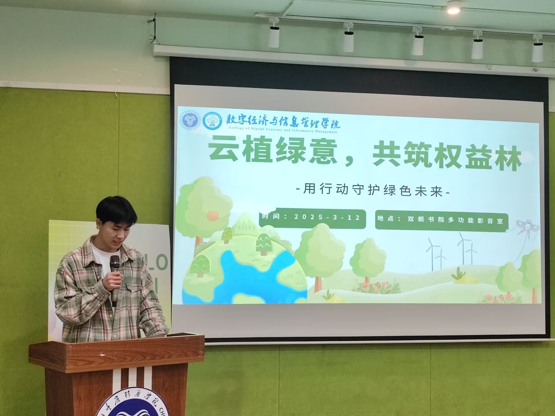 春回大地,万物复苏之时,第47个植树节如期而至。为增强同学们的环保意识,共筑美好家园。数字经济与信息管理学院的全体师生们怀揣着对大自然的热爱与对生态环境的责任感于2025年3月12日齐聚双栀多功能影音室,成功举办“云植绿意,共筑权益林”活动,以实际行动书写生态教育篇章。