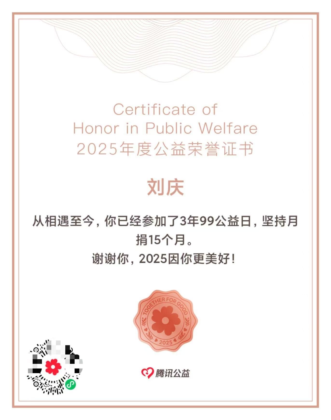 公益不是一时的热情,而是持之以恒的坚持。作为一名学生党员,她始终将帮助她人视为自己的责任与使命。自2023年起,她通过腾讯公益平台累计捐款70余次,用实际行动践行着“点滴爱心,汇聚成河”的信念。