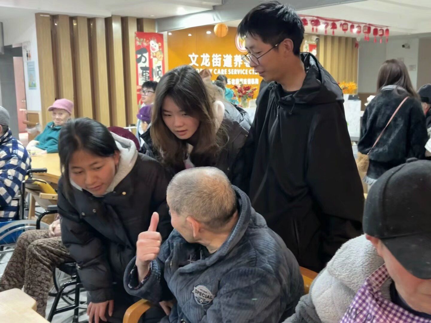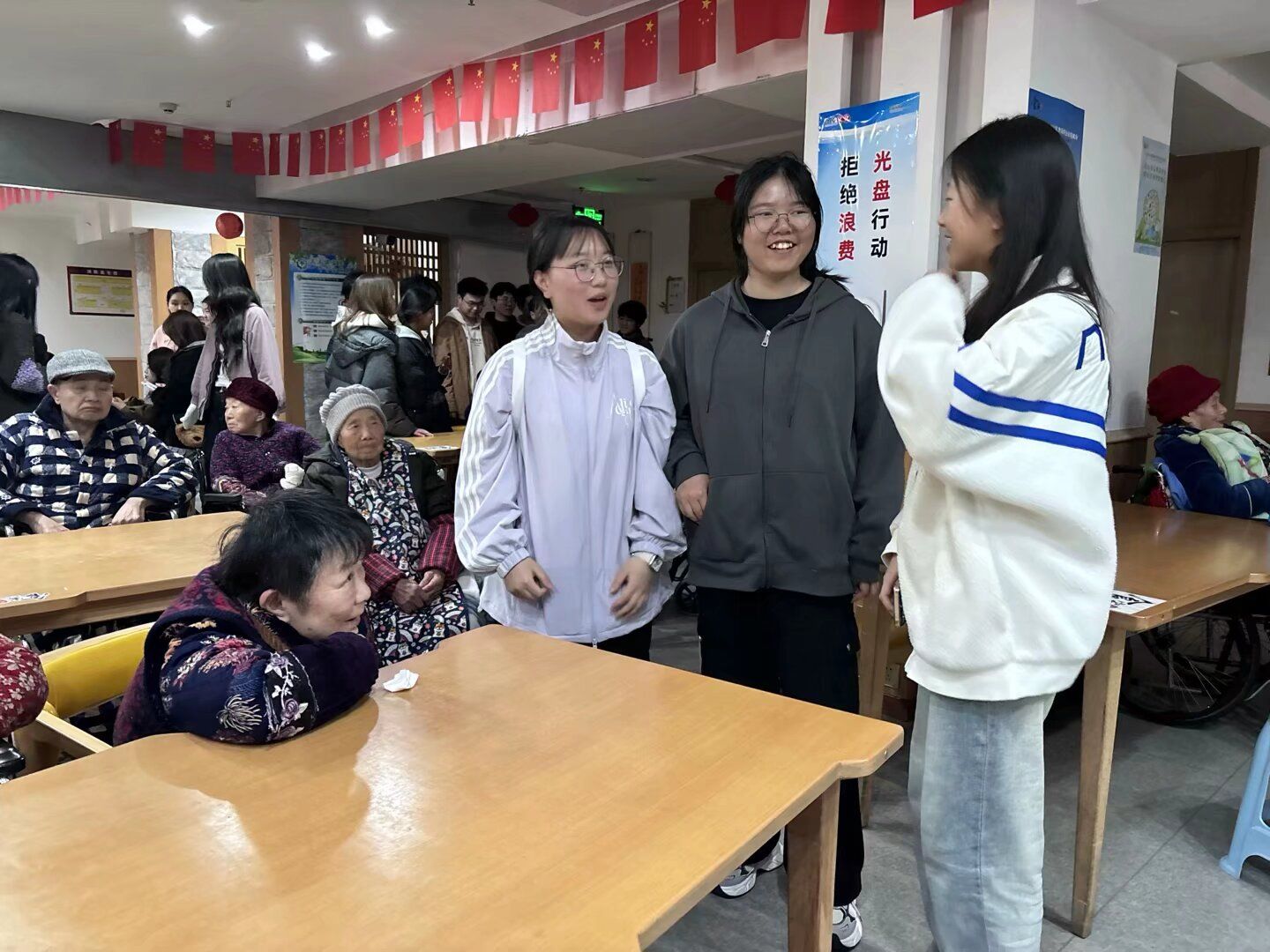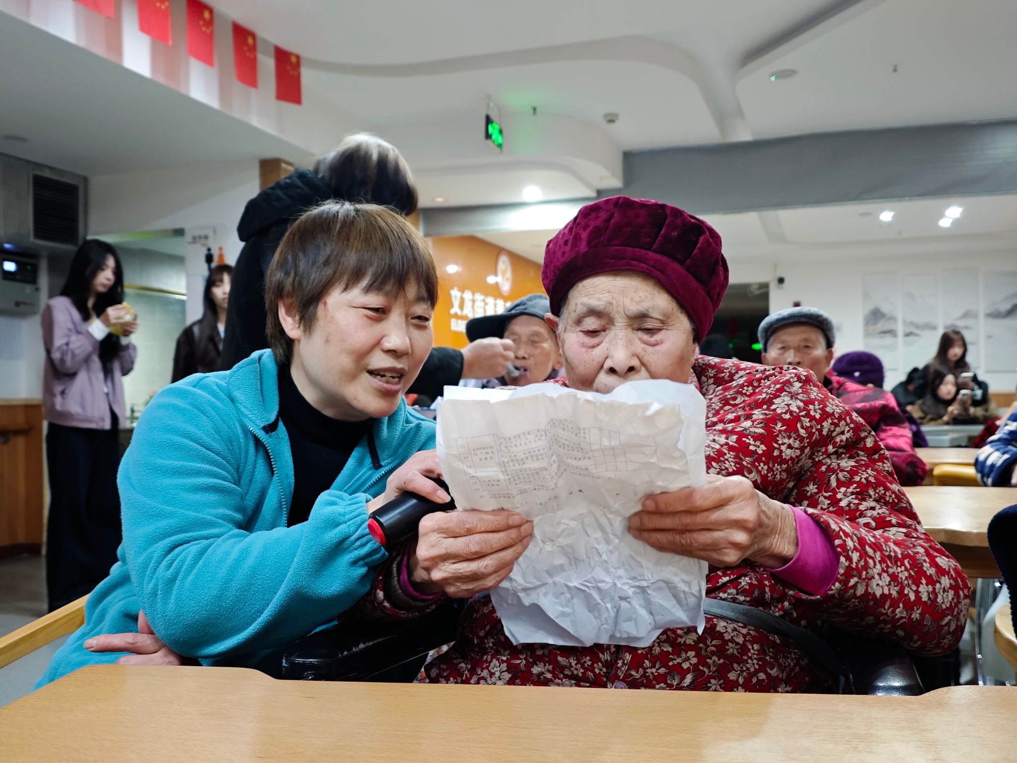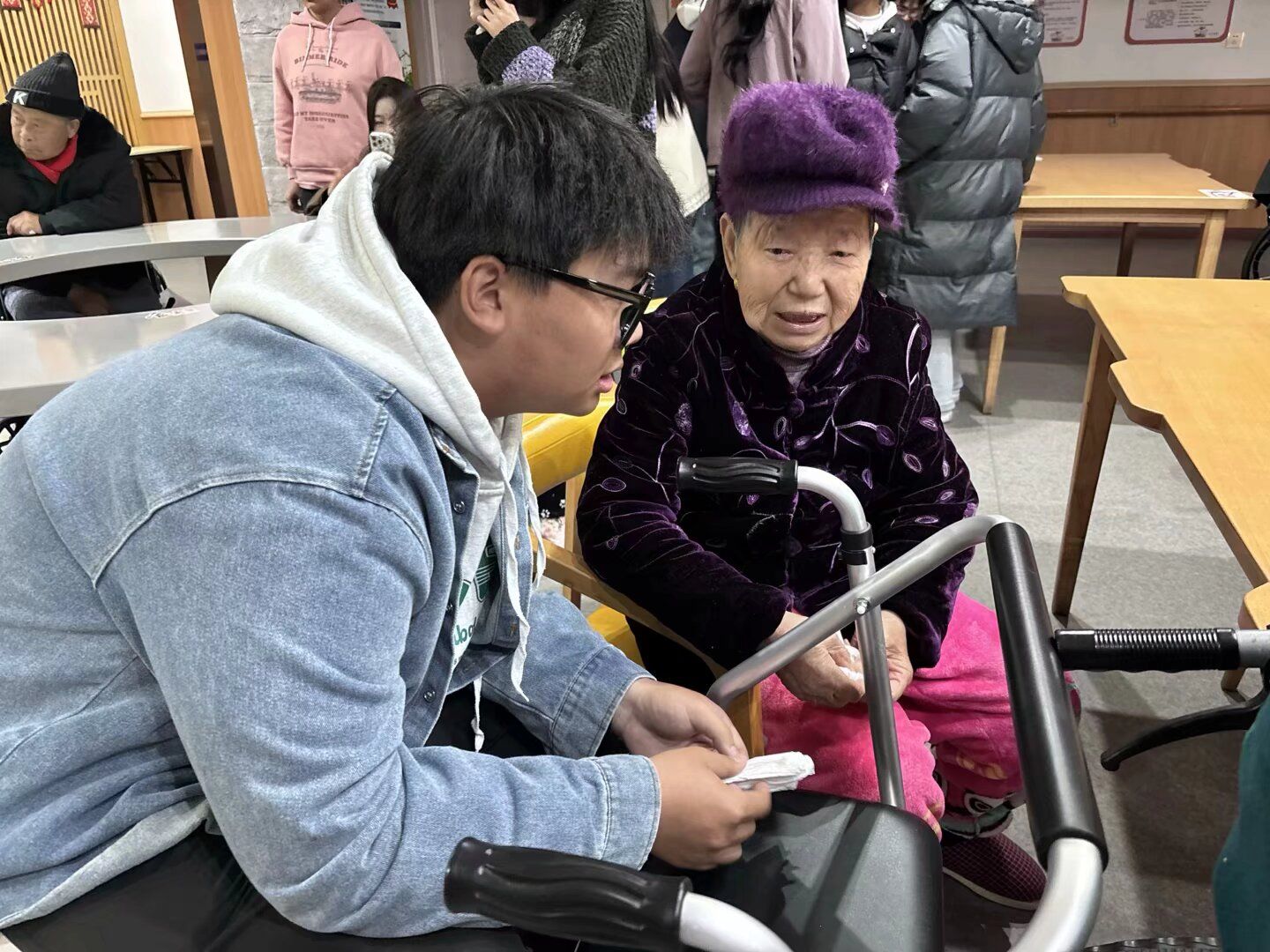 表演结束后,志愿者们分成小组,陪老人们聊天。他们围坐在老人身边,耐心倾听老人们讲述过去的故事,分享生活中的点滴。有的老人回忆起年轻时的奋斗岁月,感慨万千;有的则聊起家庭琐事,充满温情。志愿者们认真聆听,不时提问,与老人们积极互动。在交流过程中,志愿者们还注意到,许多老人虽然对数字产品充满好奇,但由于缺乏相关知识和技能,在使用时遇到了不少困难。