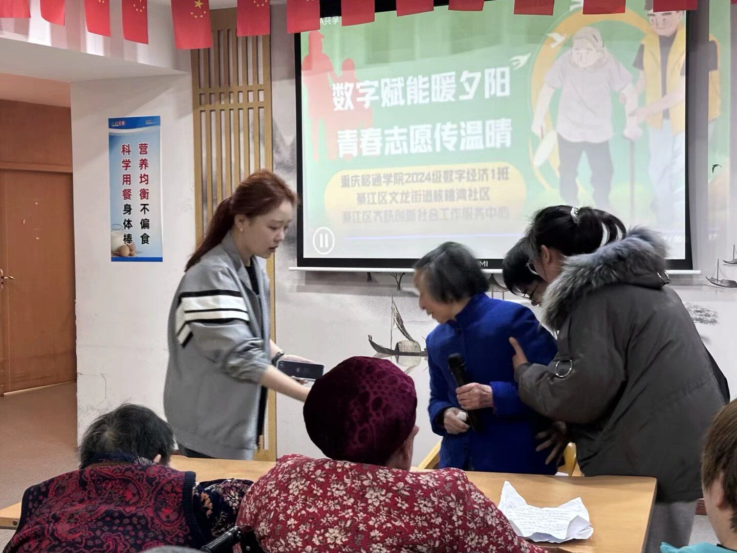 为积极响应传承雷锋精神的号召,2025年3月24日,重庆移通学院数字经济与信息管理学院2024级数字经济1班同学走进綦江区乐老康养文龙街道养老服务中心,通过“文艺润心+数字赋能+反诈护航”三维服务体系,为老人送去春日温暖。本次活动旨在运用数字技术帮助老年人跨越数字鸿沟,以陪伴给予他们心灵慰藉,同时增强老年人的反诈意识,弘扬中华民族尊老、敬老、爱老的传统美德。
