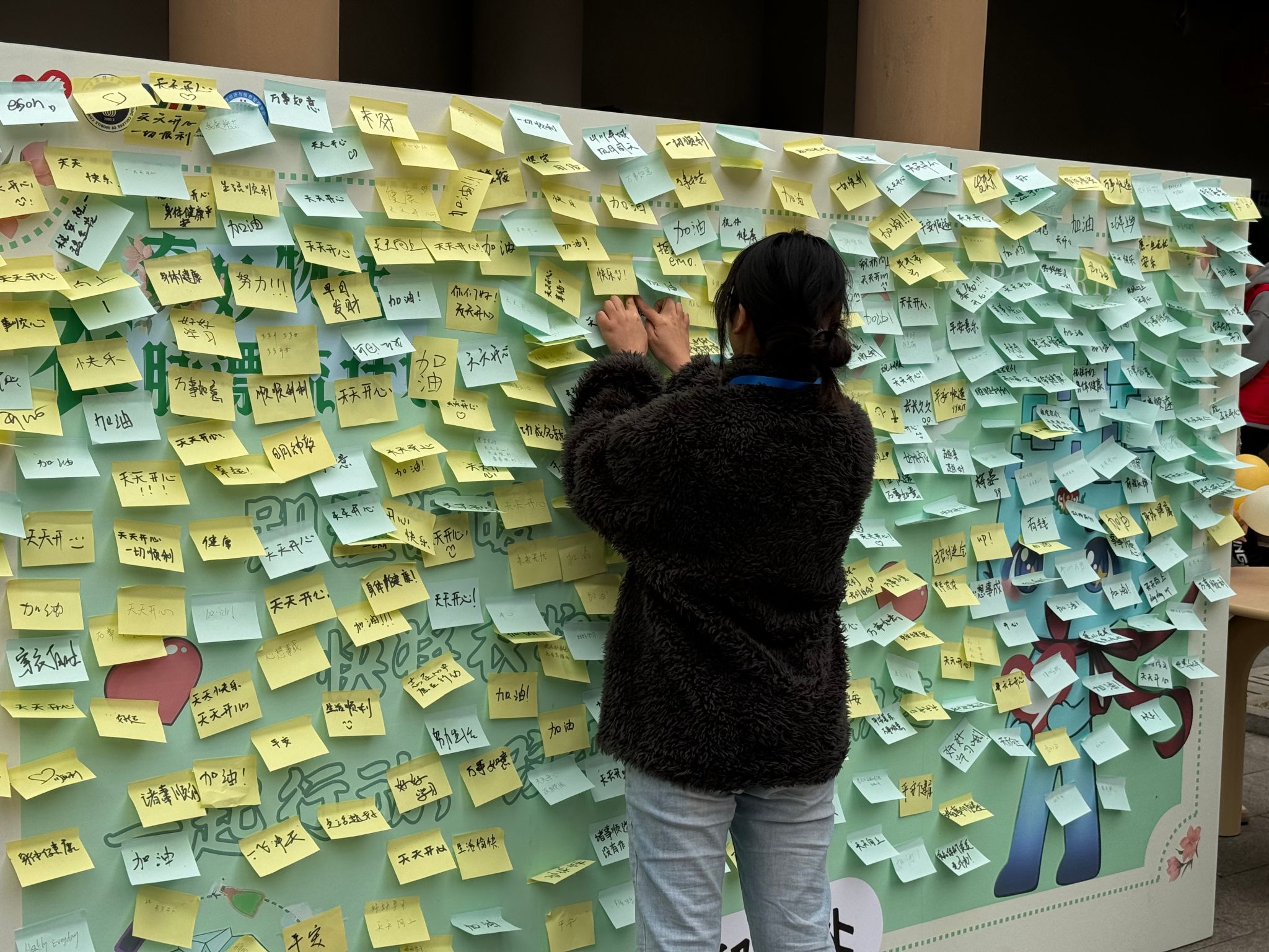 除了捐赠和宣传环节,“爱心留言墙”成为了活动现场一道温暖而独特的风景线。在捐赠完衣物后,同学们来到留言墙,拿起桌子上的笔,在便利贴上写下对受助者的真挚祝福与温暖寄语。“愿这些衣物能为你们带来温暖”“希望你们的生活越来越好” “祝你们天天开心”……这一句句话语,饱含着同学们满满的善意。在后续工作中,志愿者将这些留言拍照留存,并同步分享至社交媒体,让这份爱心跨越地域界限,传递至更广阔的天地,触动更多人的心灵。