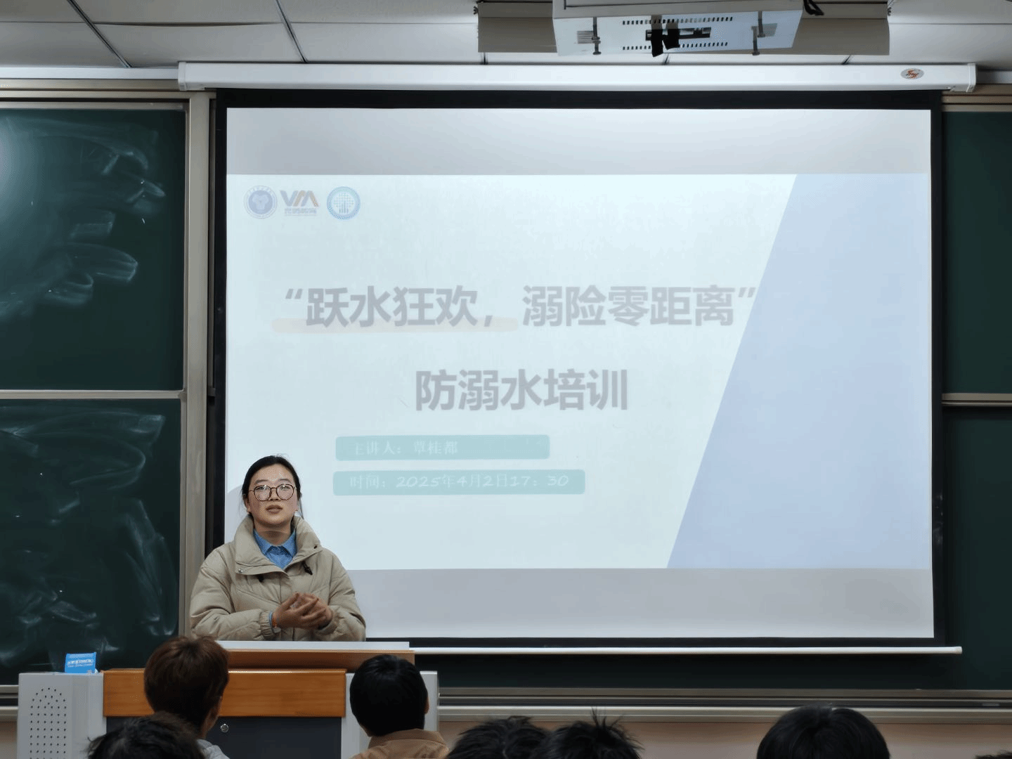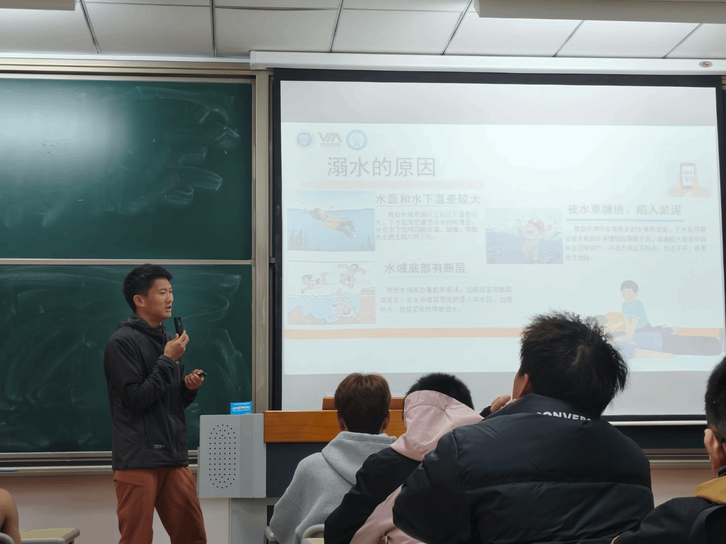 随着天气逐渐升温且有意愿下水的学生数量增加,为保障学生做到安全下水,需增强同学们的防溺水意识。2025年4月2日数字经济与信息管理学院体育协会指导老师付孟文于仁者楼307教室和游泳馆组织进行“跃水狂欢,溺险零距离”游泳比赛赛前防溺水培训,本次培训特别邀请到竞技体育中心竞赛部铁人三项队教练覃桂都老师为同学们讲解关于溺水的各种救援方法。