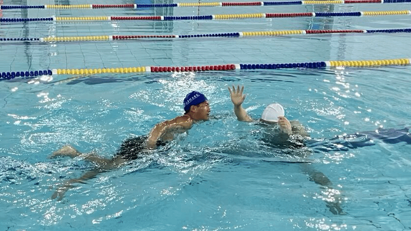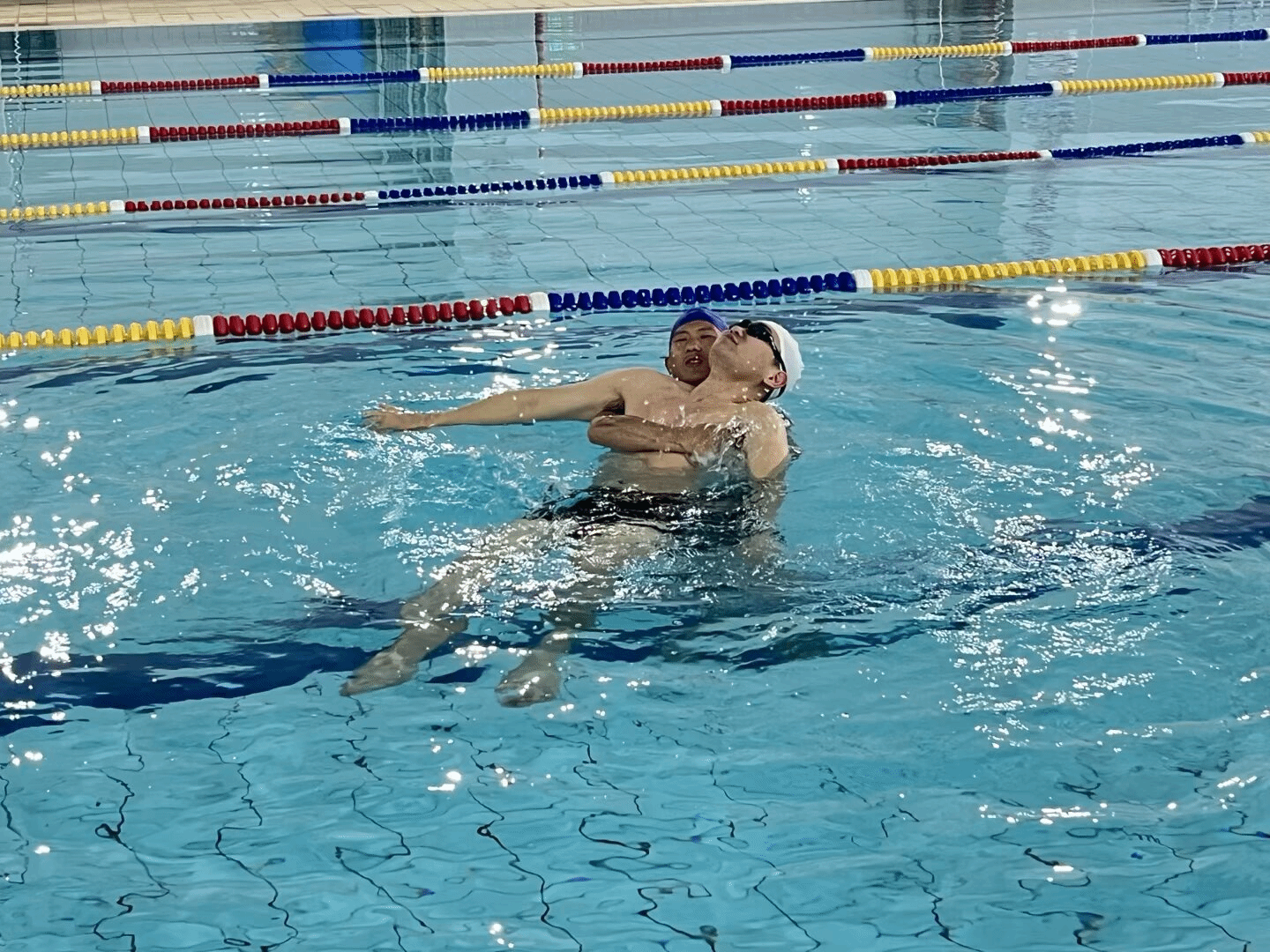 在观看完防溺水短片后,同学们转战游泳馆,进行“模拟溺水救援”。覃教练强调救援者应避免盲目下水。如果溺水者距离岸边较近,可以使用长杆、绳子或救生圈等工具进行救援。如果必须下水救援,应确保自己具备足够的游泳和救生技能,并尽可能从溺水者的背后或侧面接近,以防被溺水者紧紧抱住。接着亲自示范标准救援姿势,只见覃教练迅速游到溺水者后方,用左手从其左臂和上半身中间握住溺水者的右手,将溺水者带回岸边。上岸后还细致演示呼吸技巧,学员们聚精会神观摩,随后亲身实践,在水中摸索、尝试,不断纠正中逐渐掌握了溺水救援的方法。参与者表示,这样的培训和示范是很新颖的,希望之后能多举办类似这样的安全知识宣传活动。