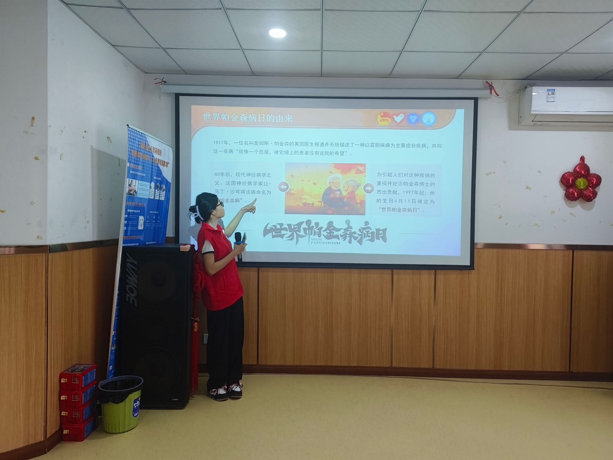 活动开始,主讲人李家茵向老人们介绍了帕金森病的症状表现,包括手部震颤、肢体僵硬、行动迟缓等典型特征,随后,她分享了日常预防措施,如合理膳食和适度运动,并科普了科学有效的治疗方法。通过系统的讲解,帮助老人们全面认识了帕金森病。为了强化老人们的理解和记忆,志愿者还设计了一些简单易懂的问题,涵盖帕金森病早期信号识别、日常防范要点等内容。在一问一答间,老人们能够切实掌握并运用帕金森病的生活常识,这也为他们的健康生活筑牢坚实防线。