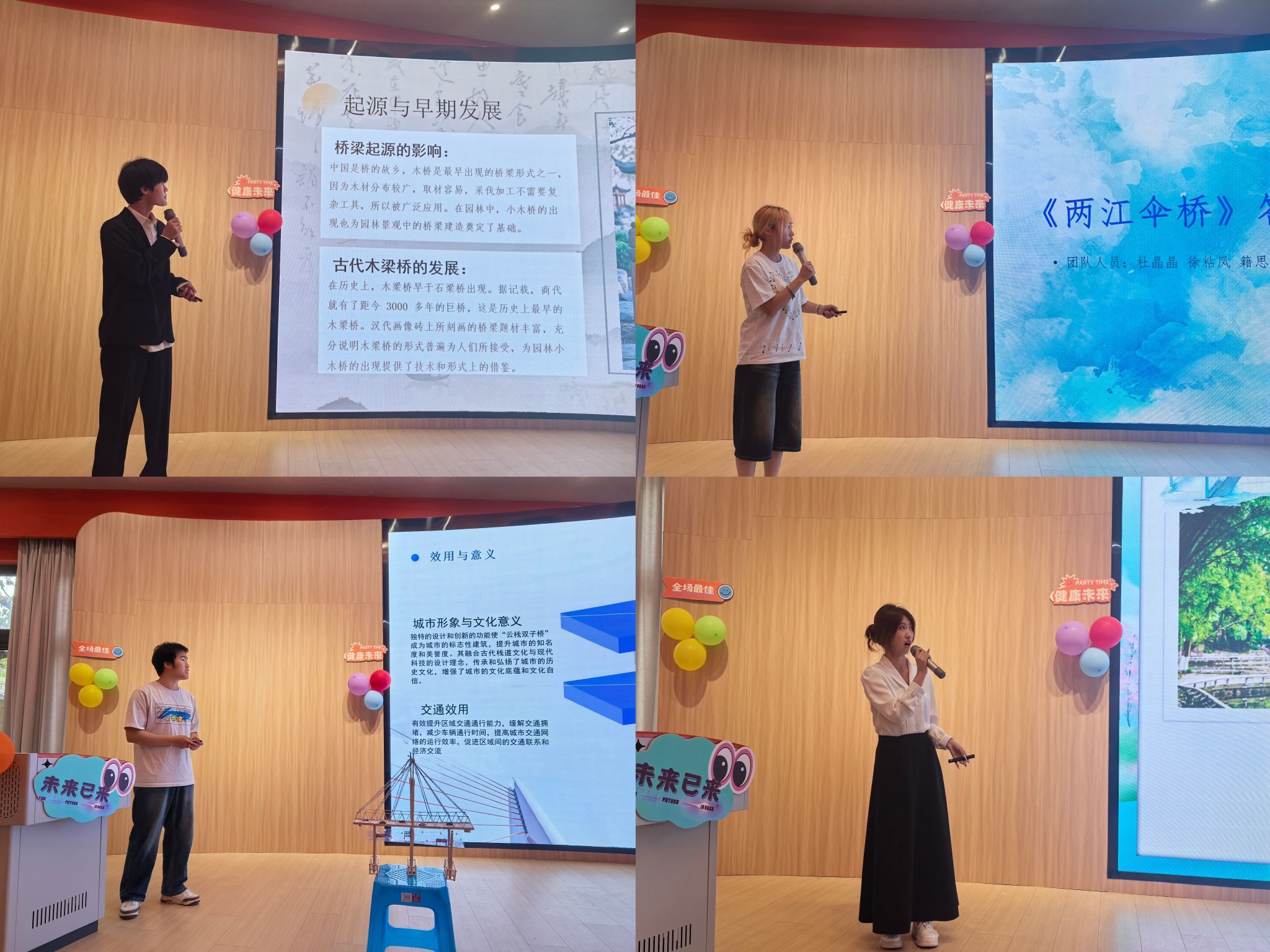 在答辩现场,参赛选手们精神抖擞、神采奕奕,以自信从容的姿态进行陈述。各团队借助精心制作的PPT、直观形象的模型等多元展示手段,将各自独特的设计理念娓娓道来。有的团队着眼于桥梁与自然环境的和谐共融,以精妙构思让桥梁与周边景致相得益彰,仿佛桥梁本就是自然的一部分;有的团队着重强调桥梁的稳固基石与耐久特质,从结构设计的每一个细节入手,确保桥梁能够经受住时间的考验,为安全出行保驾护航;还有的团队大胆追求智能化创新,将当下前沿的科技元素巧妙融入桥梁设计之中,为传统桥梁赋予了新的活力与智慧。在阐述过程中,选手们不仅对作品的整体亮点进行了概括性介绍,更围绕实用性、创新性、安全性等核心维度展开了深入细致的说明。他们紧密结合现实需求,对桥梁的通行效率、抗震能力、长期维护成本等关键指标进行了全方位考量。从交通流量的科学预测,到抗震设计的前沿技术应用,再到维护成本的经济性分析,每一个环节都展现出选手们深厚的专业素养和扎实的实践能力。